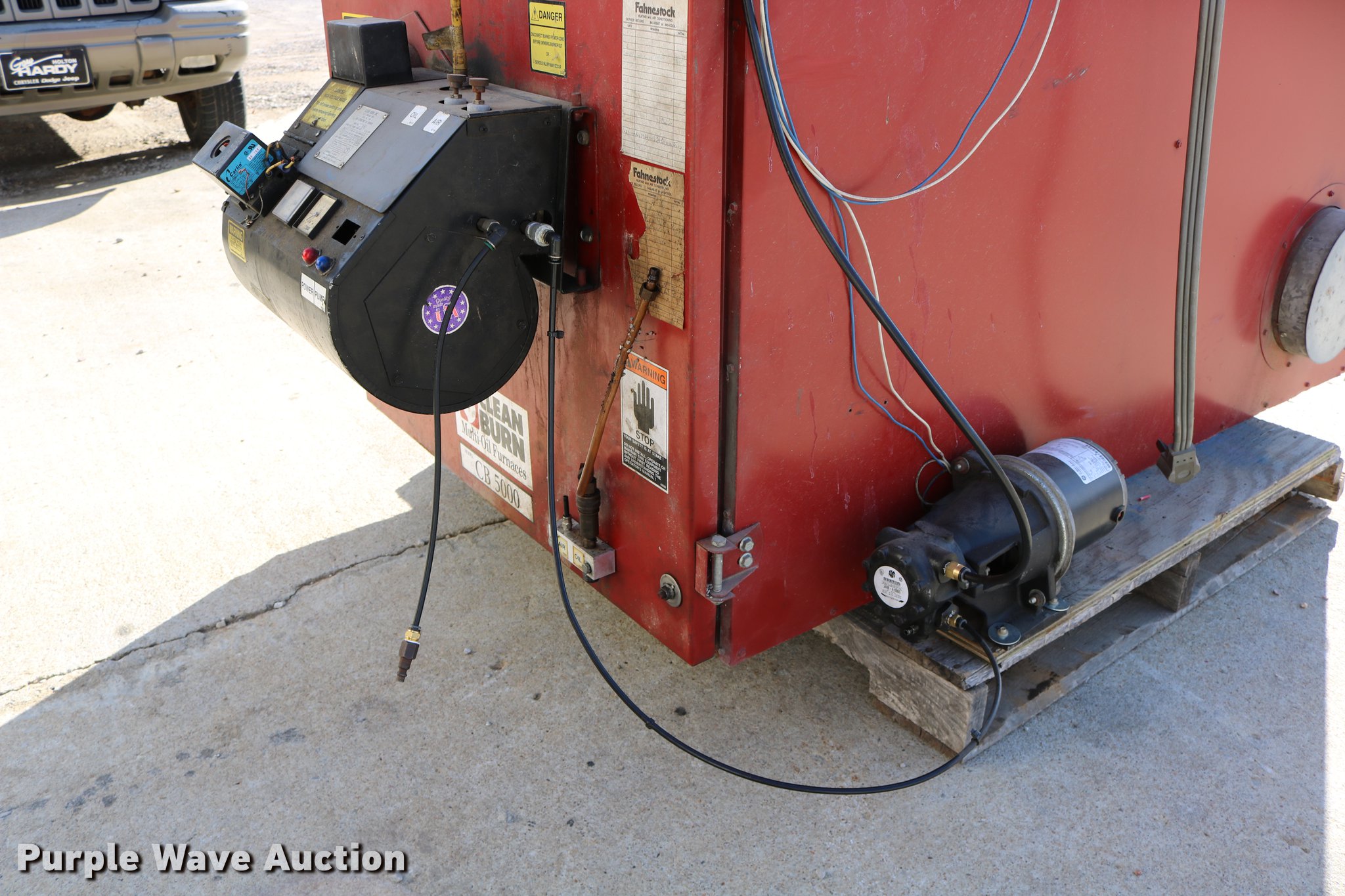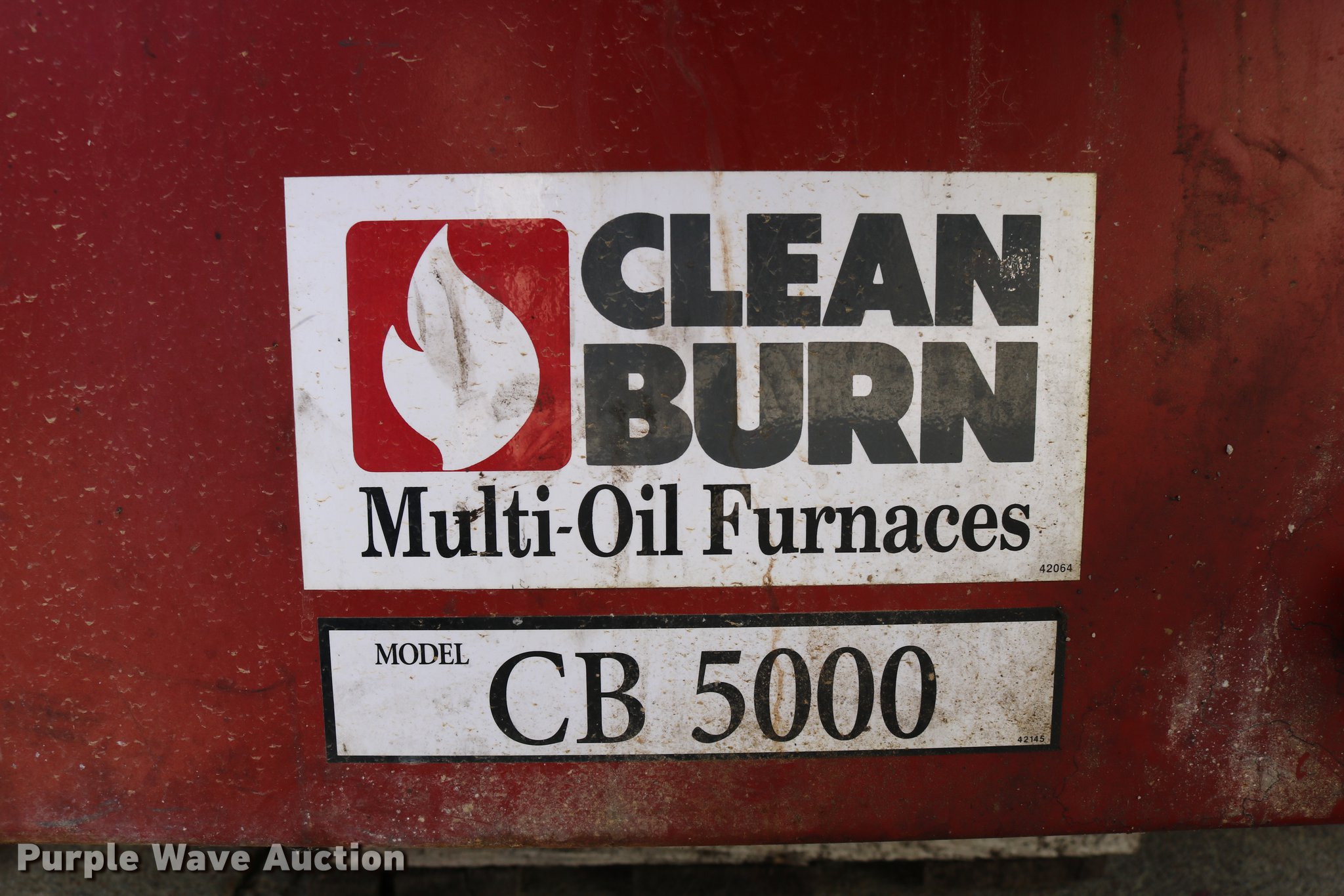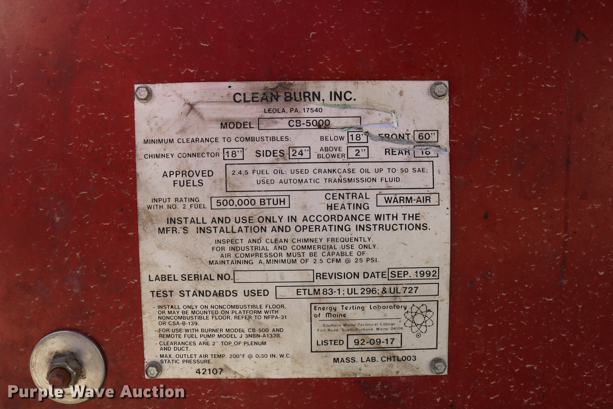 Purple Wave is selling a used Tools in Kansas. This item is a Clean Burn CB-5000 oil furnace with the following: Leeson electric fan motor, 2 HP, 500,000 BTU per hour capacity with No. 2 fuel, 220V, 7' x 44" x 77.5", Serial 115