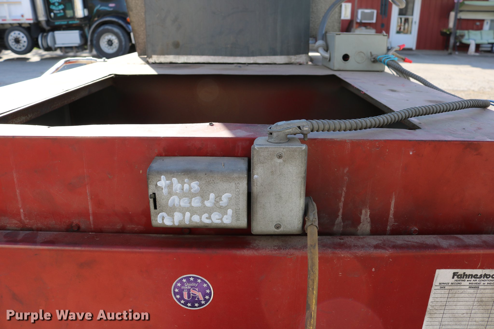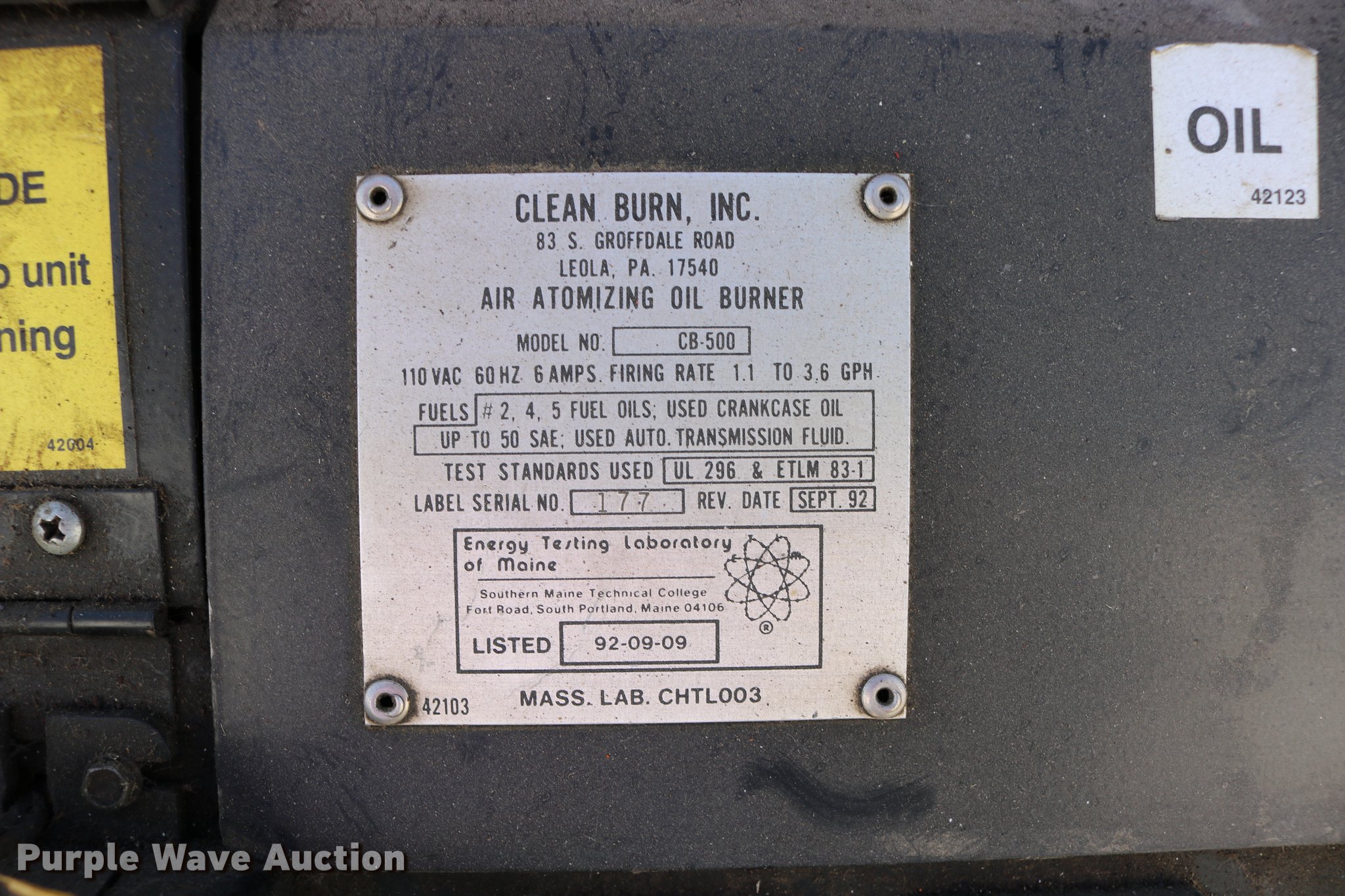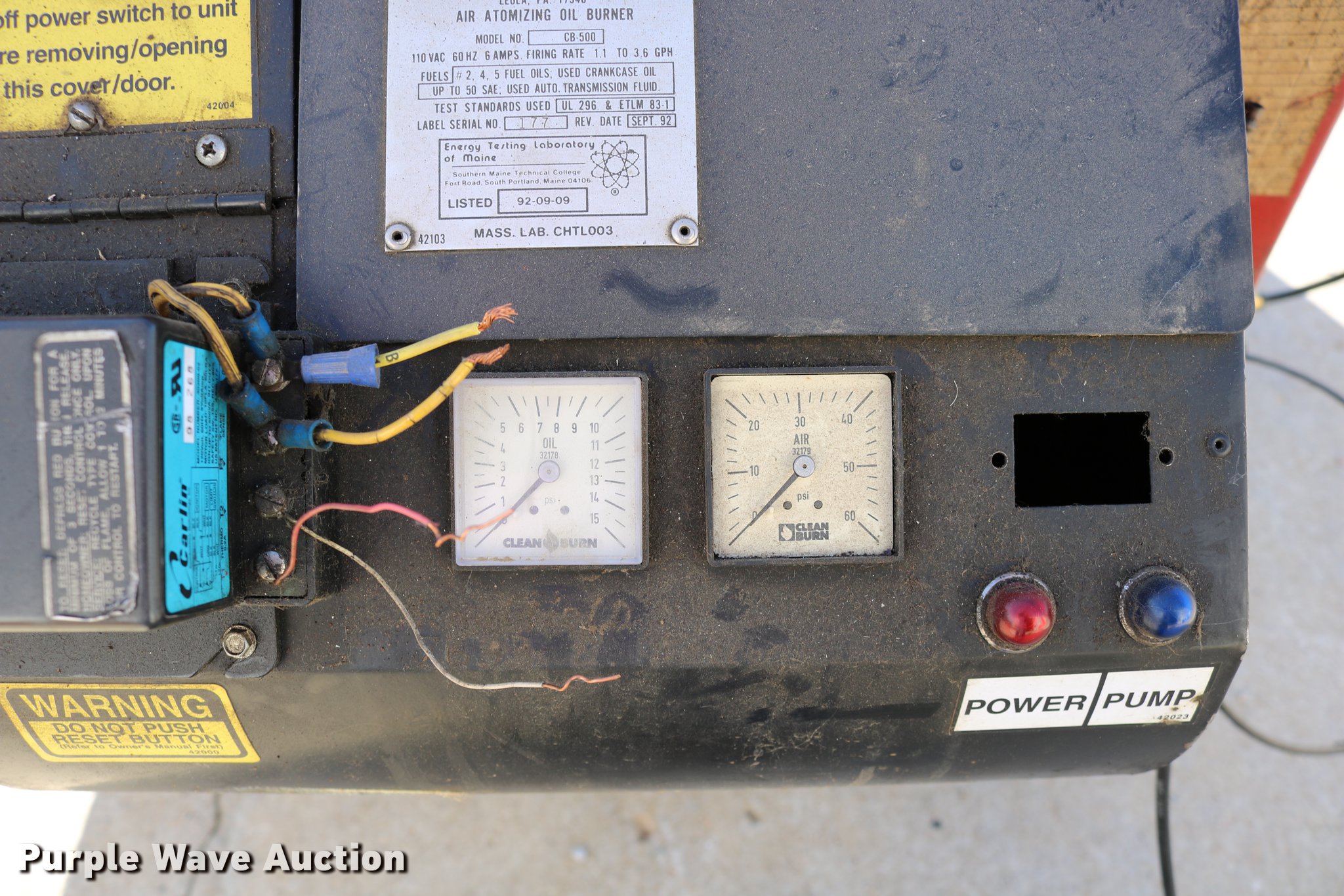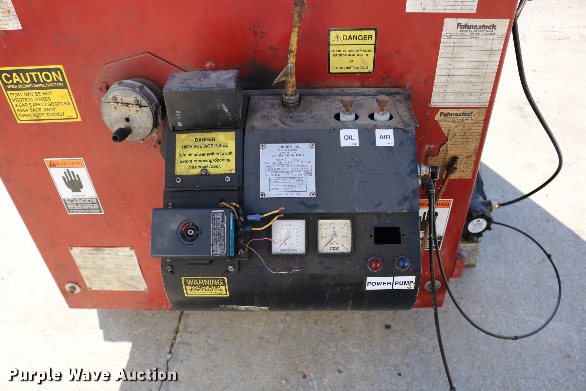 Purple Wave is selling a used Tools in Kansas. This item is a Clean Burn CB-5000 oil furnace with the following: Leeson electric fan motor, 2 HP, 500,000 BTU per hour capacity with No. 2 fuel, 220V, 7' x 44" x 77.5", Serial 115