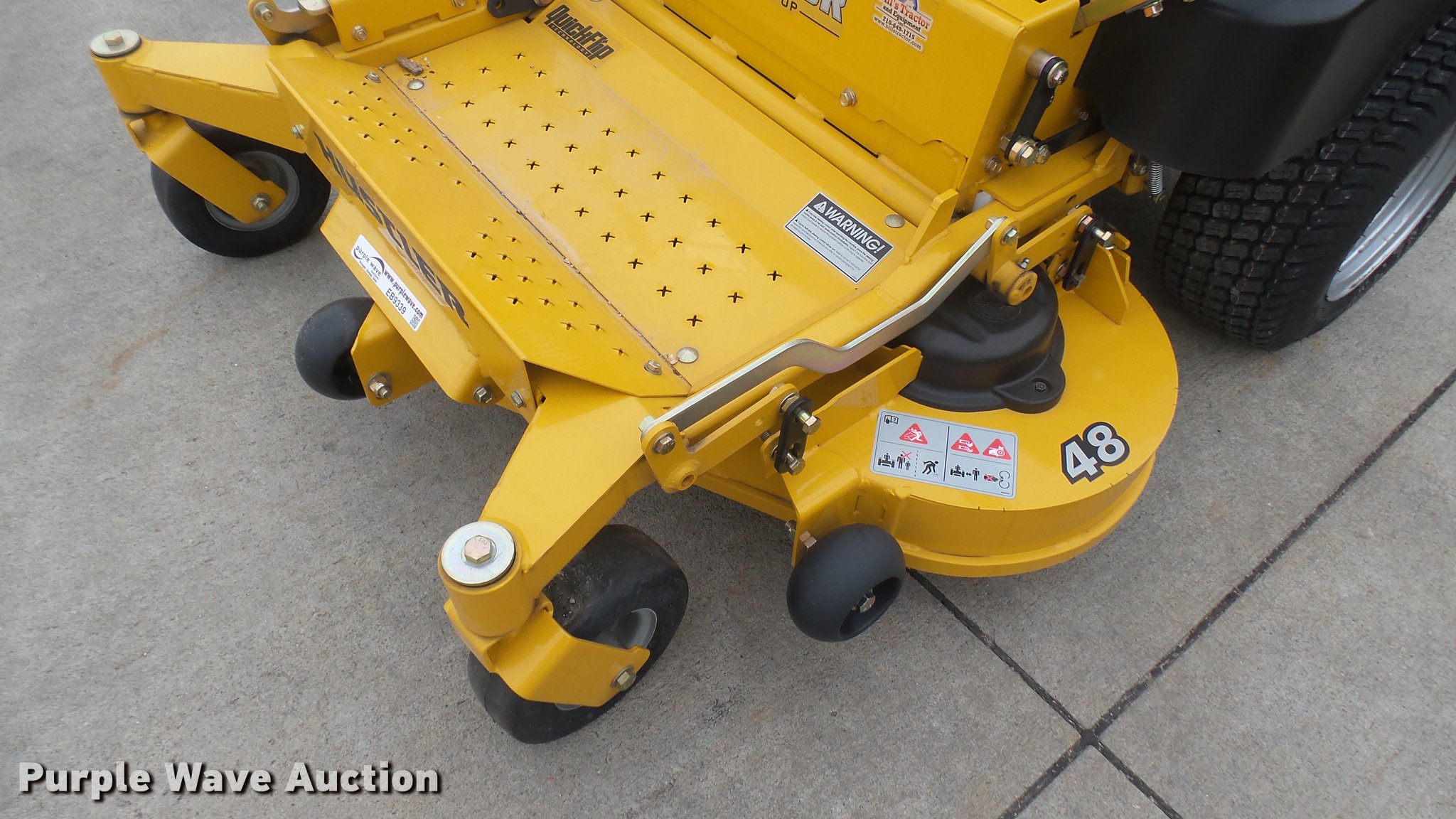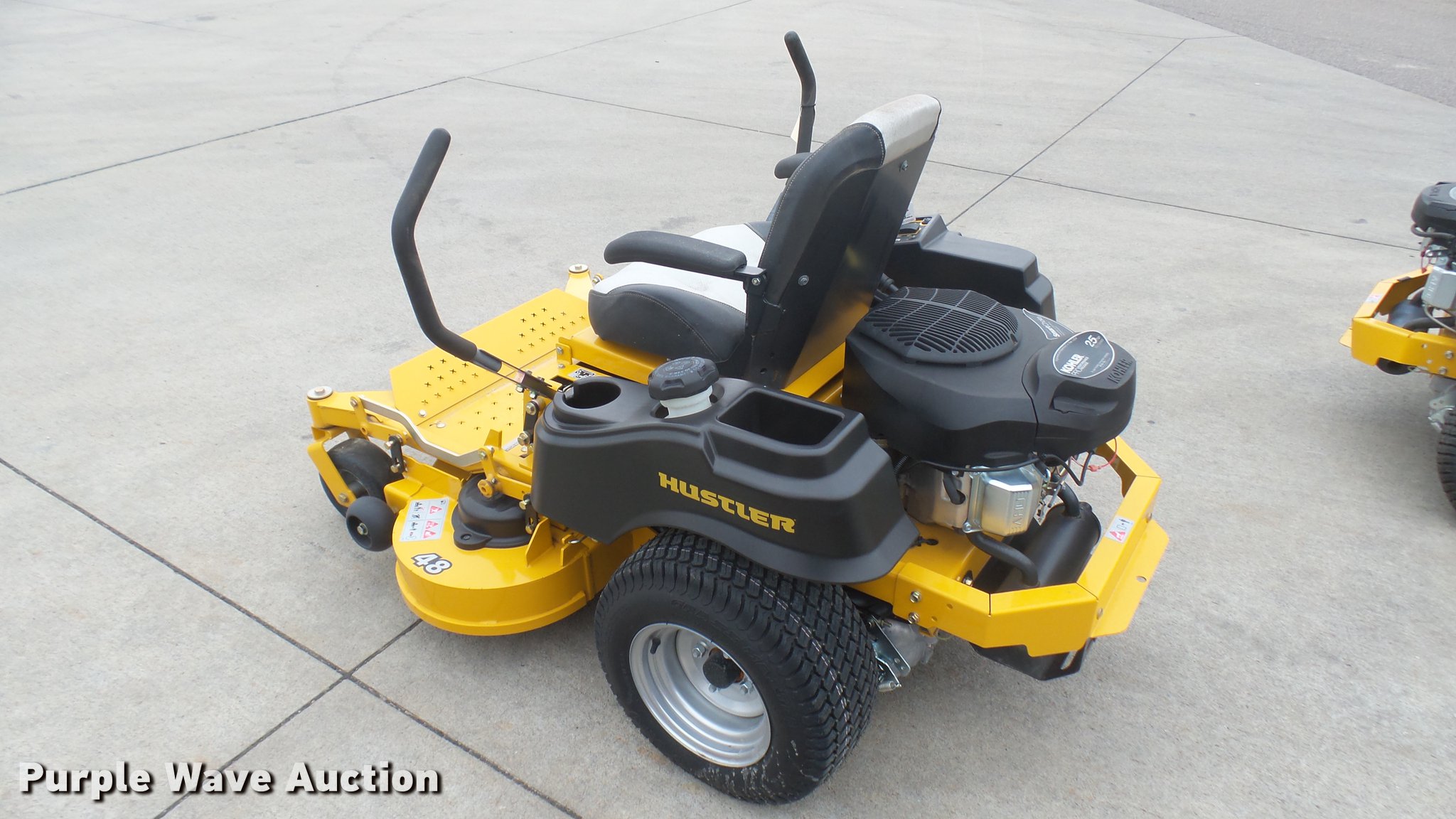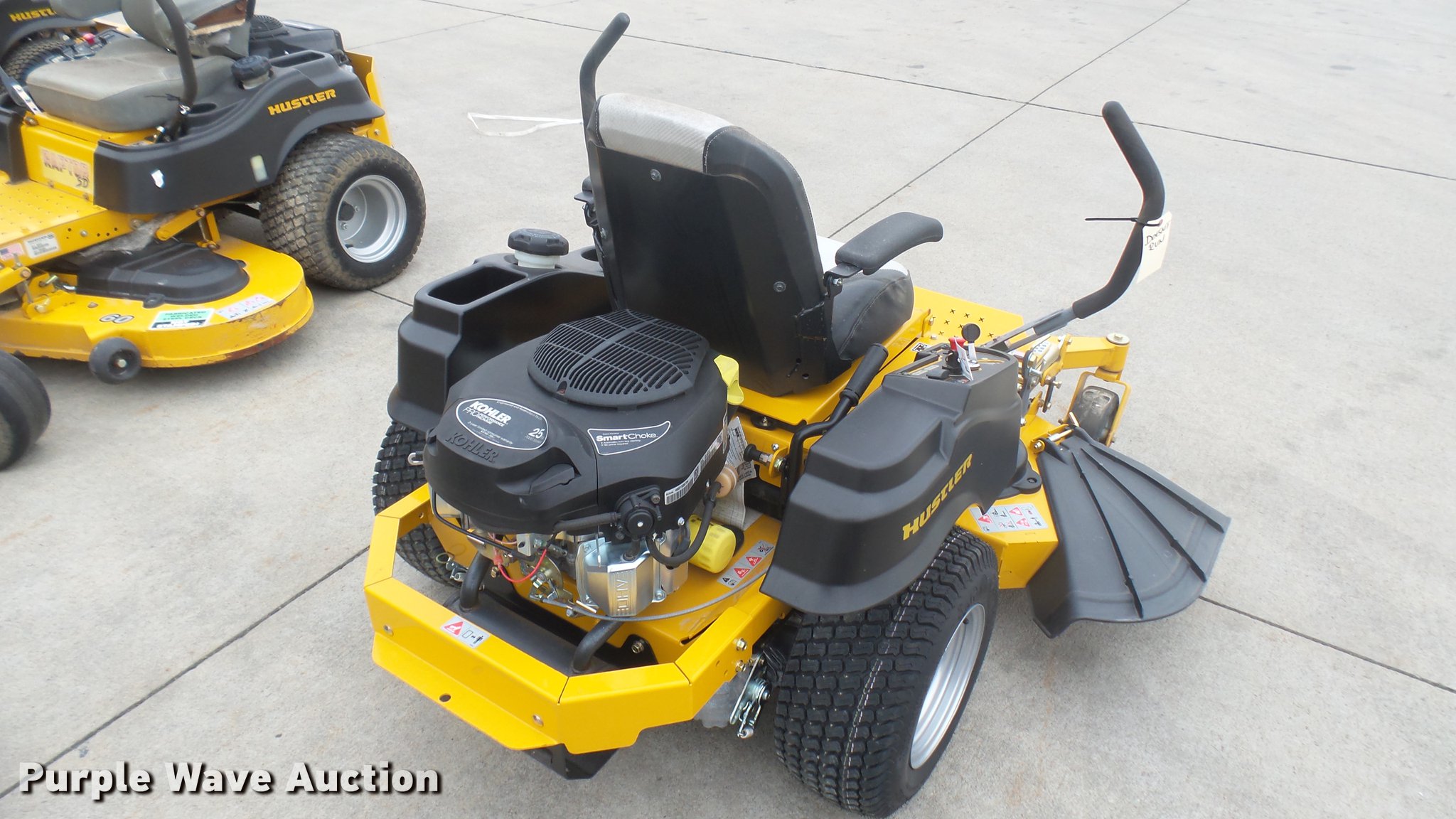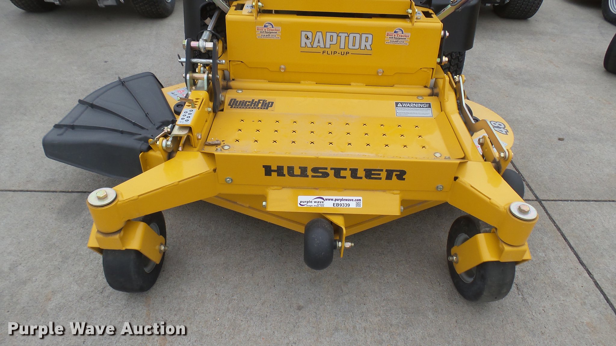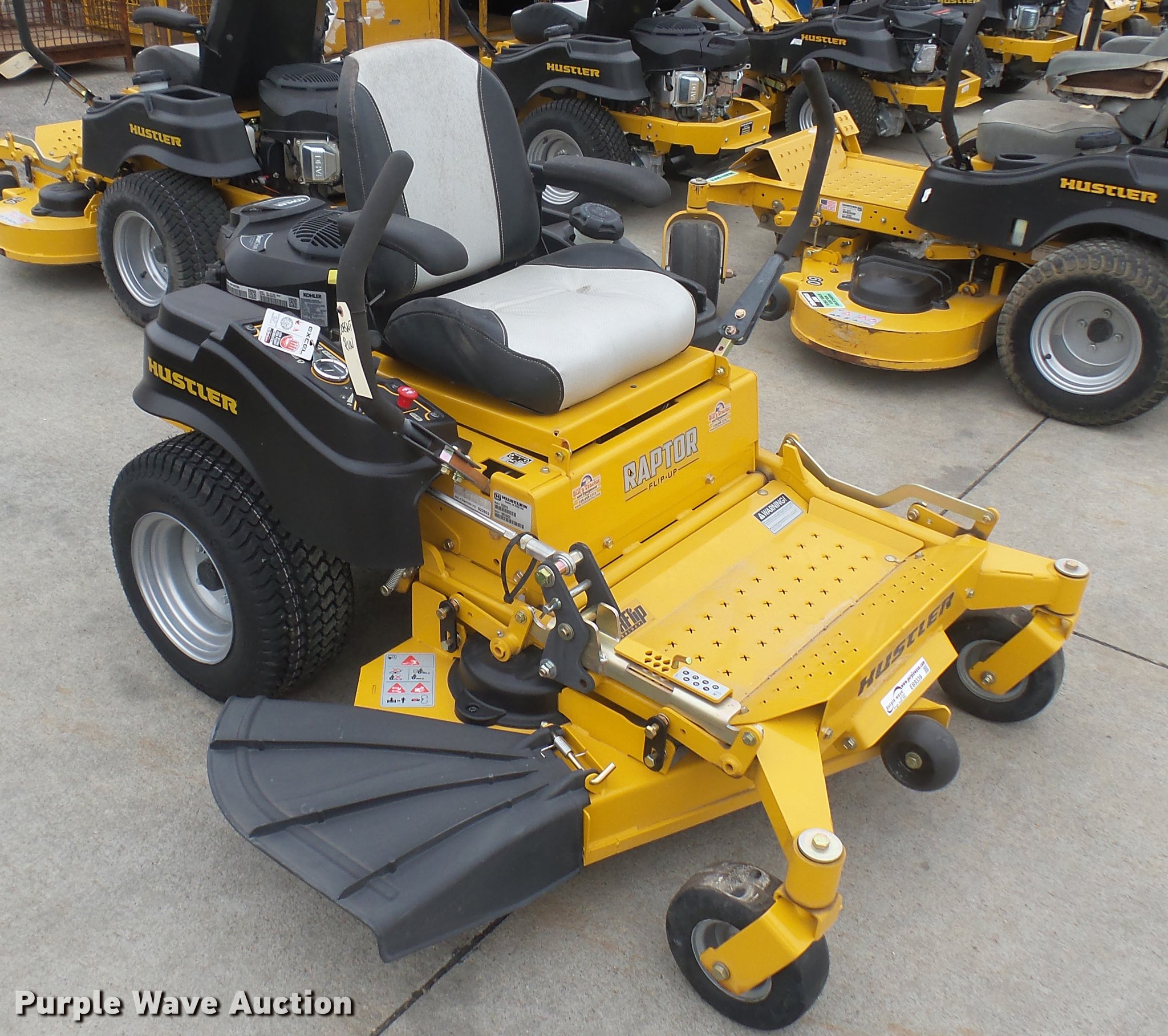 Purple Wave is selling a used Lawn Mower in Kansas. This item is a Hustler Raptor Flip-Up ZTR lawn mower with the following: 4 hours on meter, Model 933614, 48" cut, Kohler 25 HP gas engine, 20x8x10 front tires, 9x3.5x2.25 rear tires, Carburetor issues, Non-operational unit, Serial 1601A433