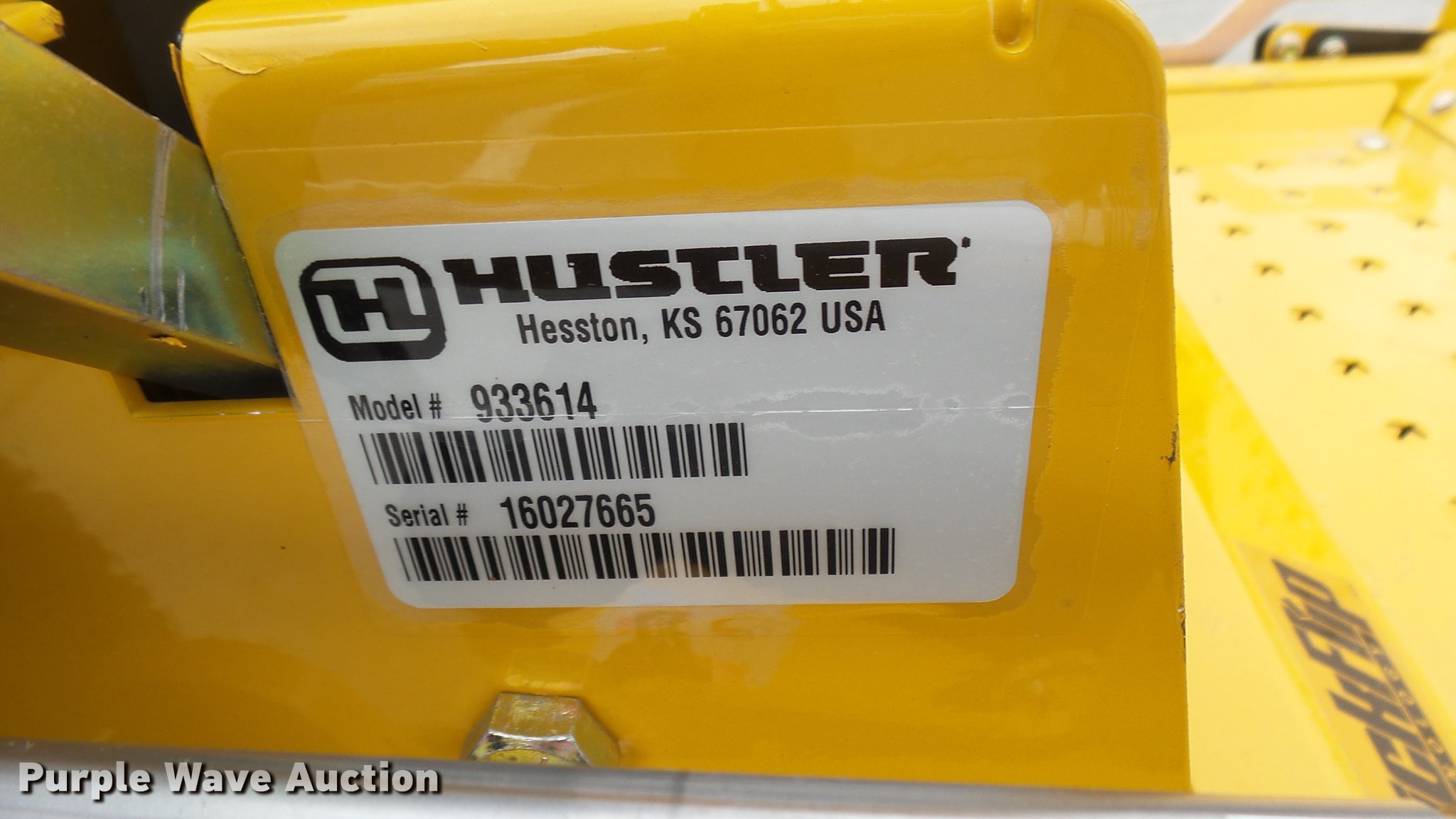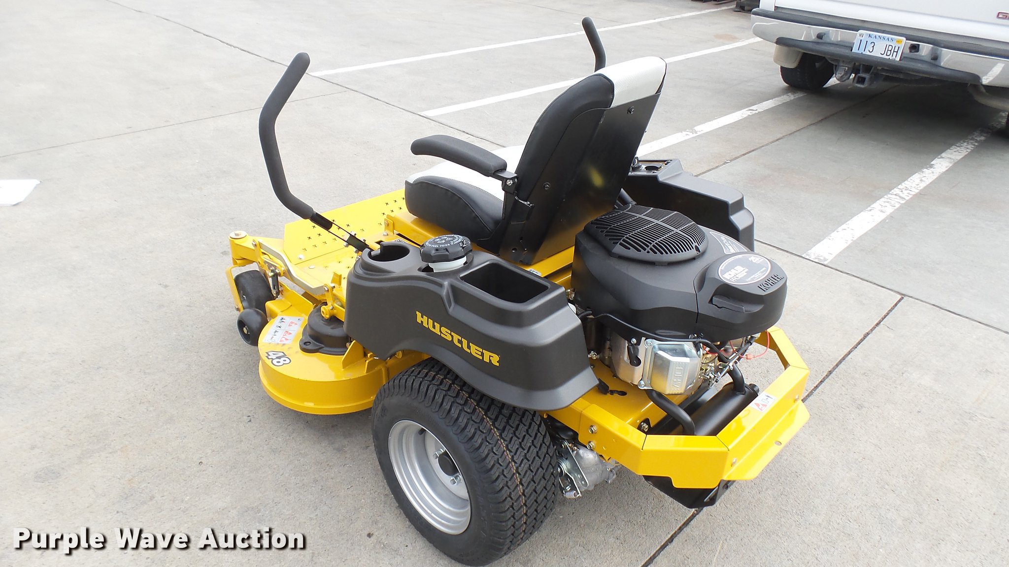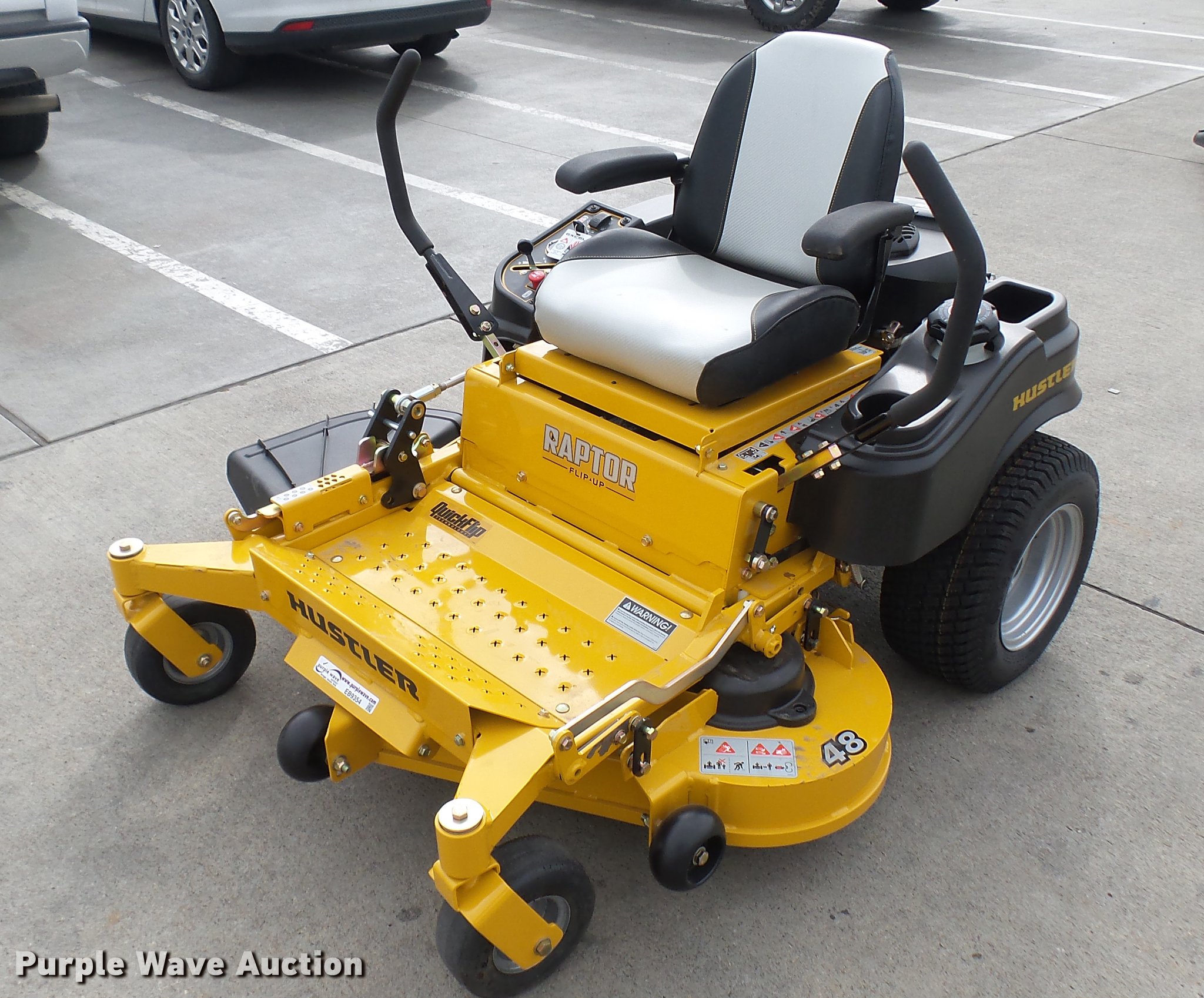 Purple Wave is selling a used Lawn Mower in Kansas. This item is a Hustler Raptor Flip-Up ZTR lawn mower with the following: 1 hours on meter, Model 933614, 48" cut, Kohler 25 HP gas engine, 20x8x10 front tires, 9x3.5x2.25 rear tires, Paint issues, Serial 16027665