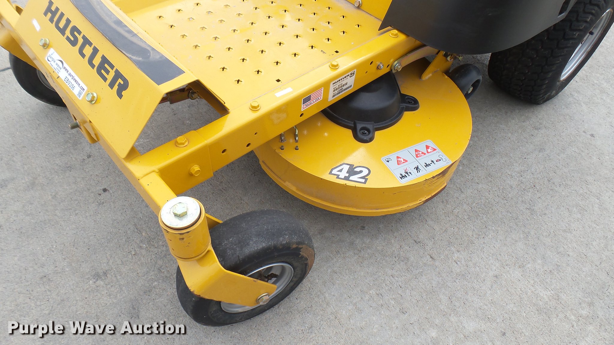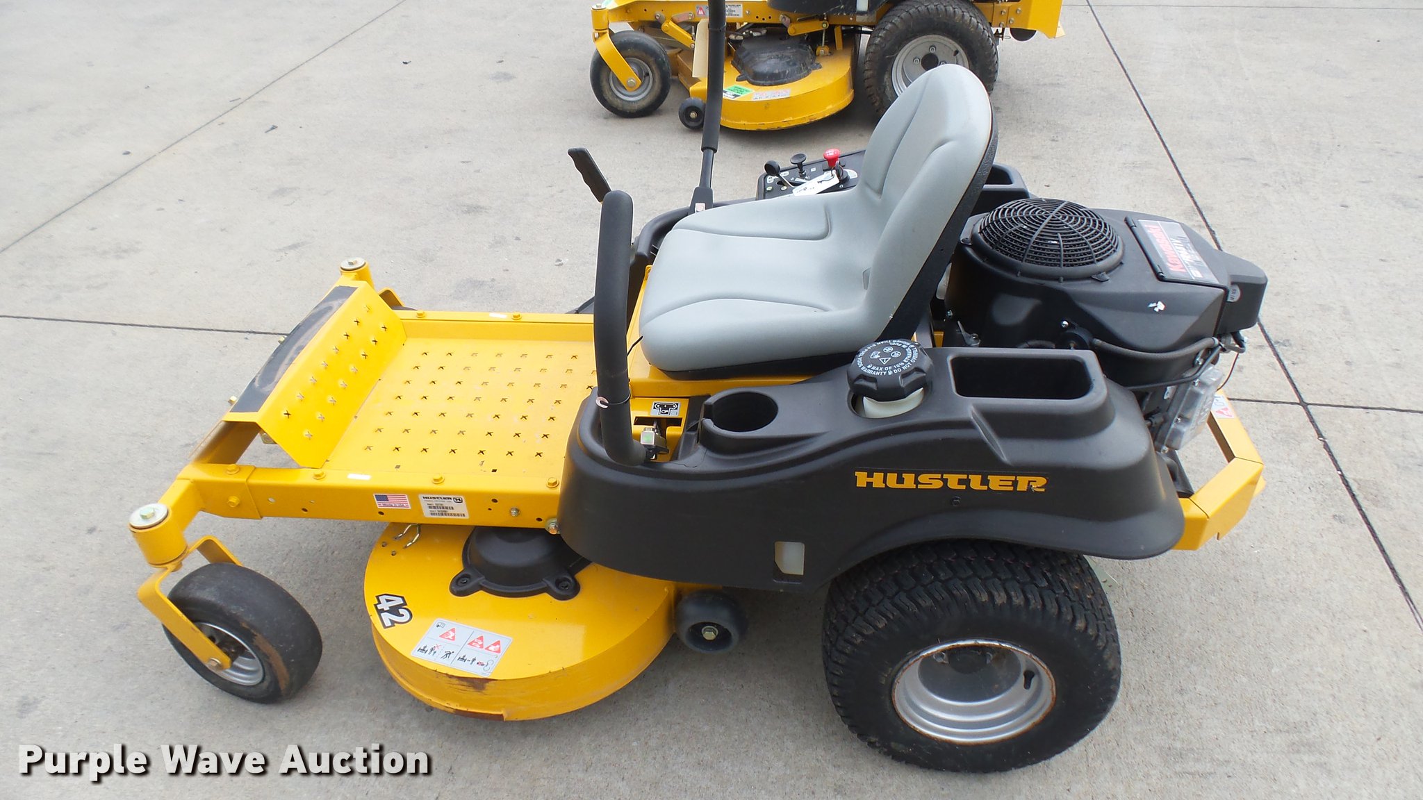 Purple Wave is selling a used Lawn Mower in Kansas. This item is a Hustler Raptor ZTR lawn mower with the following: Model 931741, 42" cut, Kawasaki 21.5 HP gas engine, 18x8.5x8 front tires, 11x4x5 rear tires, Starting issues, Left fender cracked, Serial 14124091