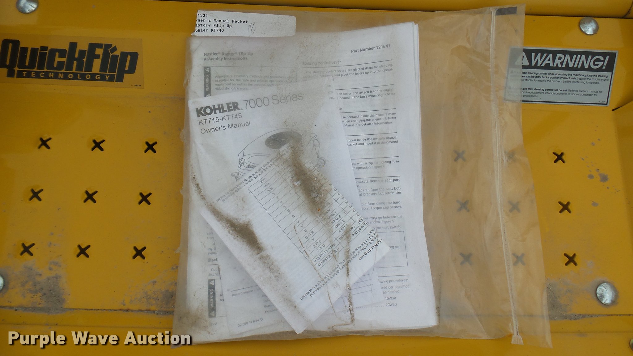 Purple Wave is selling a used Lawn Mower in Kansas. This item is a Hustler Raptor Flip-Up ZTR lawn mower with the following: 29 hours on meter, Model 933614, 48" cut, Kohler 25 HP gas engine, 20x8x10 front tires, 9x3.5x2.25 rear tires, Carburetor issues, Mechanism issues, Non-operational unit, Serial 15120104