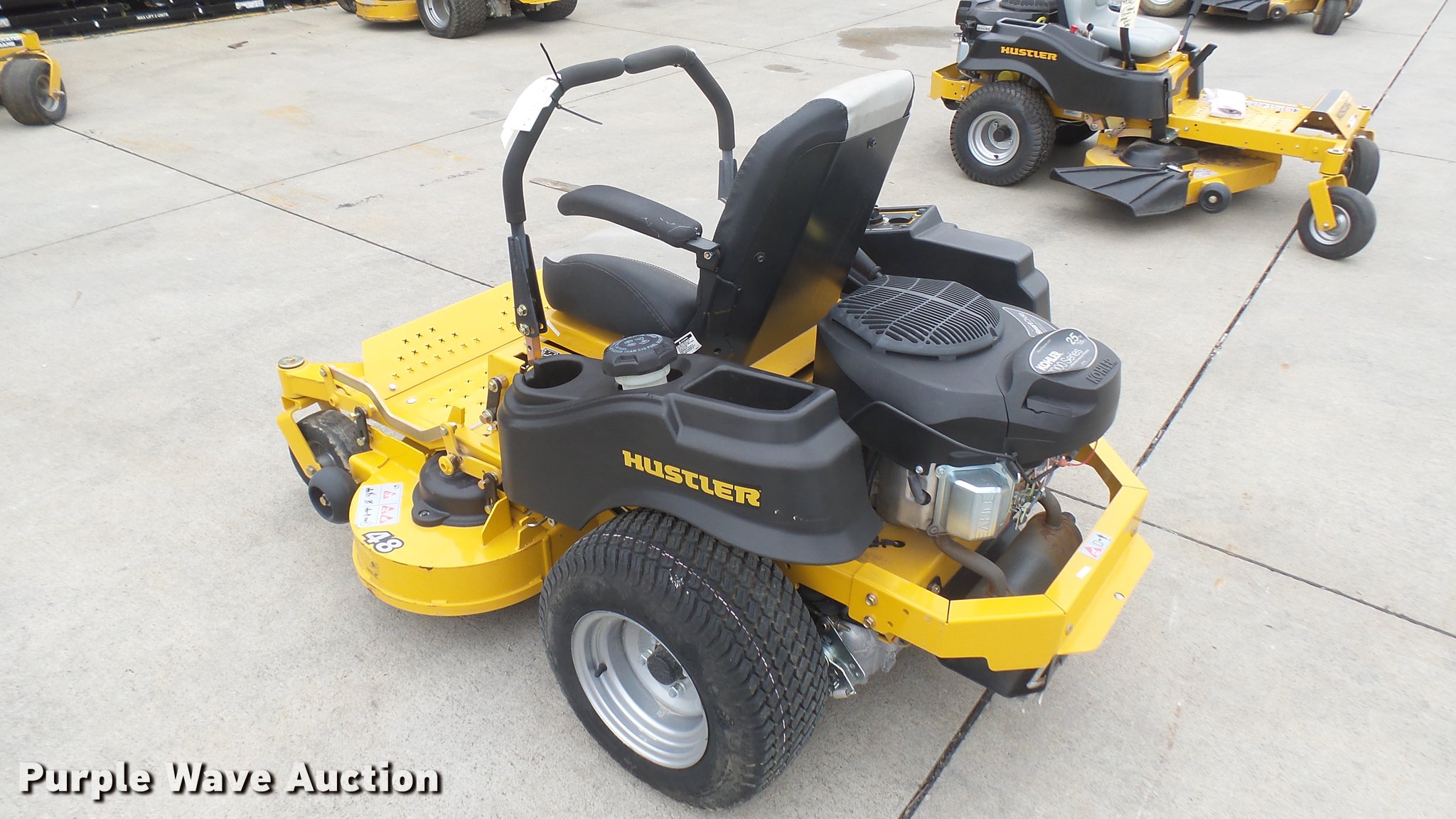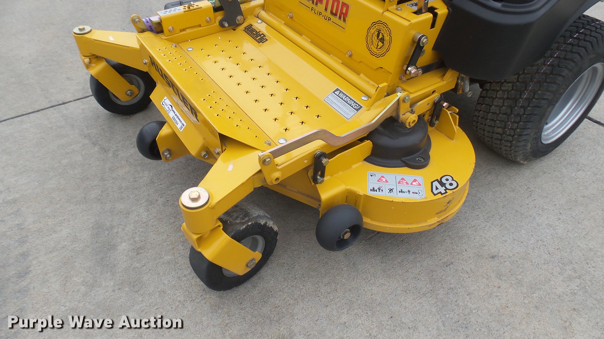 Purple Wave is selling a used Lawn Mower in Kansas. This item is a Hustler Raptor Flip-Up ZTR lawn mower with the following: 54 hours on meter, Model 933614, 48" cut, Kohler 25 HP gas engine, 20x8x10 front tires, 9x3.5x2.25 rear tires, Carburetor issues, No battery, Wiring harness needs replaced, Non-operational unit, Serial 15094195