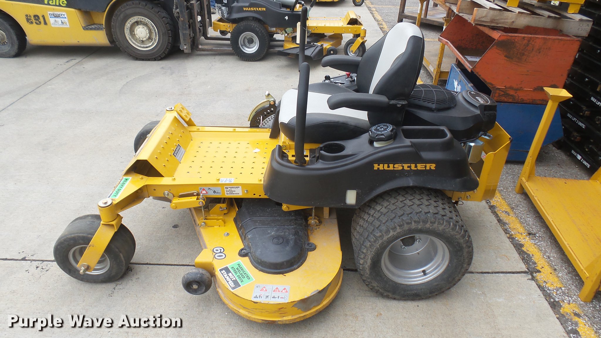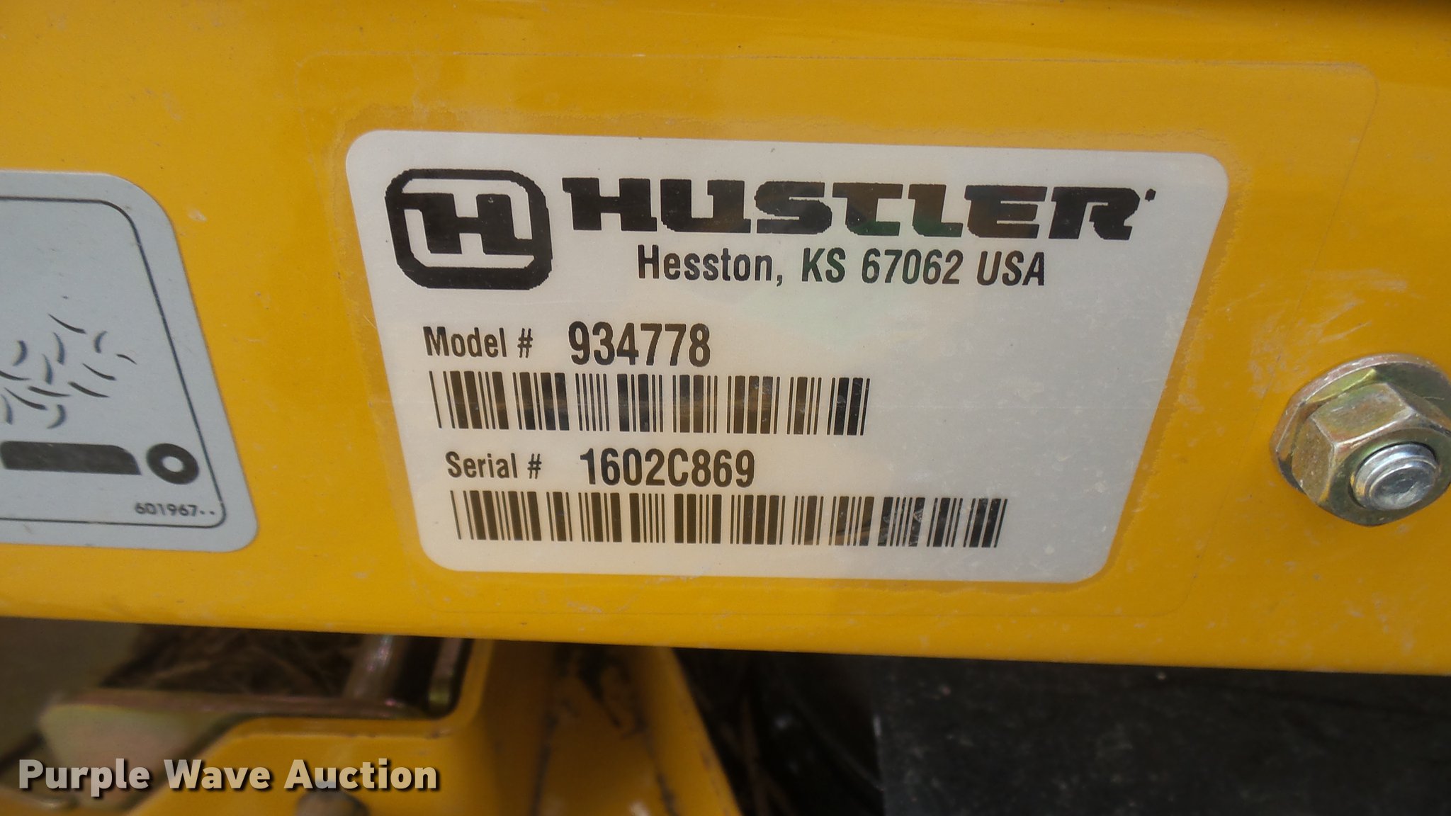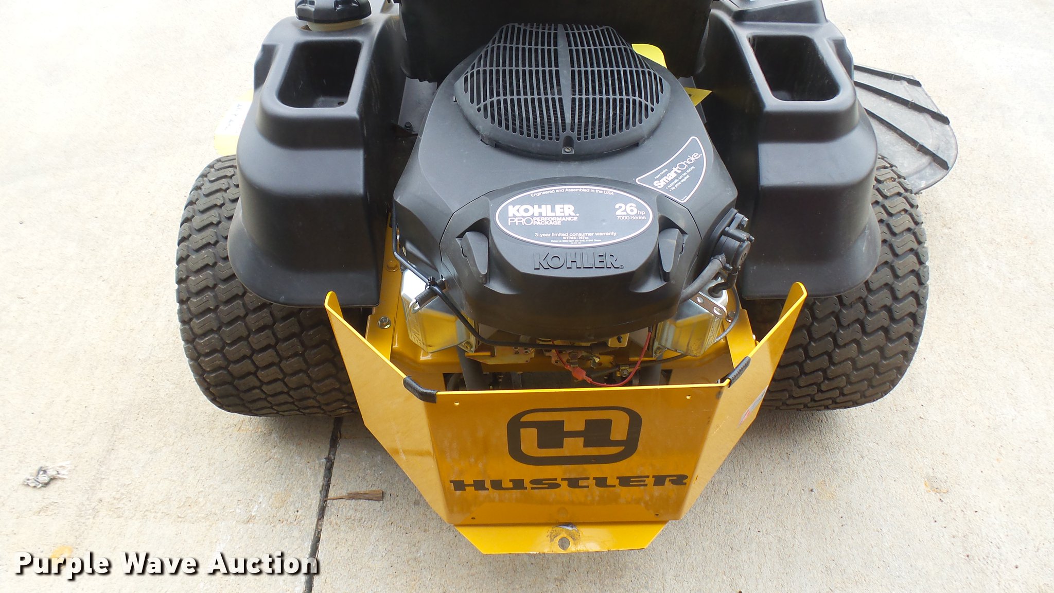 Purple Wave is selling a used Lawn Mower in Kansas. This item is a Hustler Raptor SD ZTR lawn mower with the following: 683 hours on meter, Model 934778, 60" cut, Kohler 26 HP gas engine, 20x12x10 front tires, 13x6.5x6 rear tires, Non-operational unit, Serial 1602C869