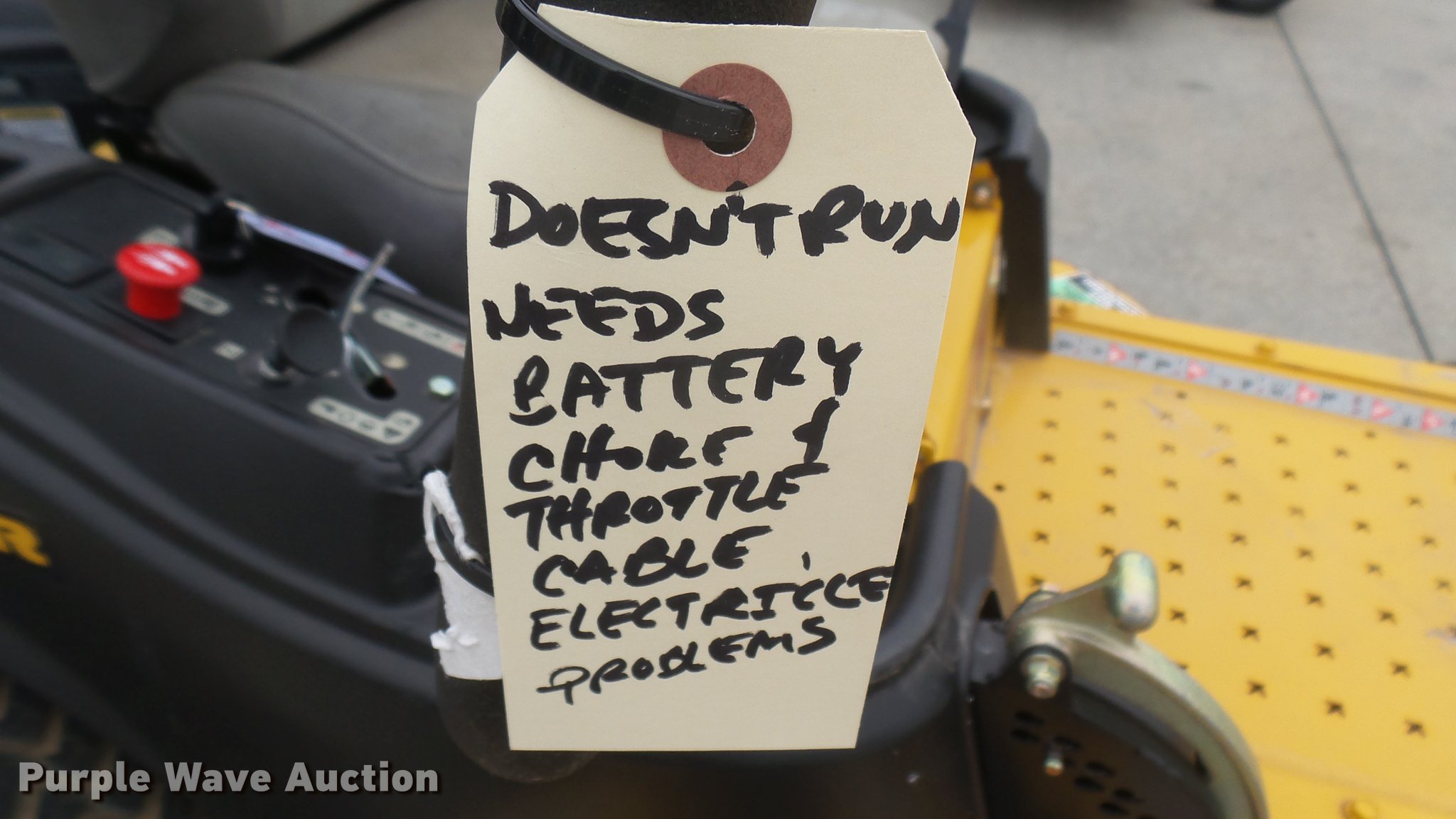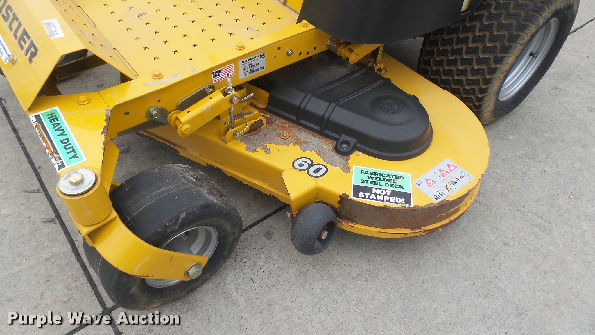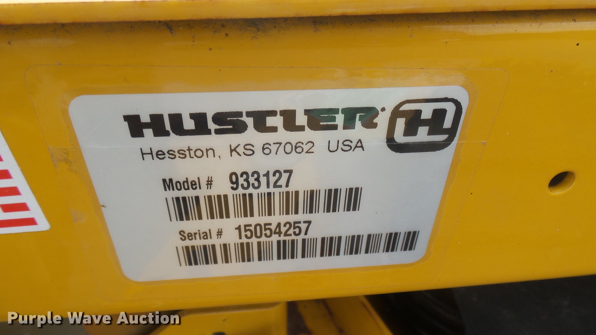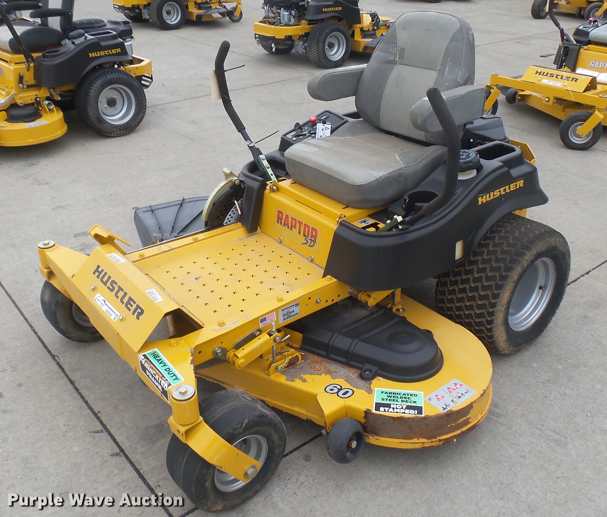 Purple Wave is selling a used Lawn Mower in Kansas. This item is a Hustler Raptor SD ZTR lawn mower with the following: Model 933127, 60" cut, Kawasaki 24 HP gas engine, 20x12x10 front tires, 13x6.5x6 rear tires, Electrical issues, Paint issues, Non-operational unit, Serial 15054257