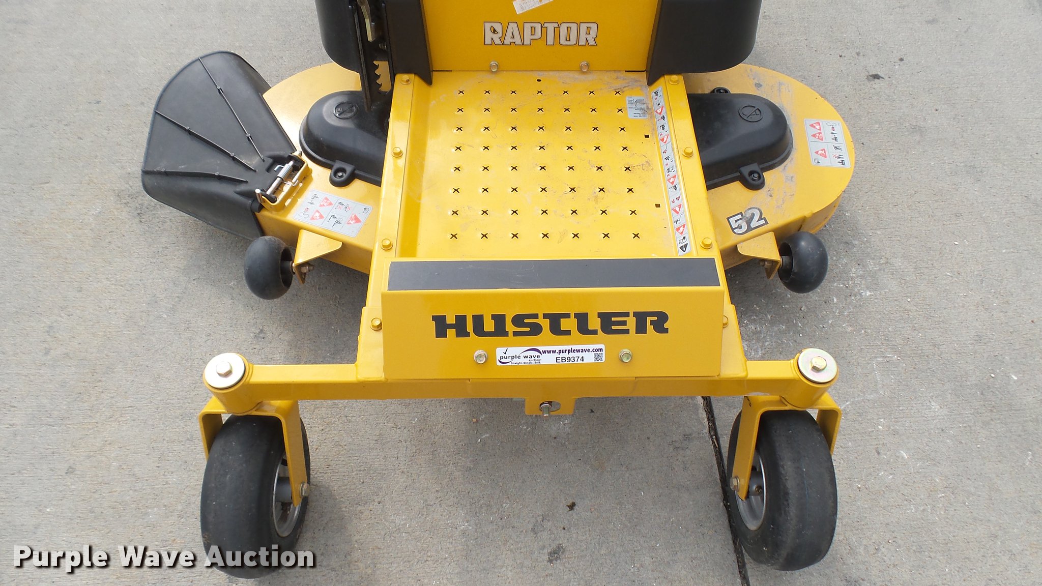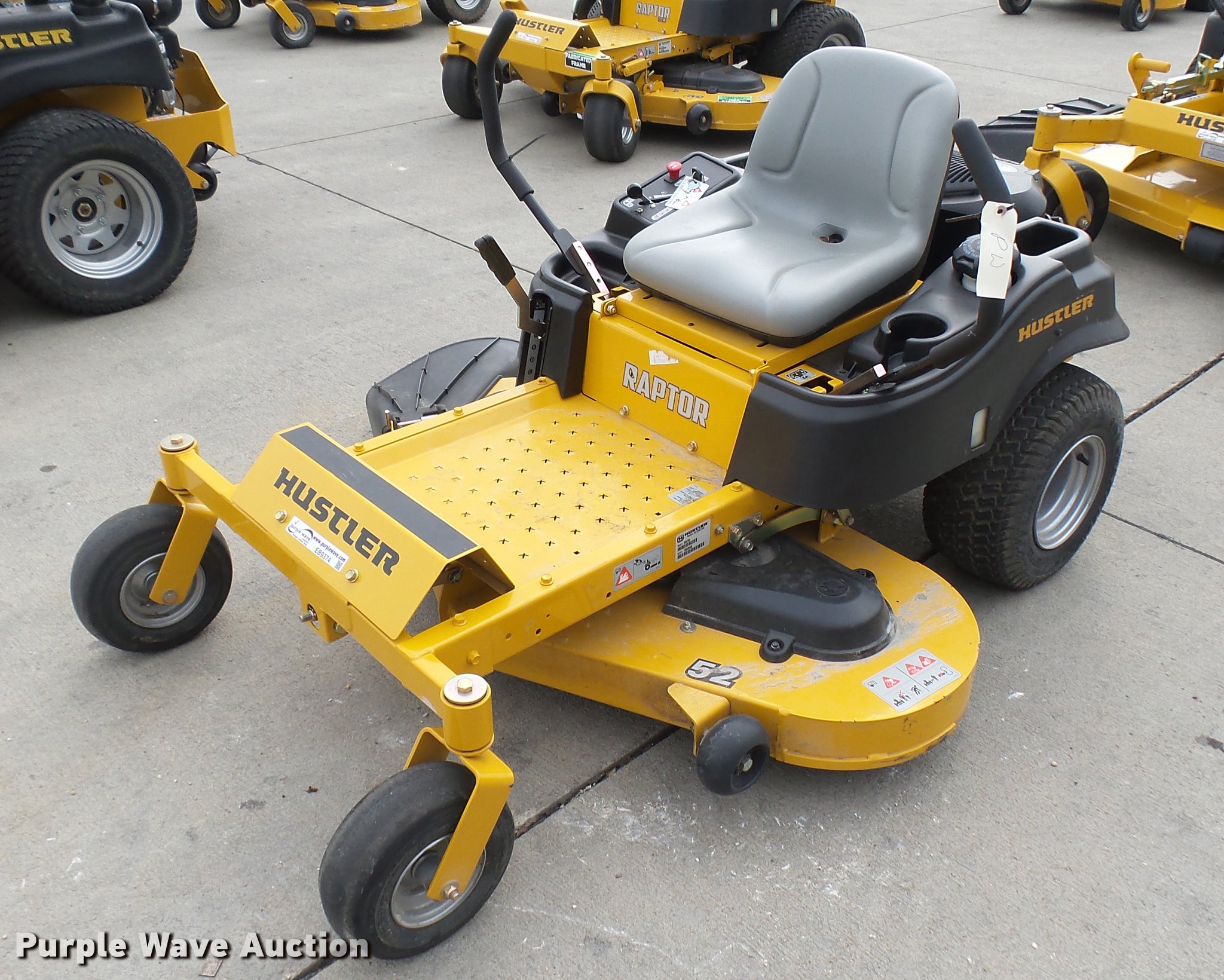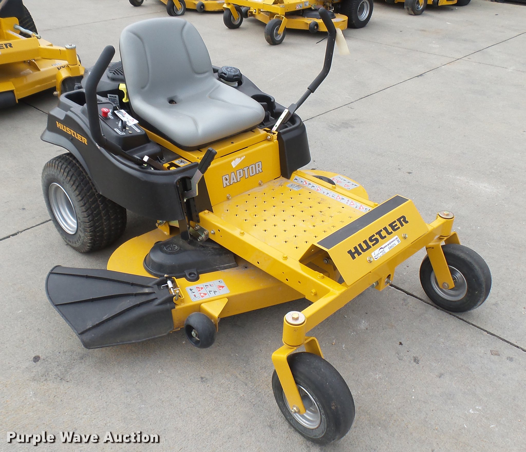 Purple Wave is selling a used Lawn Mower in Kansas. This item is a Hustler Raptor ZTR lawn mower with the following: Model 934794, 52" cut, Kohler 24 HP gas engine, 18x8.5x8 front tires, 11x4x5 rear tires, Serial 16049548
