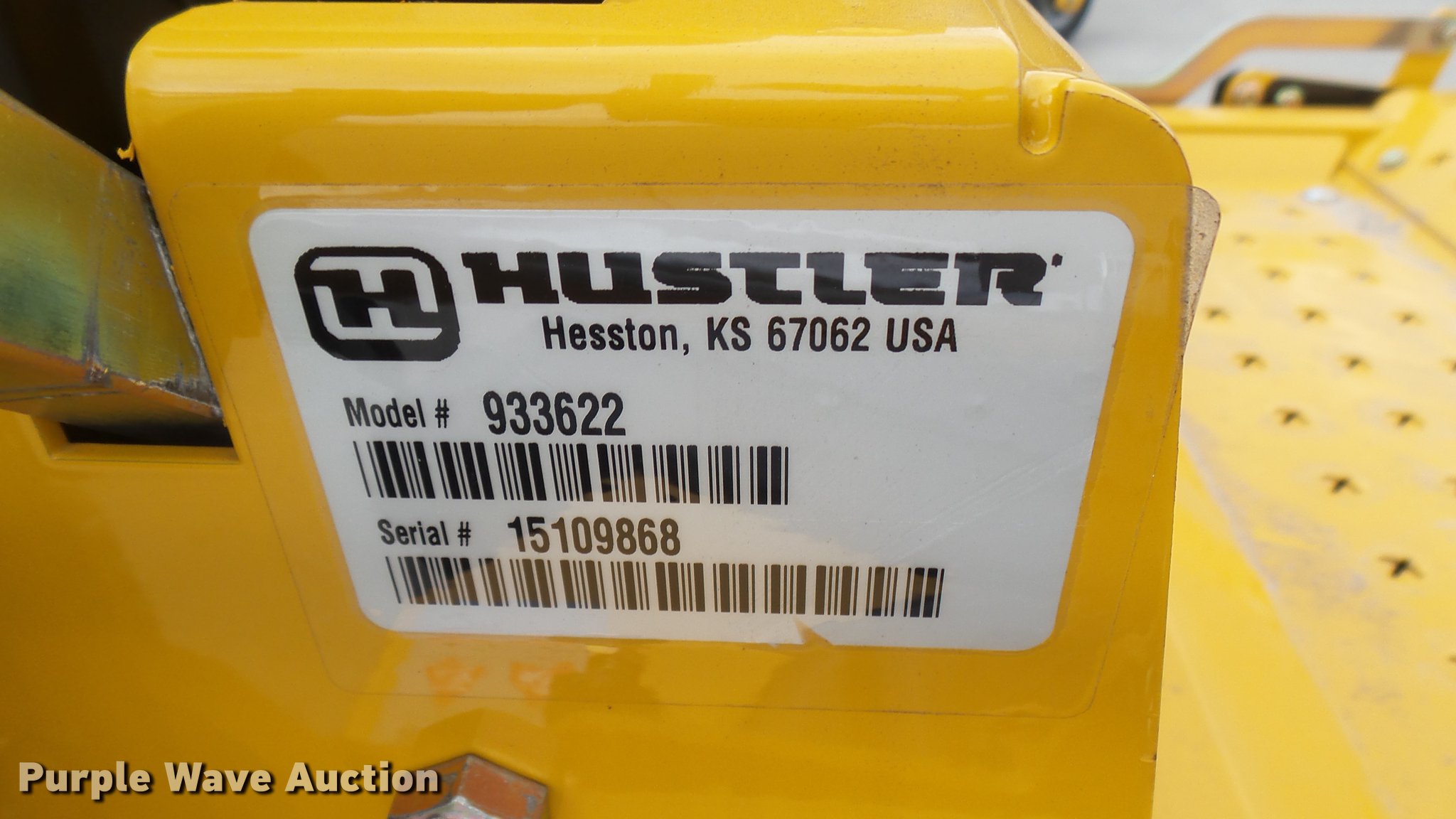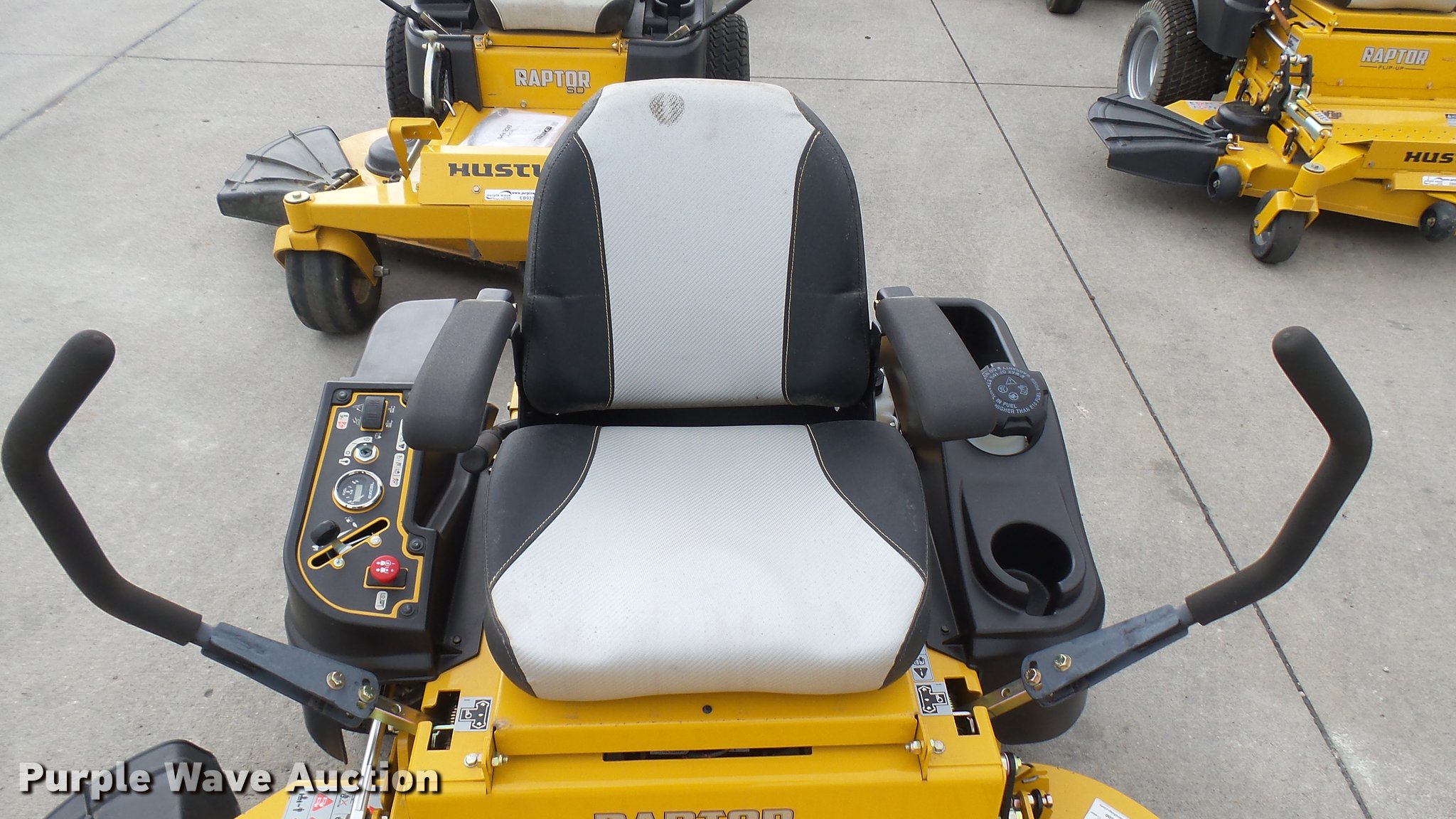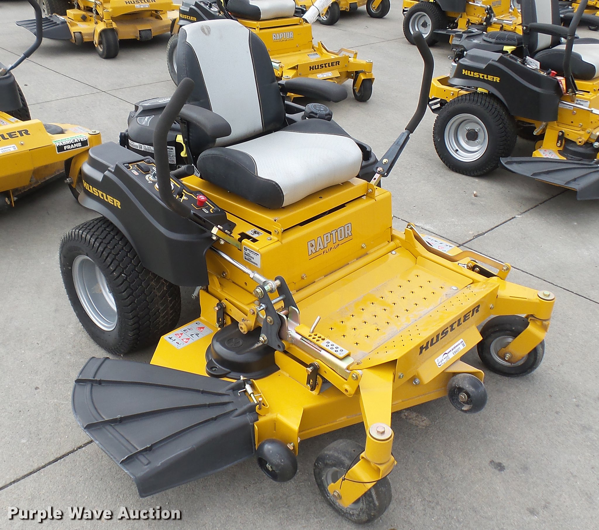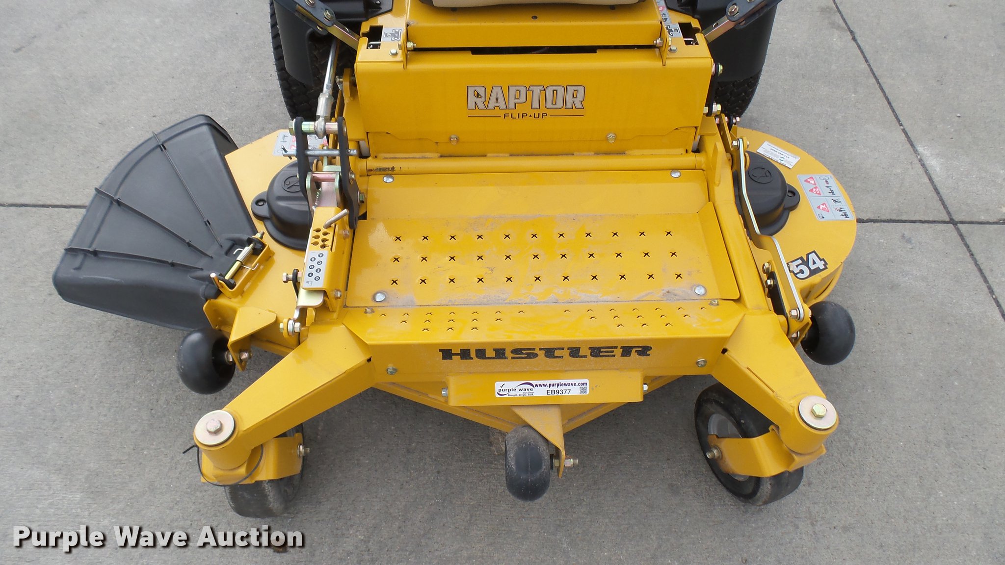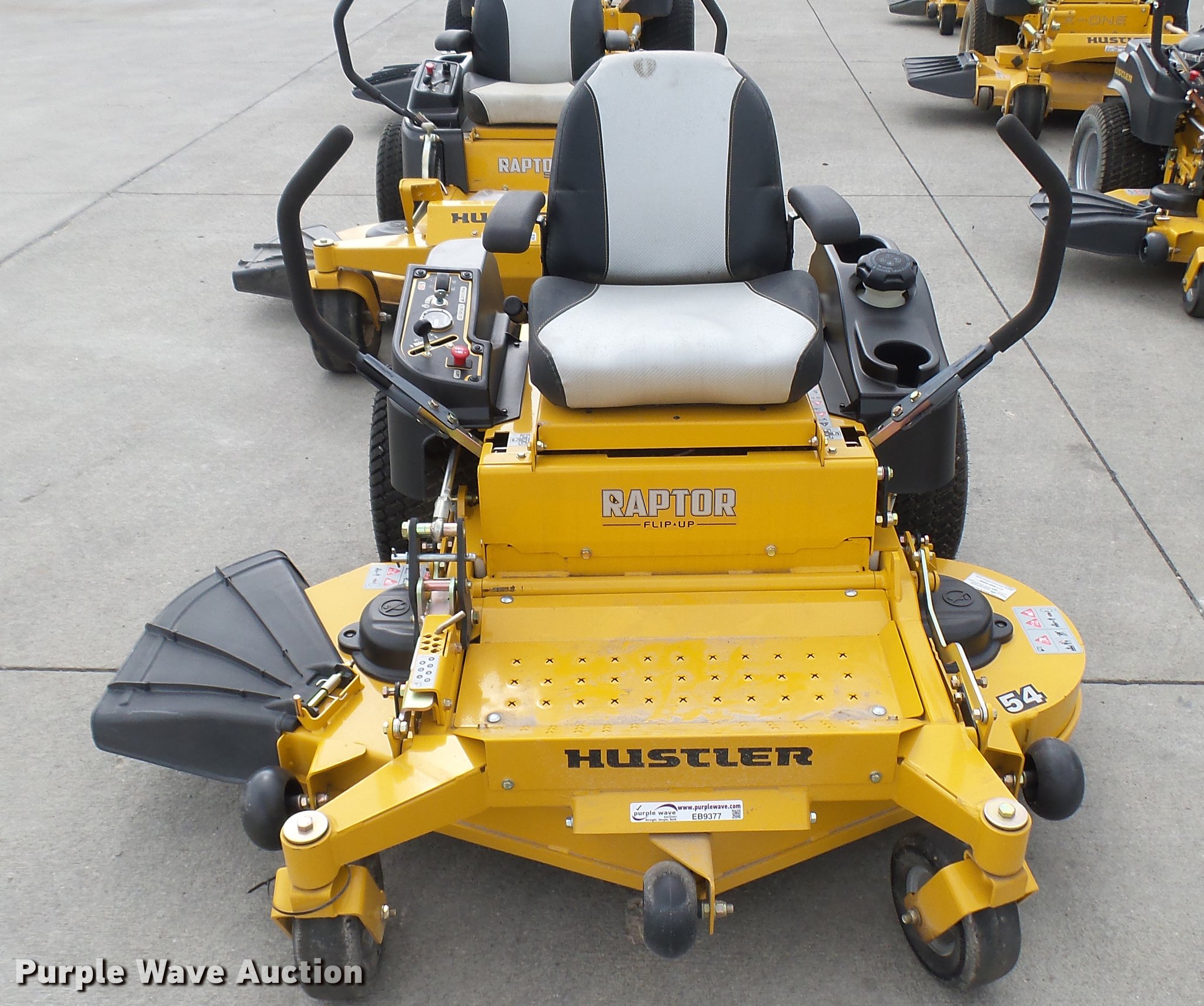 Purple Wave is selling a used Lawn Mower in Kansas. This item is a Hustler Raptor Flip-Up ZTR lawn mower with the following: 5 hours on meter, Model 933622, 54" cut, Kohler 25 HP gas engine, 20x10x10 front tires, 9x3.5x2.25 rear tires, Serial 15109868