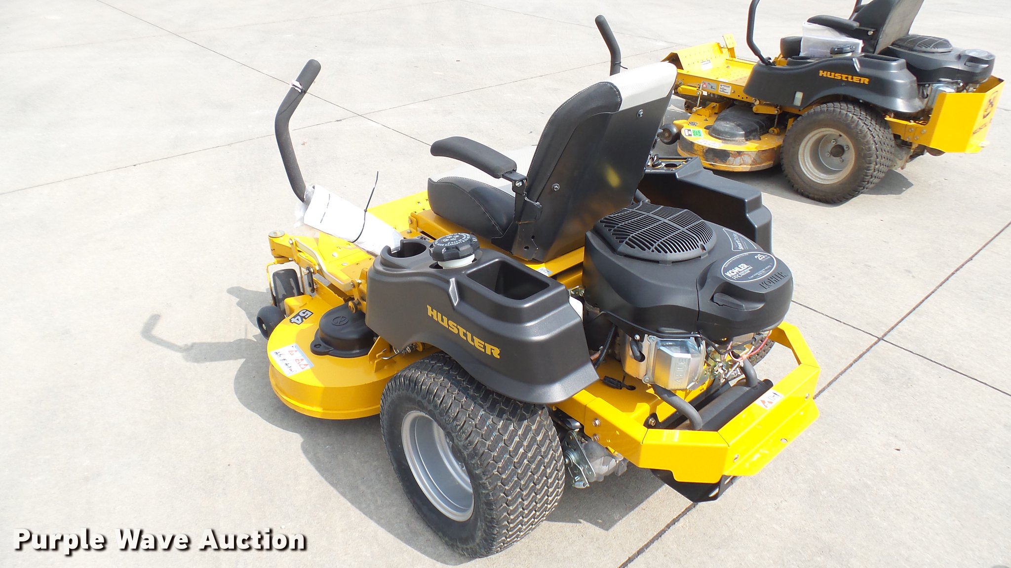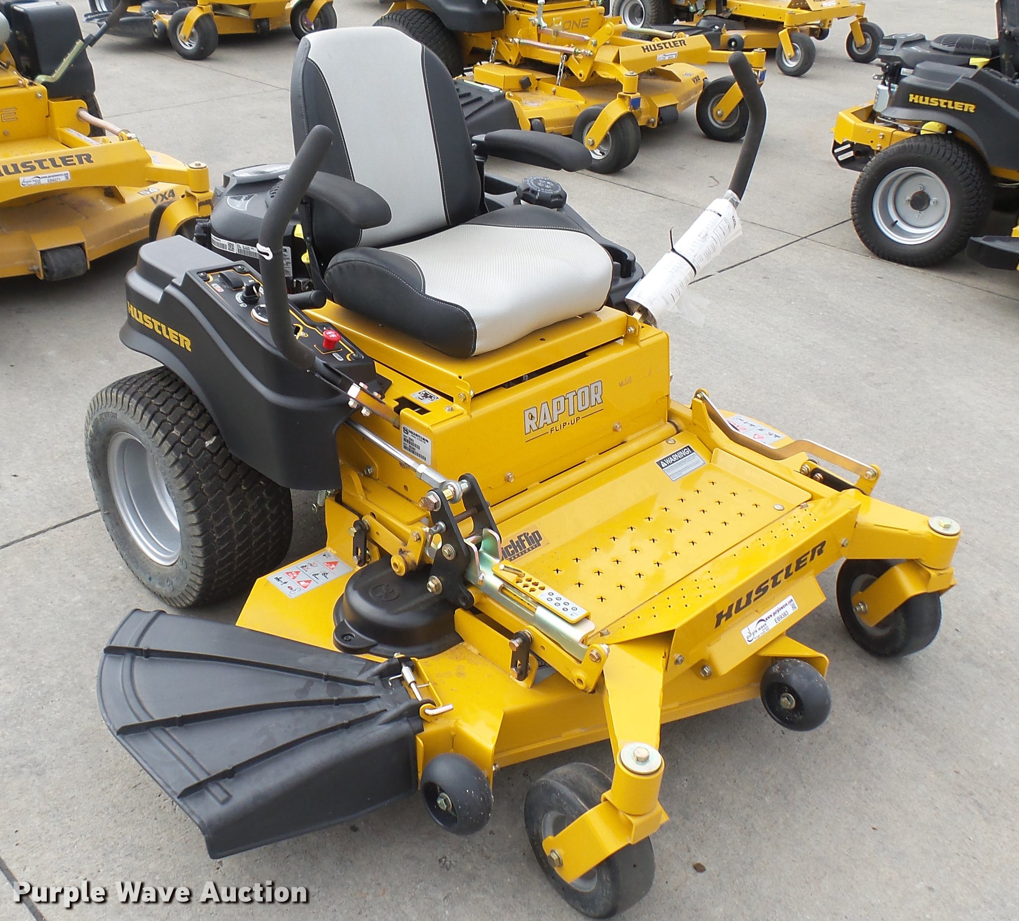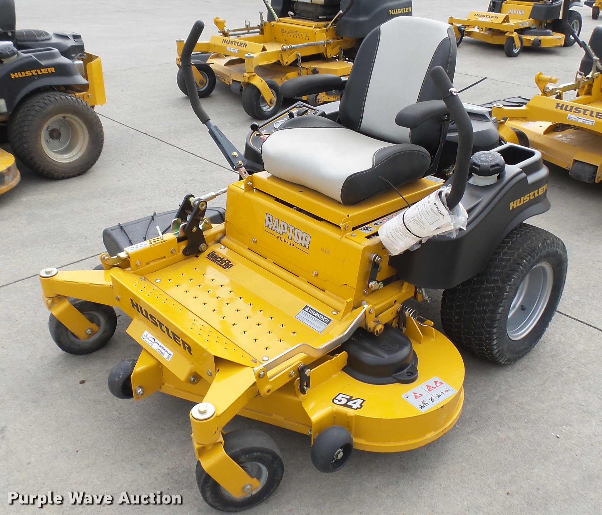 Purple Wave is selling a used Lawn Mower in Kansas. This item is a Hustler Raptor Flip-Up ZTR lawn mower with the following: 23 hours on meter, Model 933622, 54" cut, Kohler 25 HP gas engine, 20x10x10 front tires, 9x3.5x2.25 rear tires, Serial 16038850