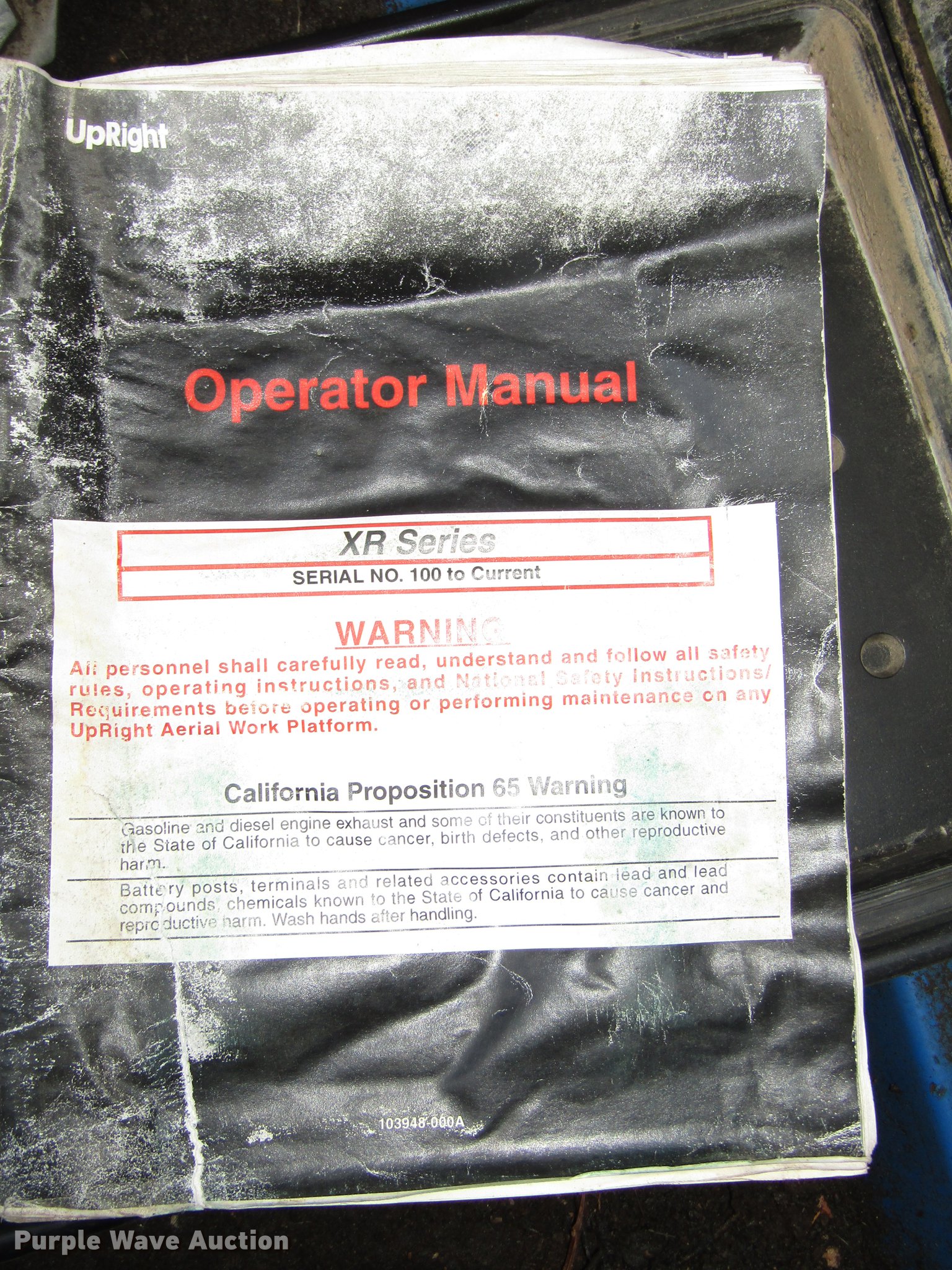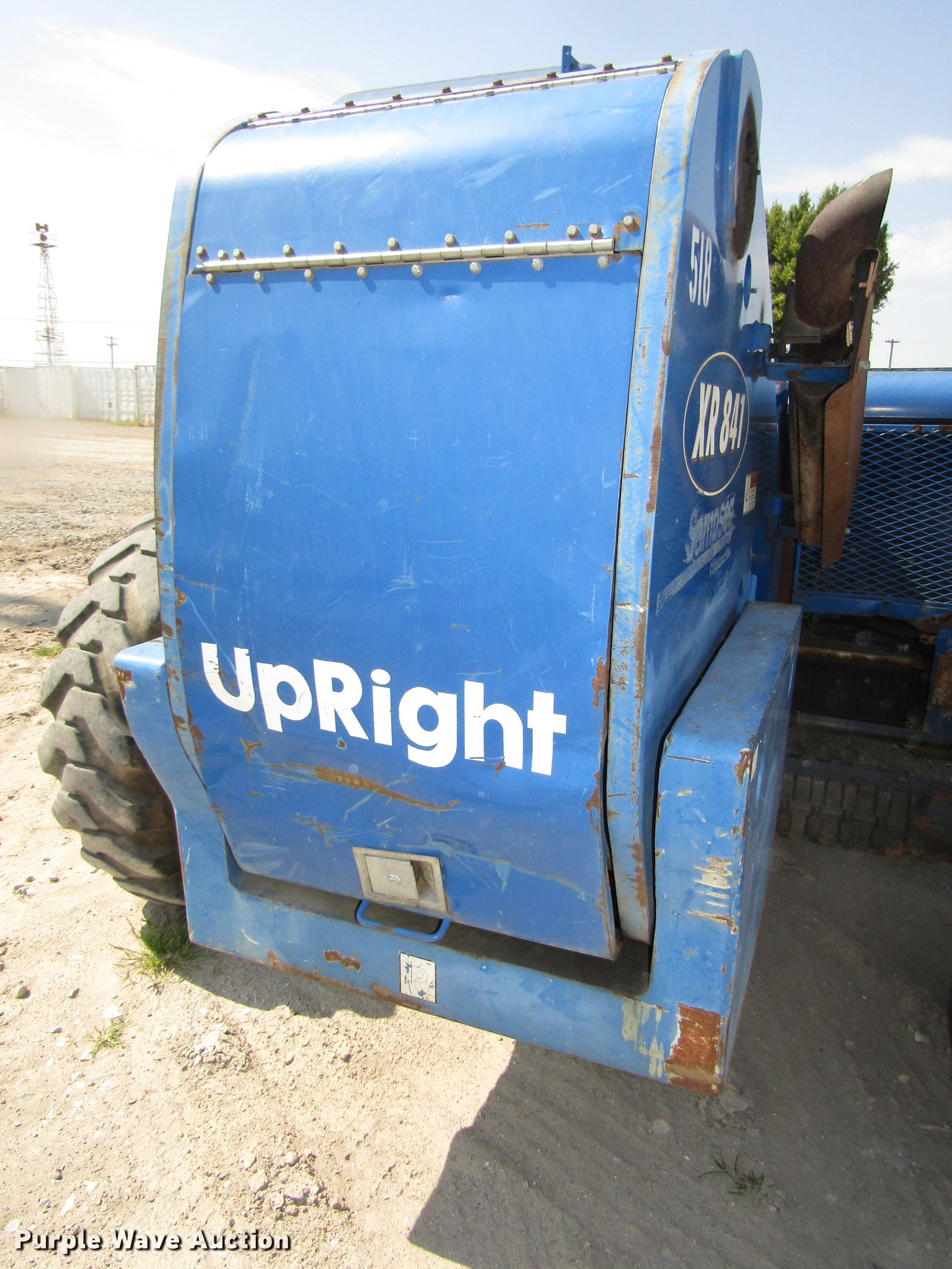 Purple Wave is selling a used Telehandler in Nebraska. This item is a Up Right XR841 telehandler with the following: 3,940 hours on meter, Cummins B3.9C 3.9L four cylinder turbo diesel engine, 110 HP, Serial 45911714, Powershift transmission, 4F-3R gears, Crab steer, Circle steer, SafTCab ROPS, Serial 048479, Spring suspension seat, Block heater, Backup alarm, Battery shut off switch, 8,000 lbs maximum lift capacity, 27'2" maximum reach length, 41.5' maximum lift lift height, 1,825 lbs maximum lift capacity at 27'2" reach, 48"L x 4"W forks, 61.5"W x 45"H carriage, 65"L x 2" diameter carriage bar, Hydraulic leveling, Quick attach, 35 gallon fuel tank, 121" wheelbase, 16" ground clearance, 228"L x 98"W x 96"H unit, 13.00-24 foam filled tires, 21,180 lbs. base operating weight, Low profile unit, Operator manual, Load chart, Forks damaged, Engine cover will not stay up, Glass cracked, Serial 136, Unit# 518