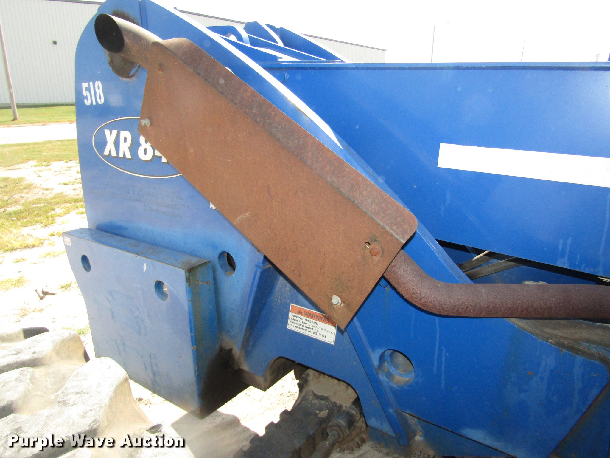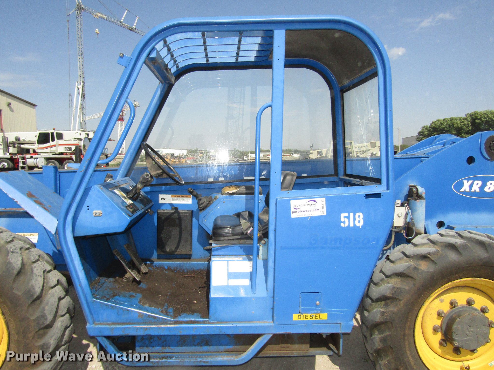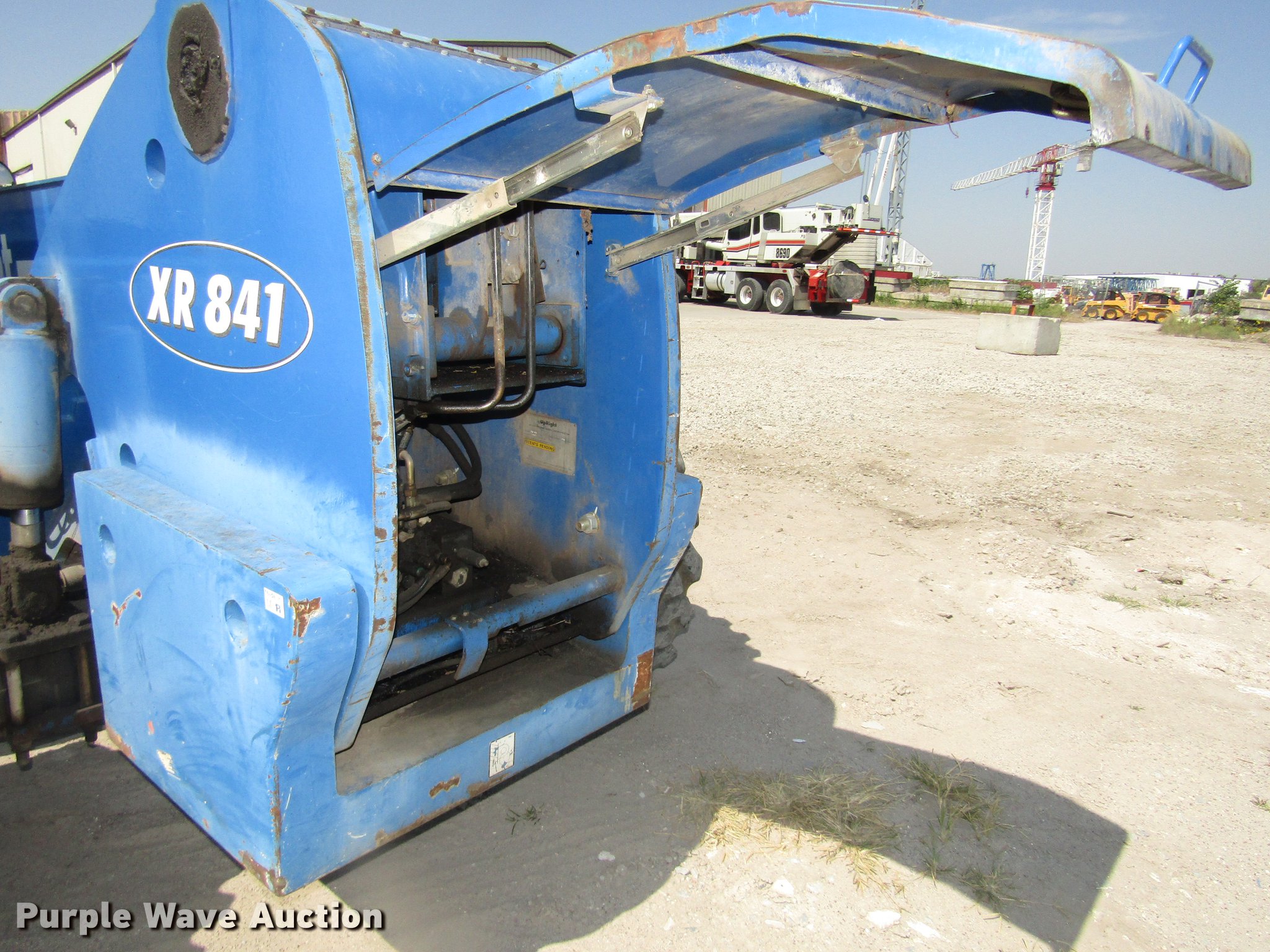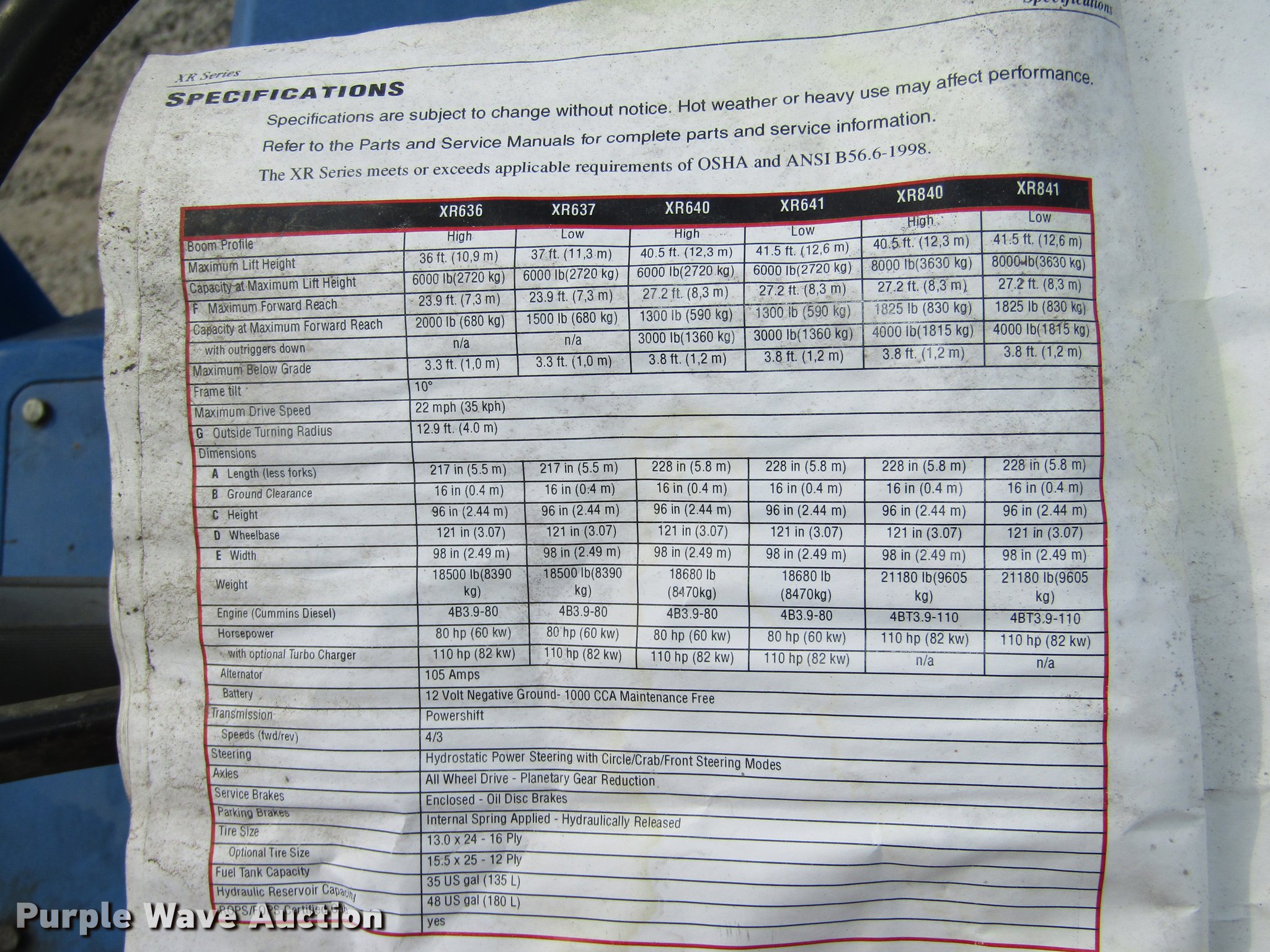 Up Right XR841 telehandler. 3,940 hours on meter, Cummins B3.9C 3.9L four cylinder turbo diesel engine 110 HP, Serial 45911714, Powershift transmission 4F-3R gears, Crab steer, Circle steer, SafTCab ROPS Serial 048479, Spring suspension seat, Block heater, Backup alarm, Battery shut off switch, 8,000 lbs maximum lift capacity, 27'2" maximum reach length, 41.5' maximum lift lift height, 1,825 lbs maximum lift capacity at 27'2" reach, 48"L x 4"W forks, 61.5"W x 45"H carriage, 65"L x 2" diameter carriage bar, Hydraulic leveling, Quick attach, 35 gallon fuel tank, 121" wheelbase, 16" ground clearance, 228"L x 98"W x 96"H unit, 13.00-24 foam filled tires, 21,180 lbs. base operating weight, Low profile unit, Operator manual, Load chart, Forks damaged, Engine cover will not stay up, Glass cracked, Serial 136, Unit# 518. Sampson Construction. 6020 N 60th Street. Lincoln, NE 68507