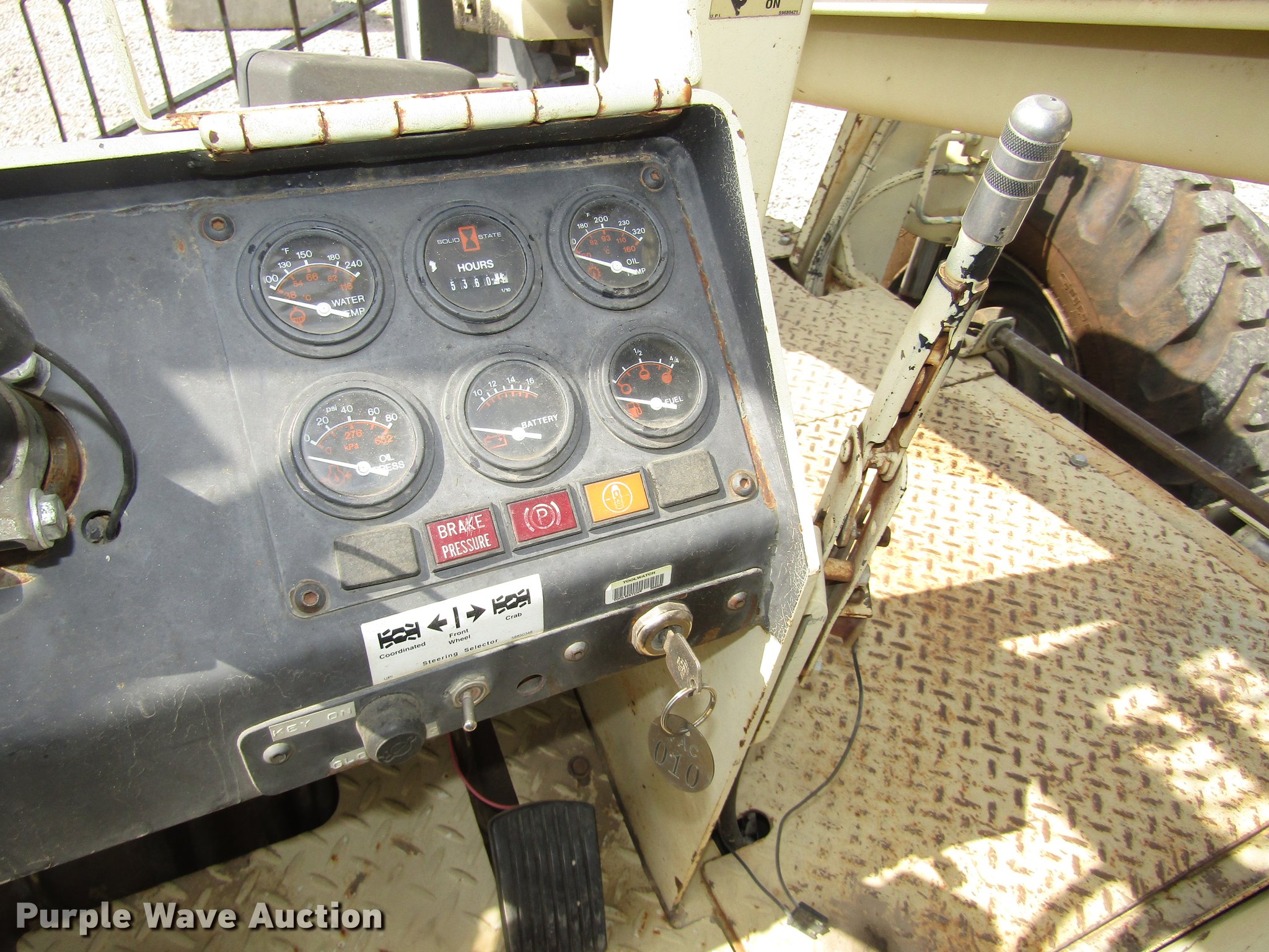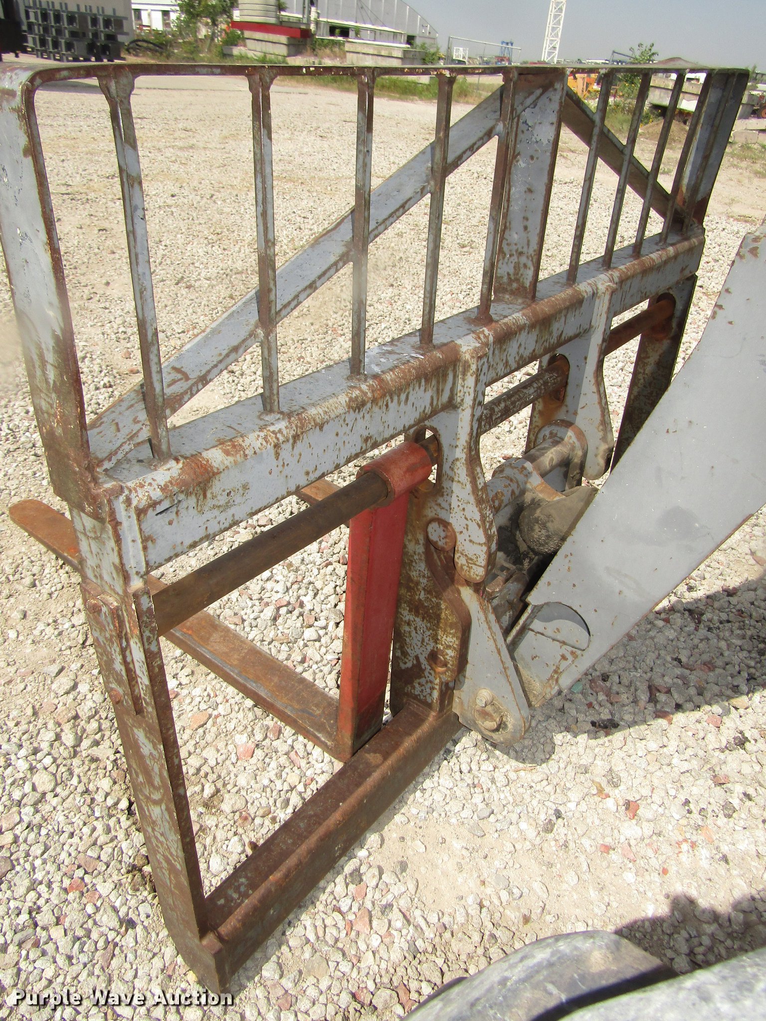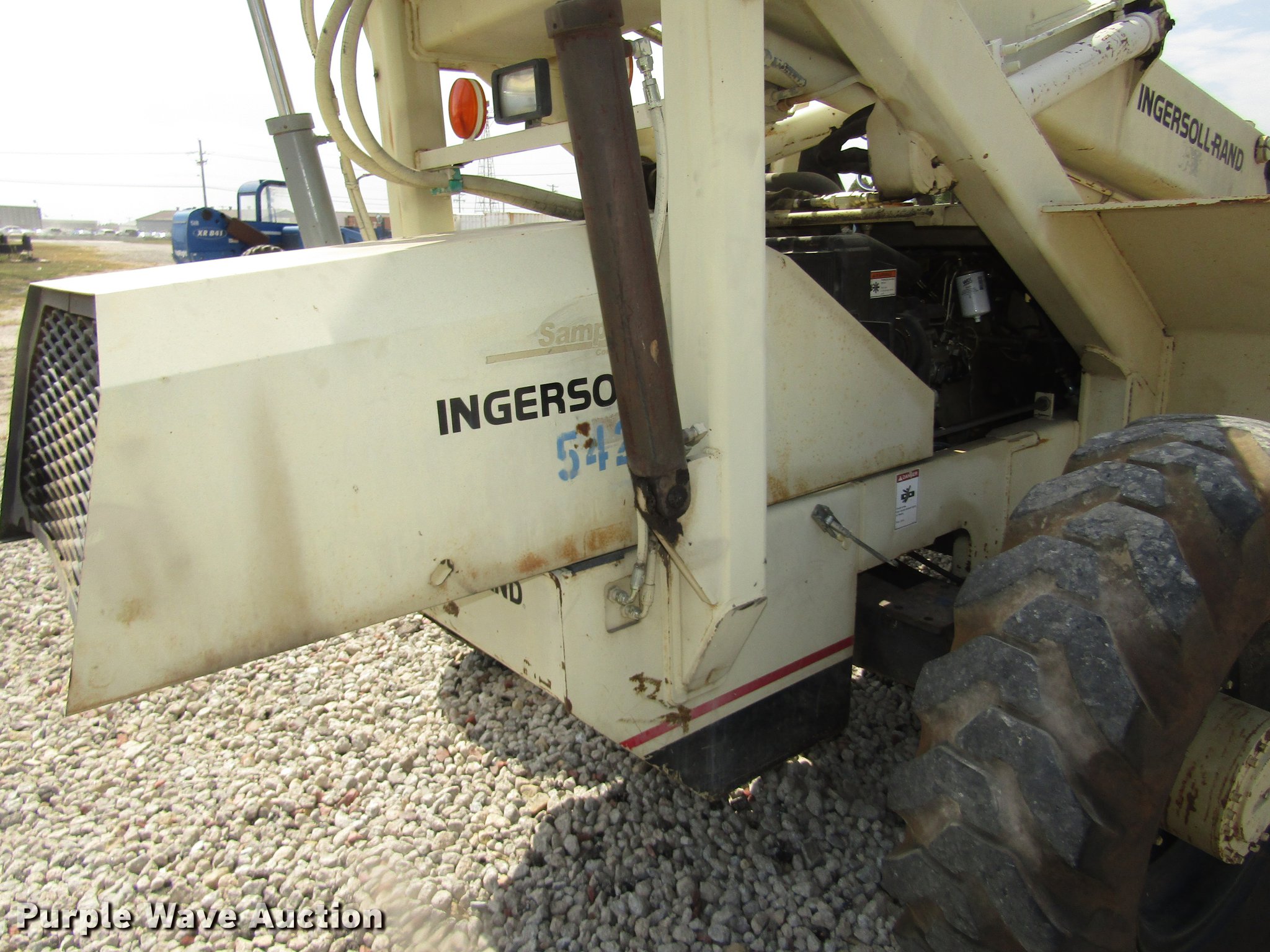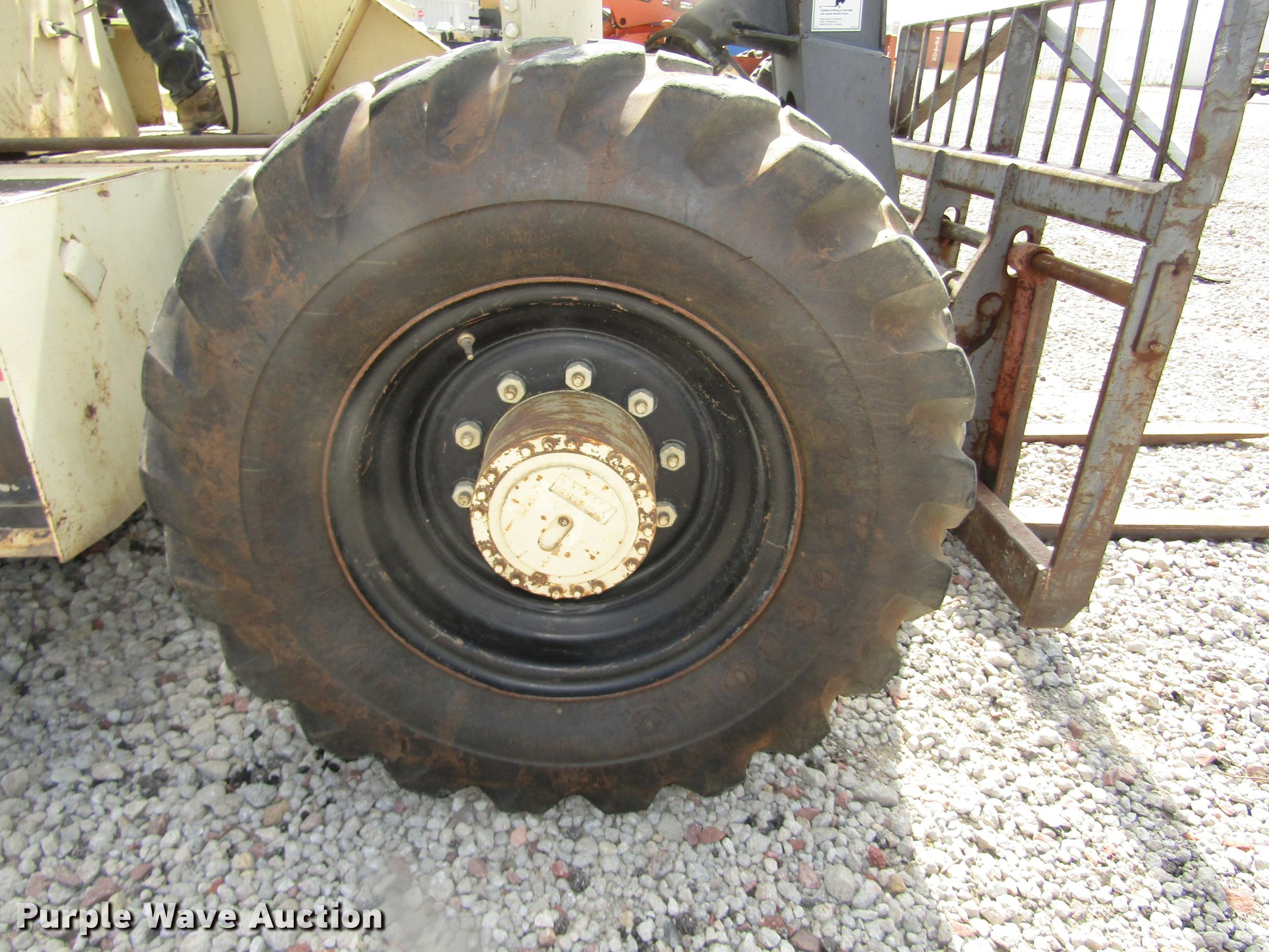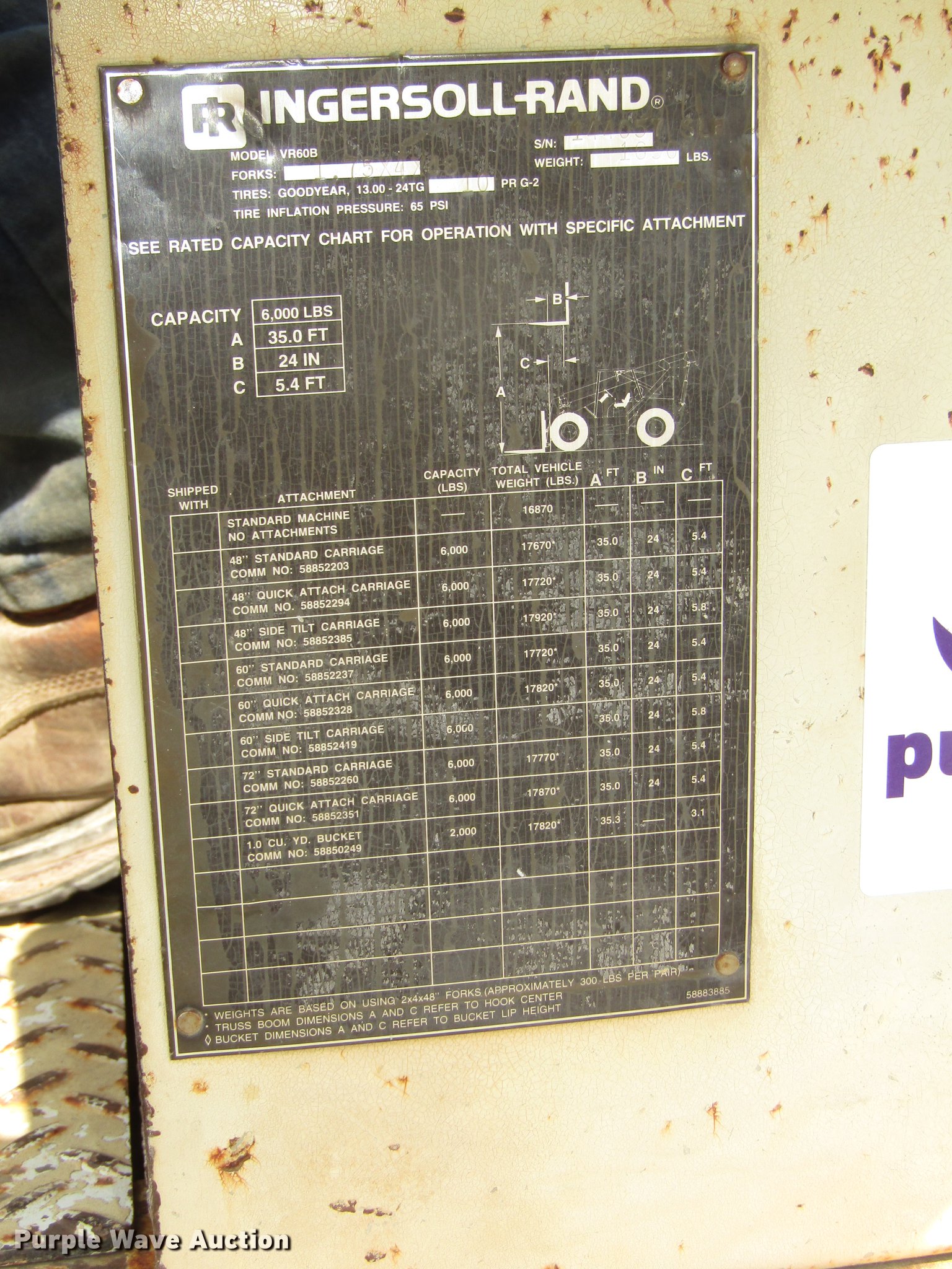Purple Wave is selling a used Telehandler in Nebraska. This item is a Ingersoll Rand VR60B telehandler with the following: Perkins four cylinder diesel engine, Serial U726393A, Manual transmission, 3F-3R gears, Crab steer, Circle steer, ROPS, Spring suspension seat, 6,000 lbs maximum lift capacity, 27' maximum reach length, 42' maximum lift height, 48"L x 4"W forks, 64"W x 46"H carriage backrest, 1 3/4" diameter carriage bar, Front and rear work lights, Vandal cover, Firestone 13.00-24 foam filled tires, 16,900 lbs. base operating weight, Load chart, Serial 144057, Unit# 542