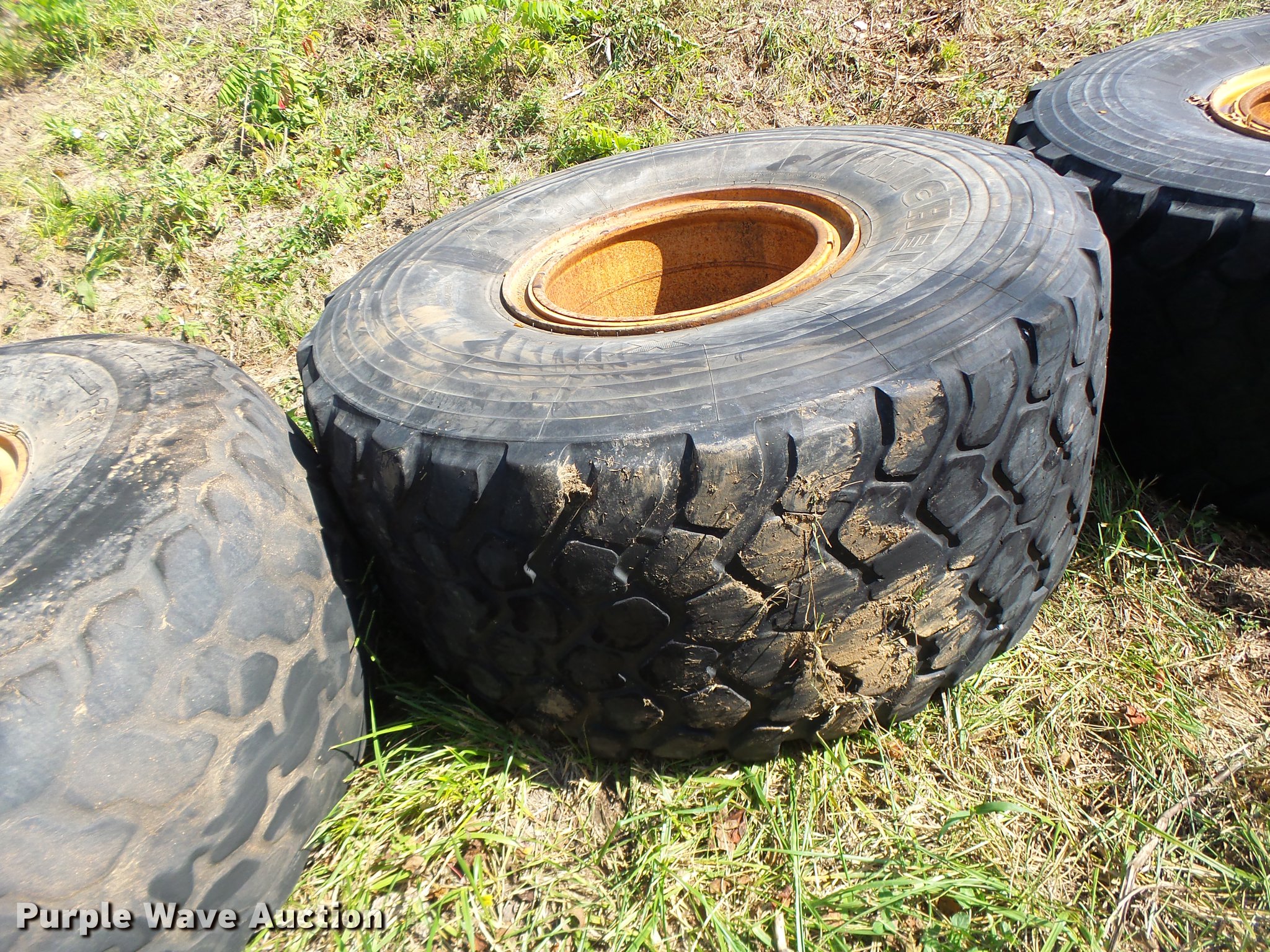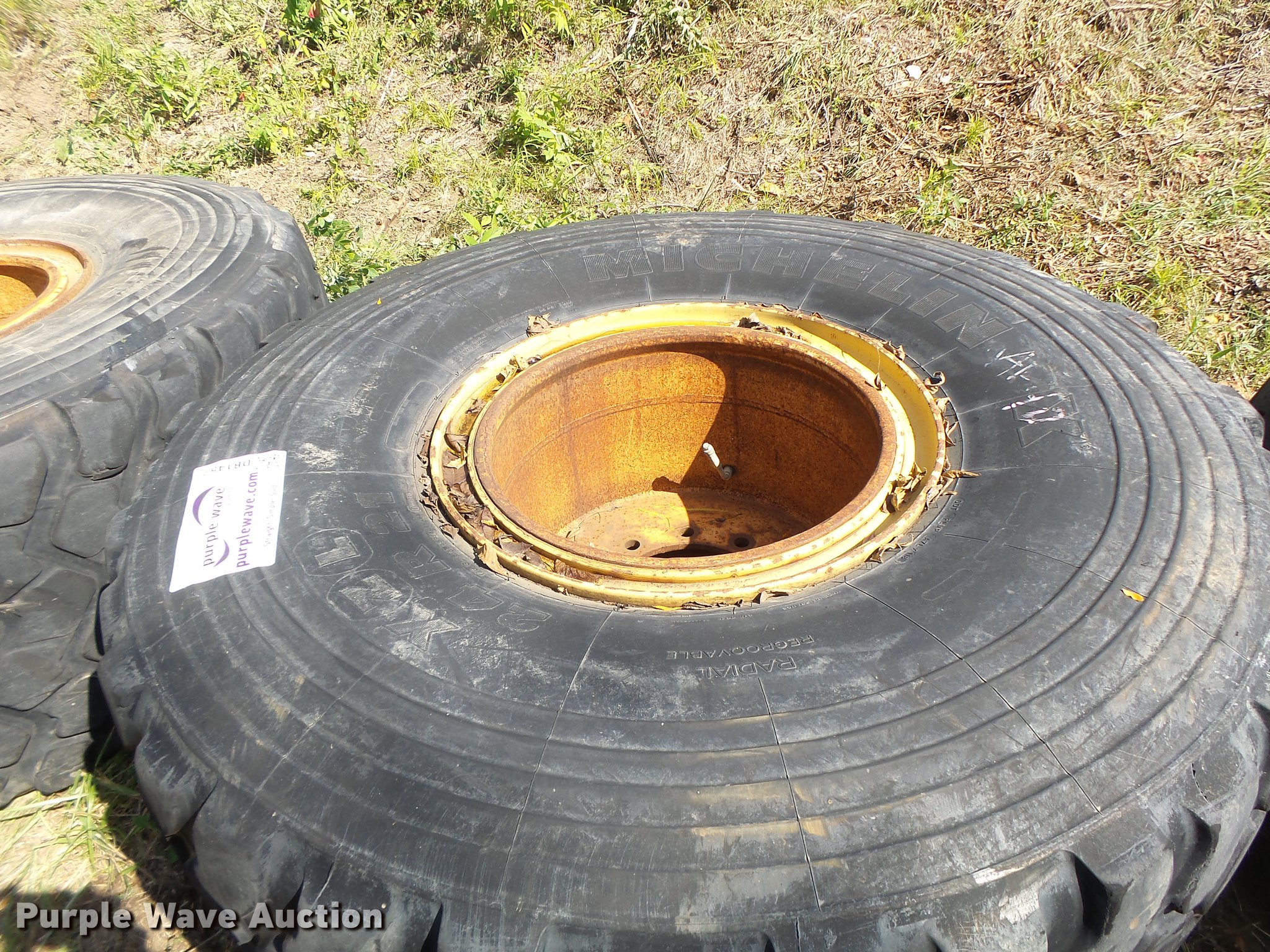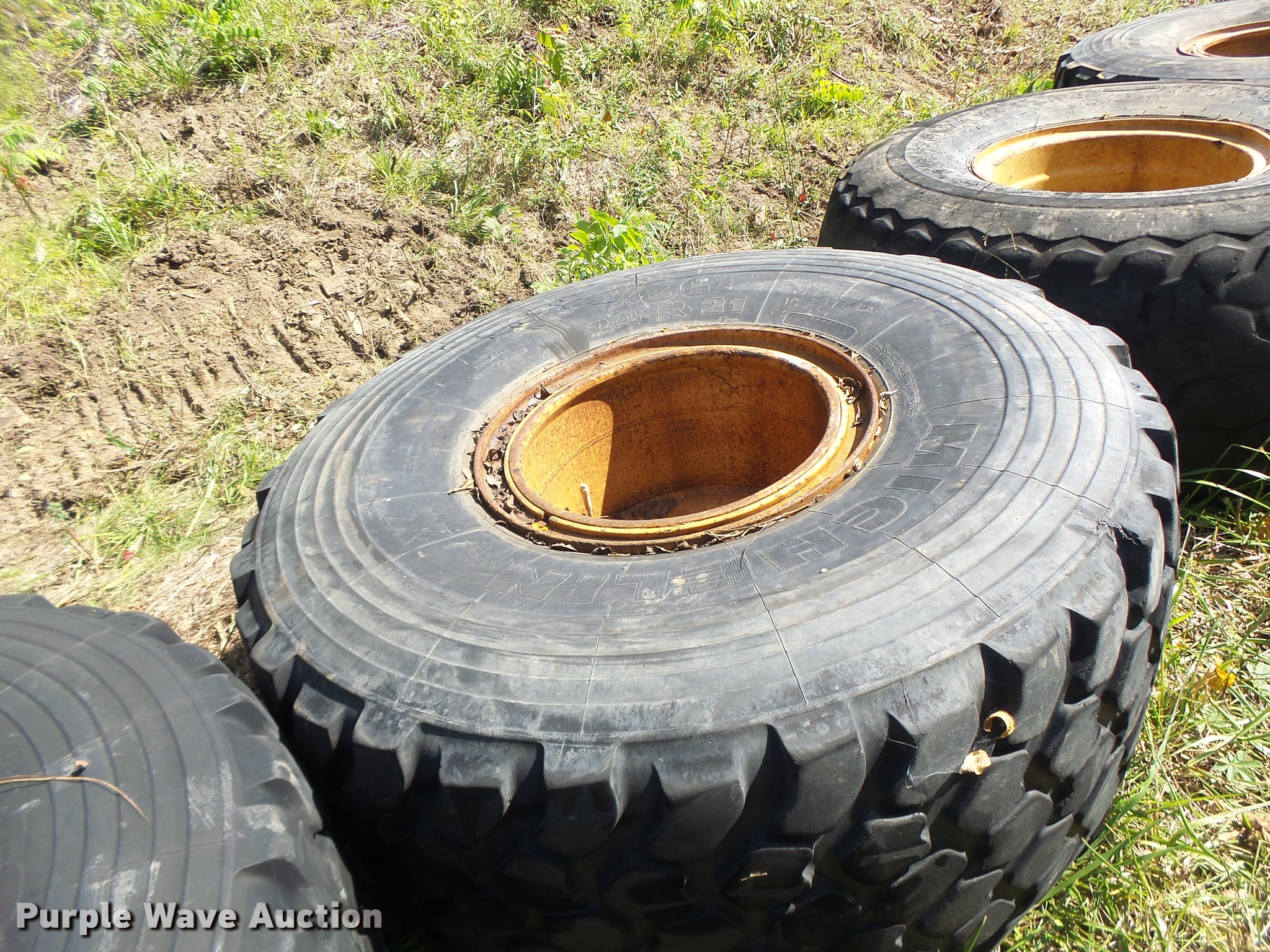 Purple Wave is selling a used Industrial Tires or Tracks in Missouri. This item is a (6) 24R21 tires with the following: (4) Michelin radial, (2) Firestone bias ply, 10 lug wheels, Removed from a Caterpillar 140 motor grader