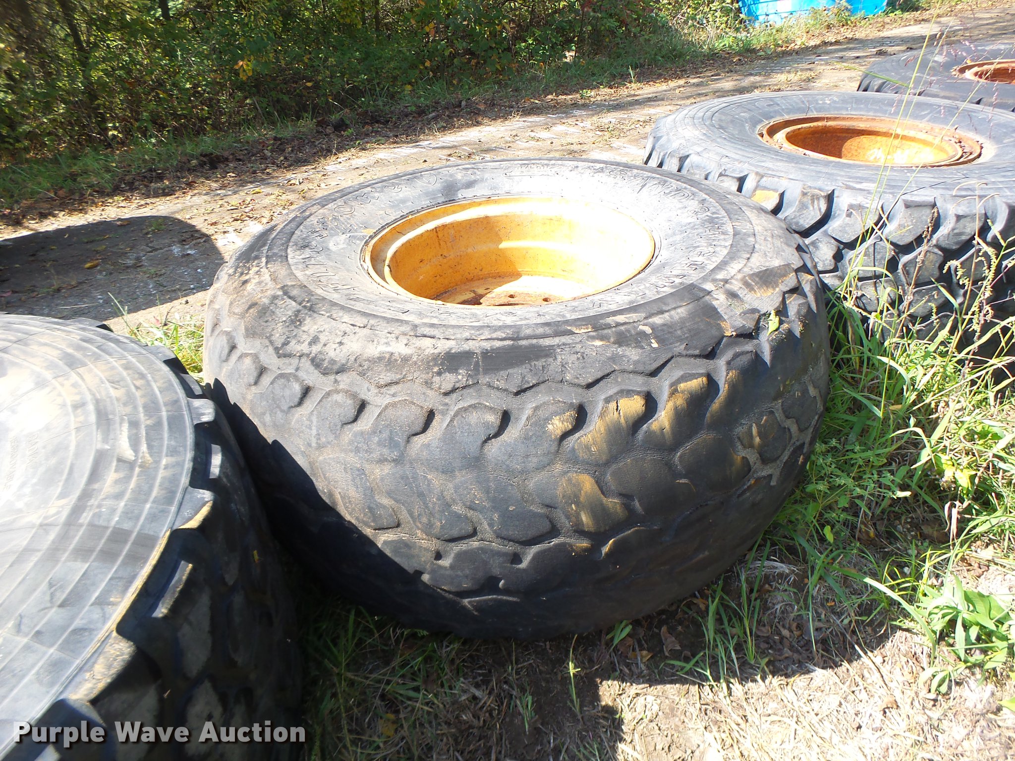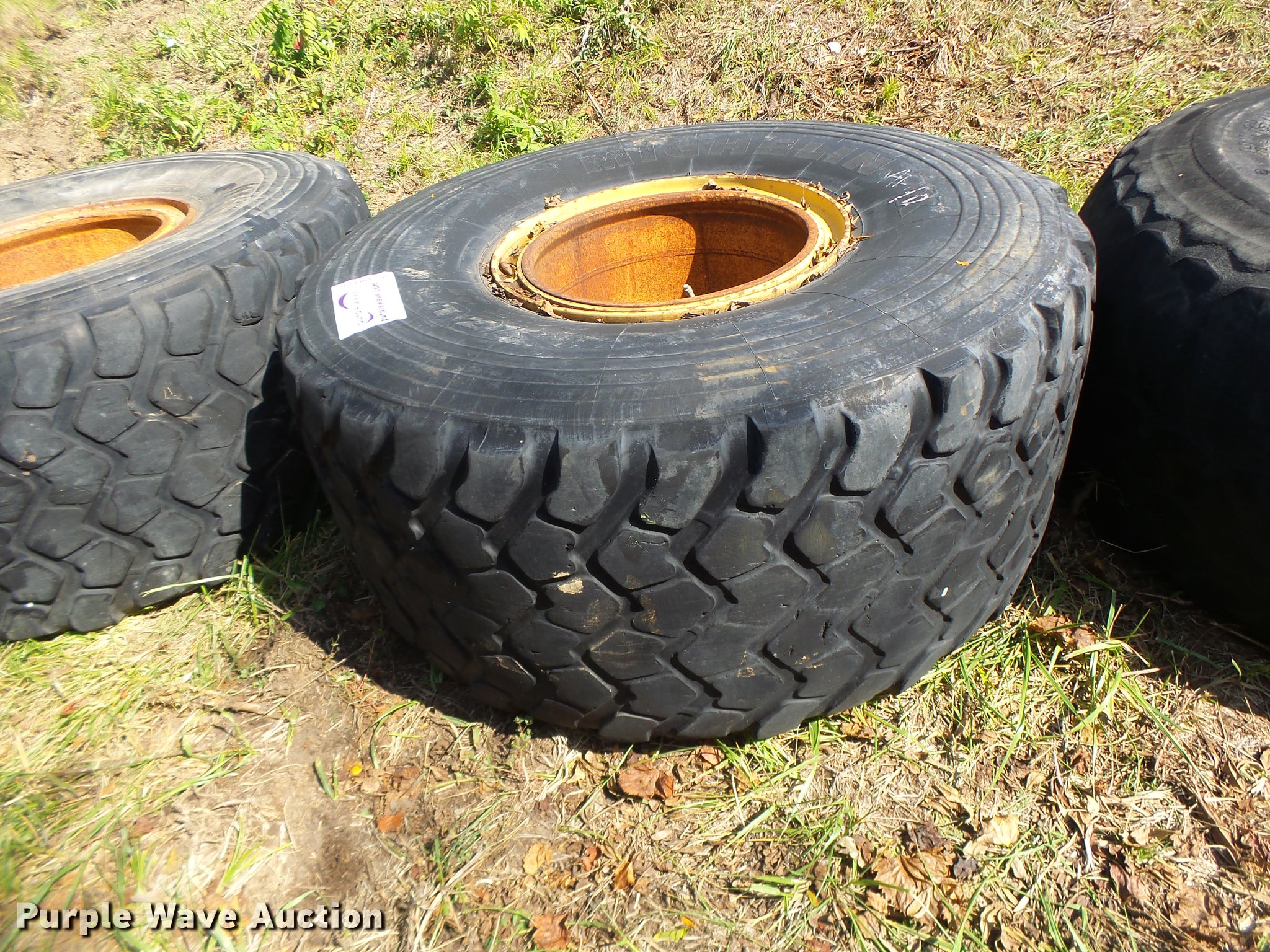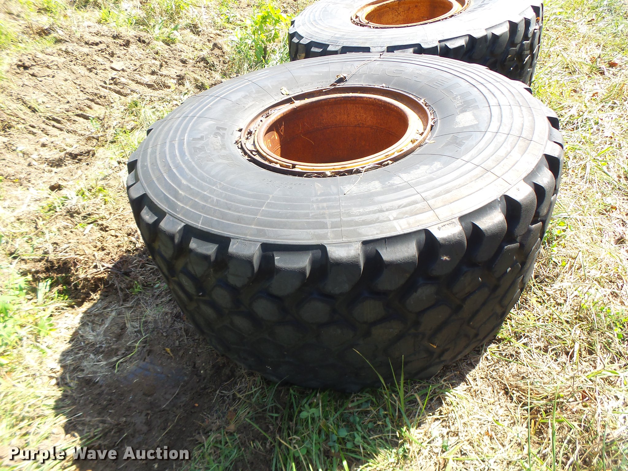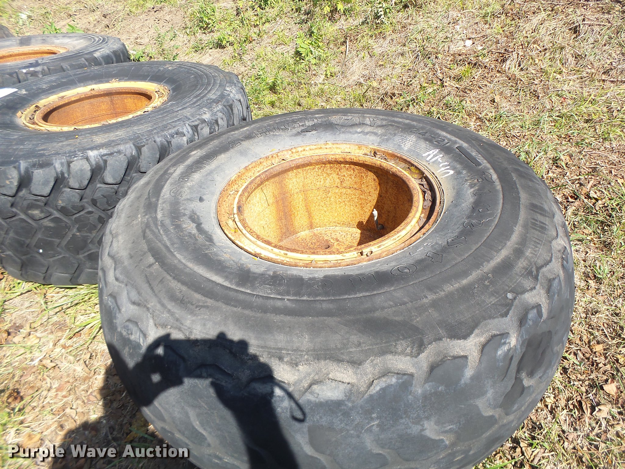 Purple Wave is selling a used Industrial Tires or Tracks in Missouri. This item is a (6) 24R21 tires with the following: (4) Michelin radial, (2) Firestone bias ply, 10 lug wheels, Removed from a Caterpillar 140 motor grader