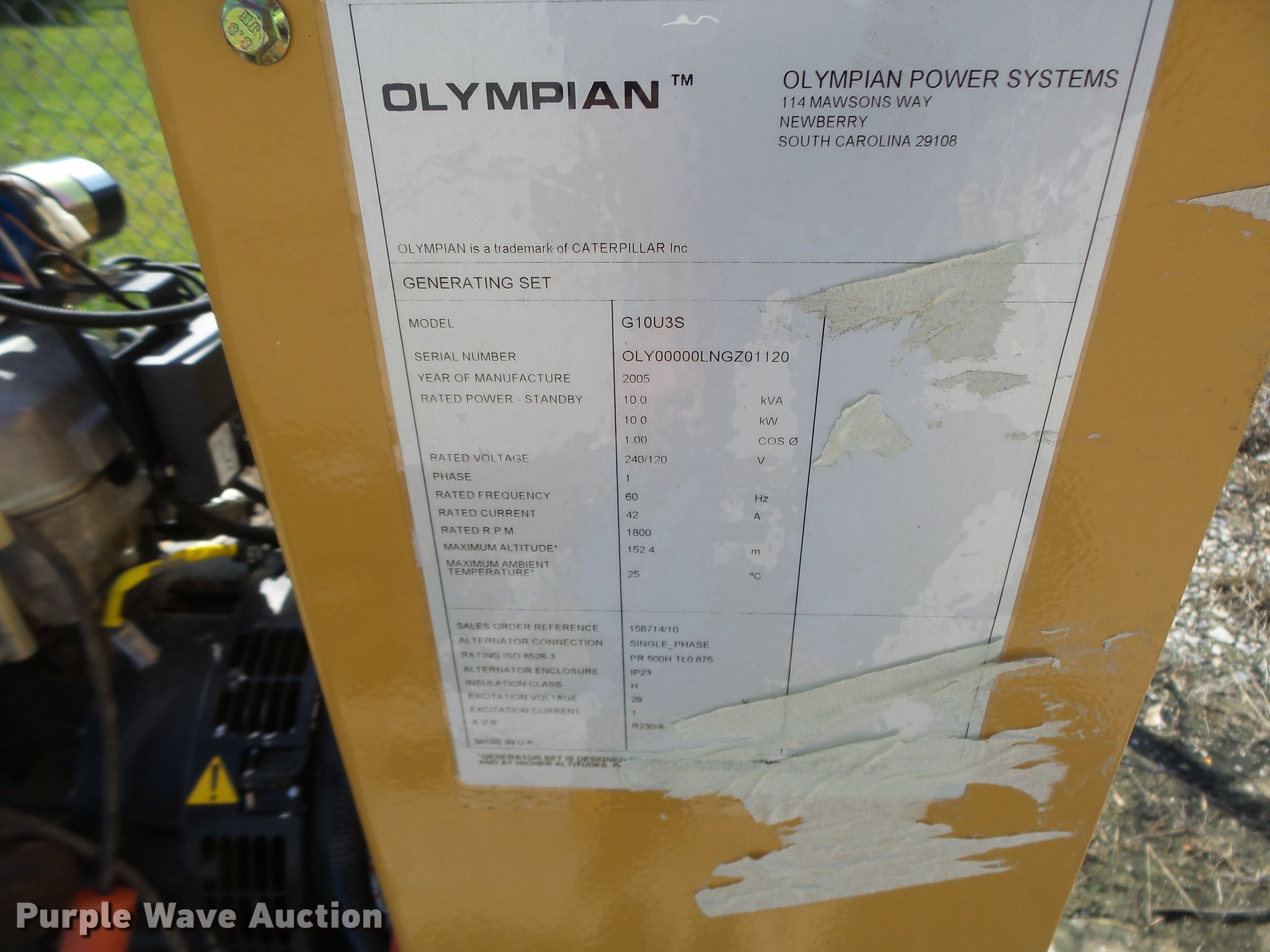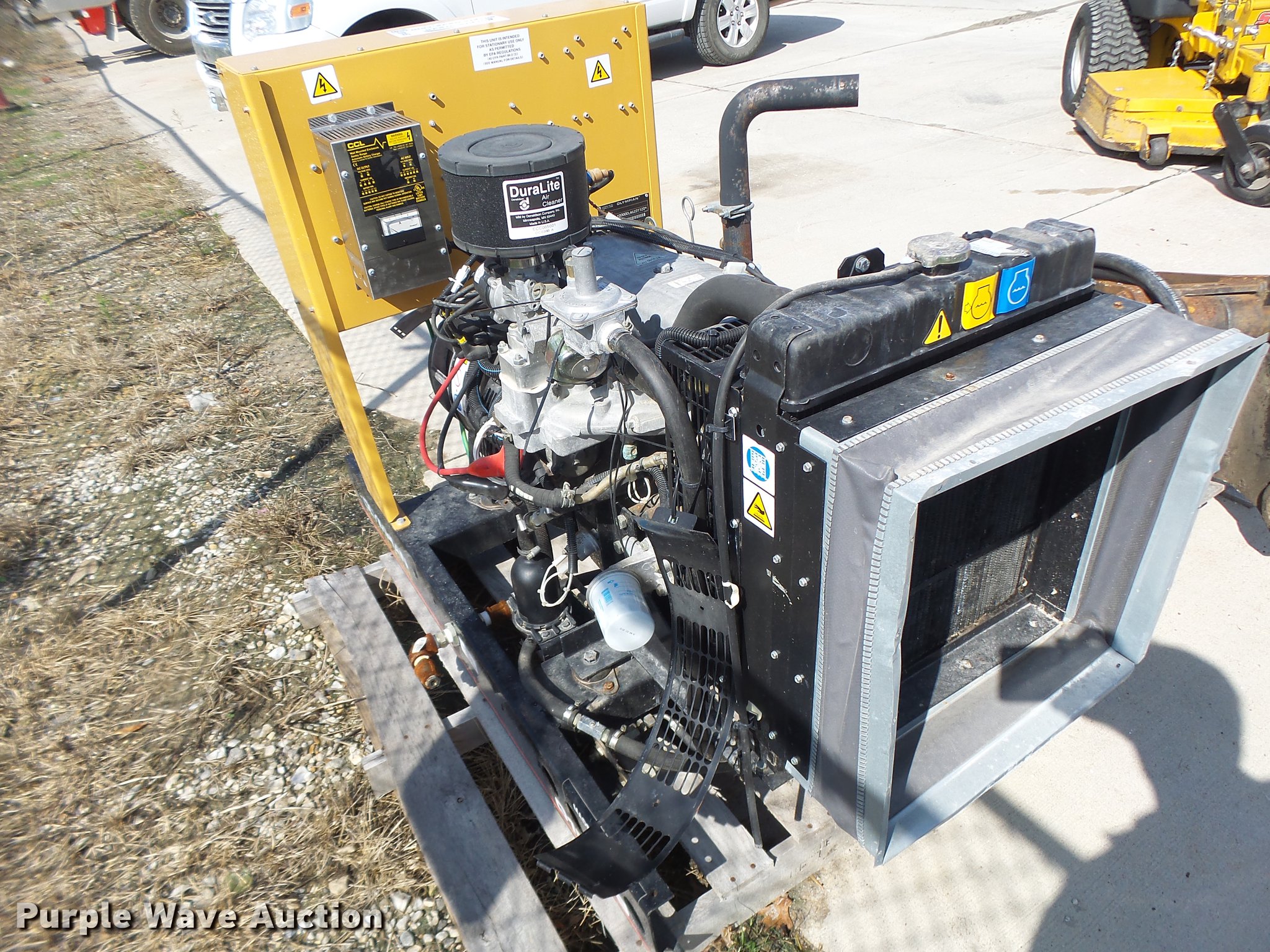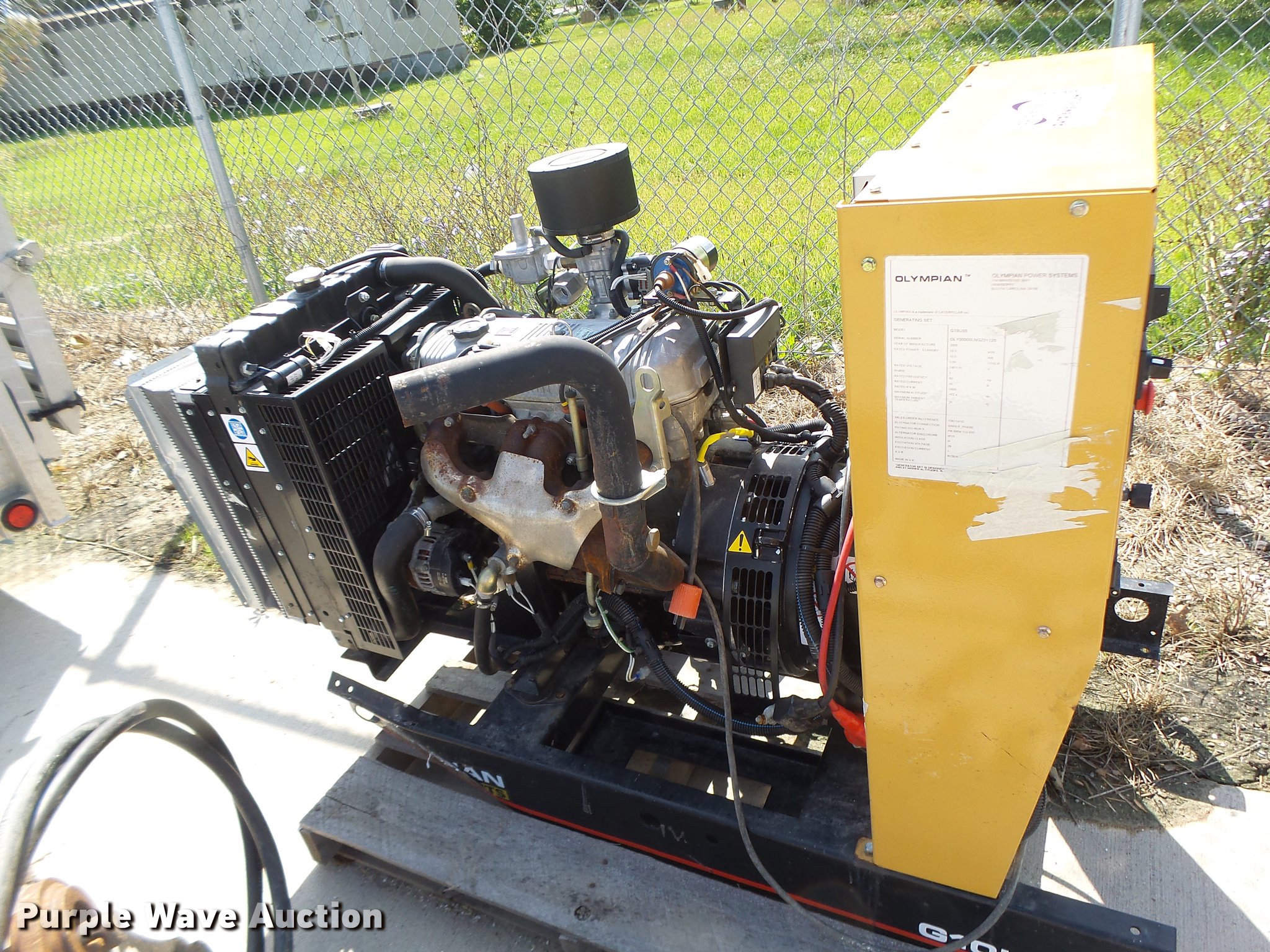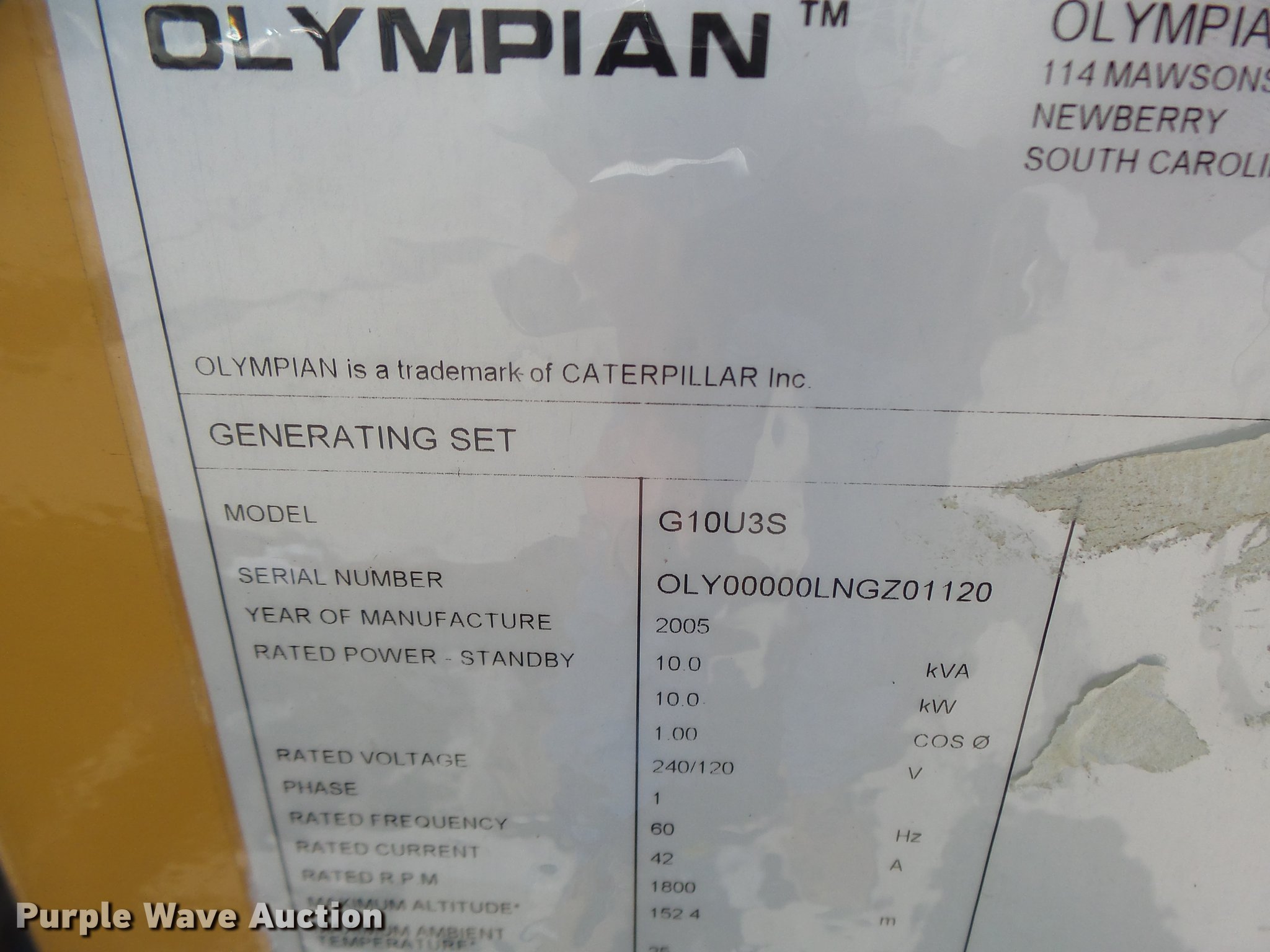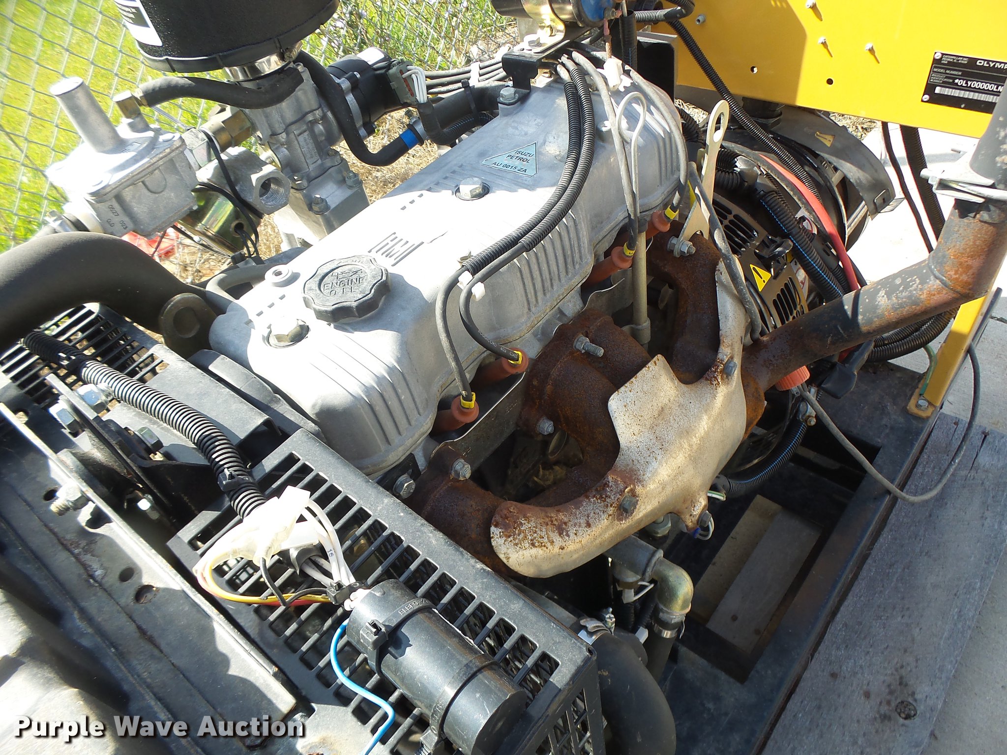 Purple Wave is selling a used Generator Set in Missouri. This item is a 2005 Olympian generator with the following: 21 hours on meter, Isuzu four cylinder propane engine, Olympian G10U35 generator, 10 kW, Electric start, Skid mounted, Generator will not produce power, Serial OLY00000LNGZ01120