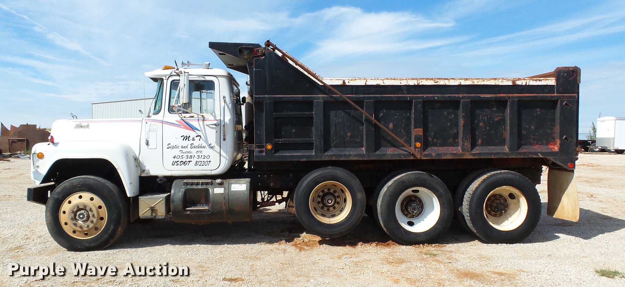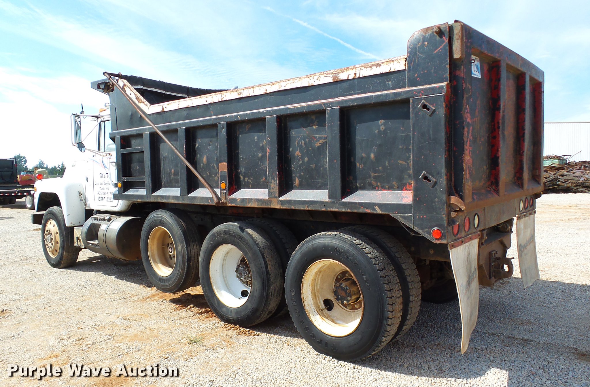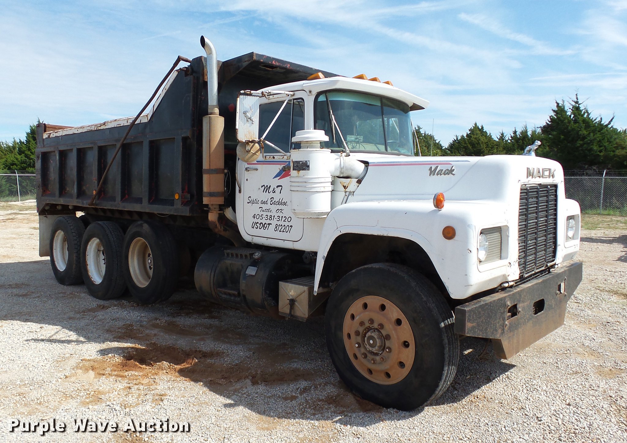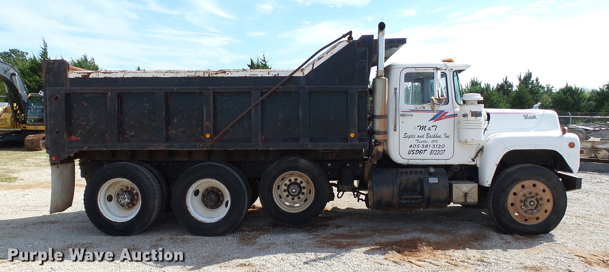 Purple Wave is selling a used Construction Dump Truck in Oklahoma. This item is a 1985 Mack R686ST dump truck with the following: 673,348 miles on odometer, 719 hours on meter, 1,156 hours on meter, Mack EM6-300 six cylinder turbo diesel engine, 300 HP, 10 speed manual transmission, Triple axle, Full differential lock, AC and heat, AM/FM/CD, Air suspension seat, Air ride cab, Front tow hooks, Exterior visor, PTO, Wet kit, 15'L x 96"W steel dump bed, 42" side height, Single ram hoist, Roll tarp, Air operated end gate, Single rear exhaust stack, Dual fuel tanks, Mud flaps, Pintle hitch, Trailer wiring, 208" wheelbase, Camelback suspension, Air brakes, 11R24.5 front tires, 275/80R22. rear tires