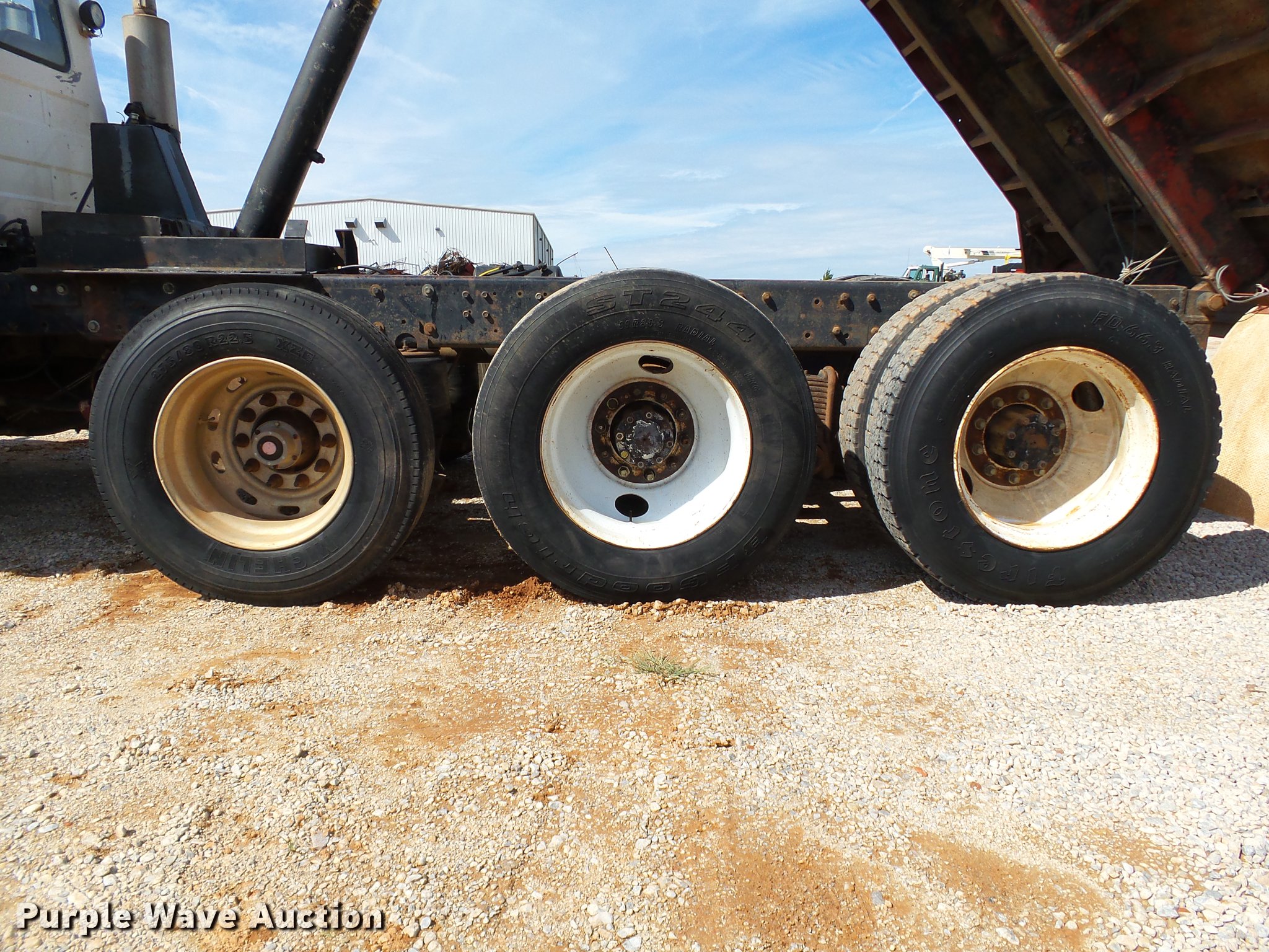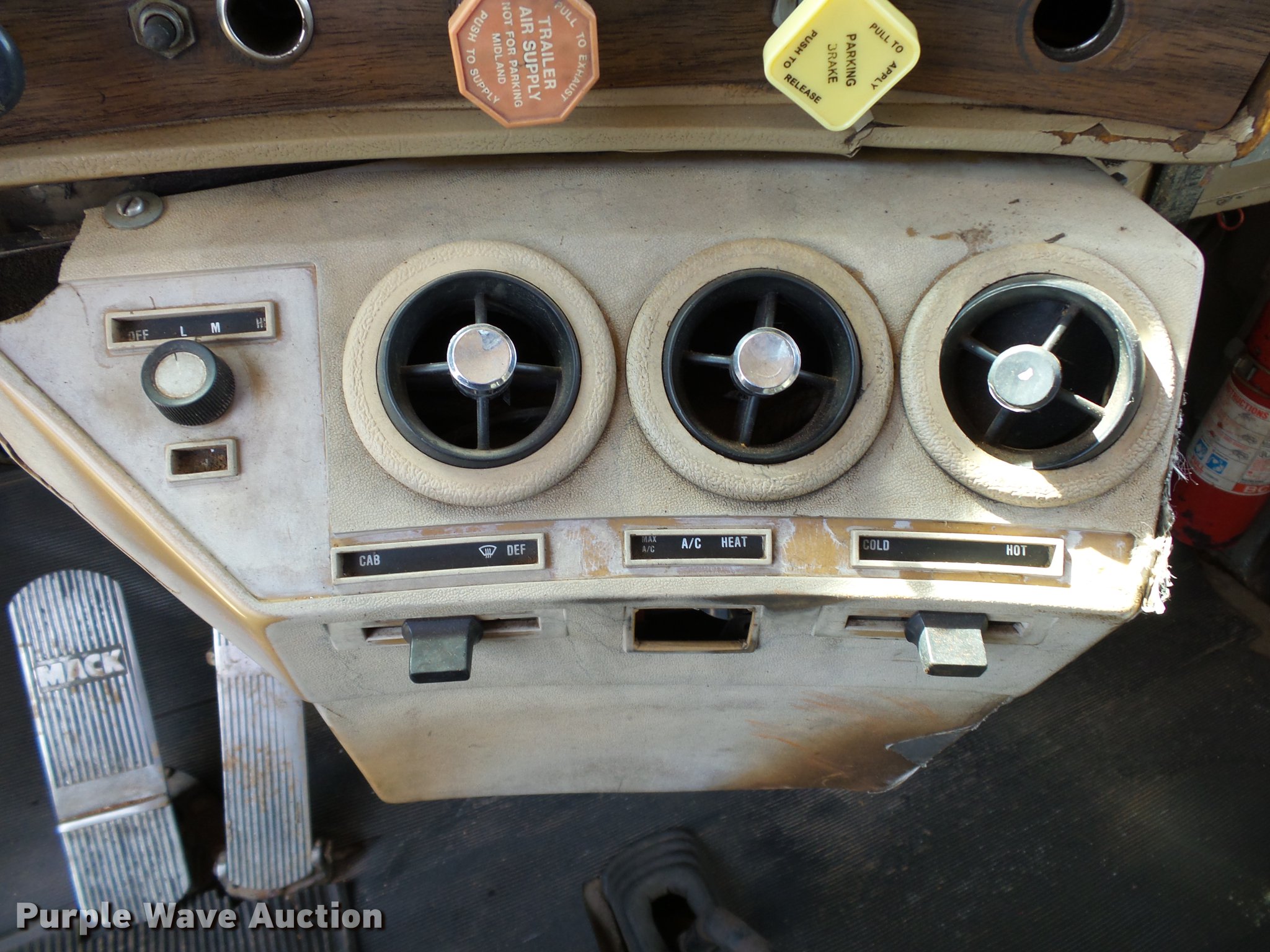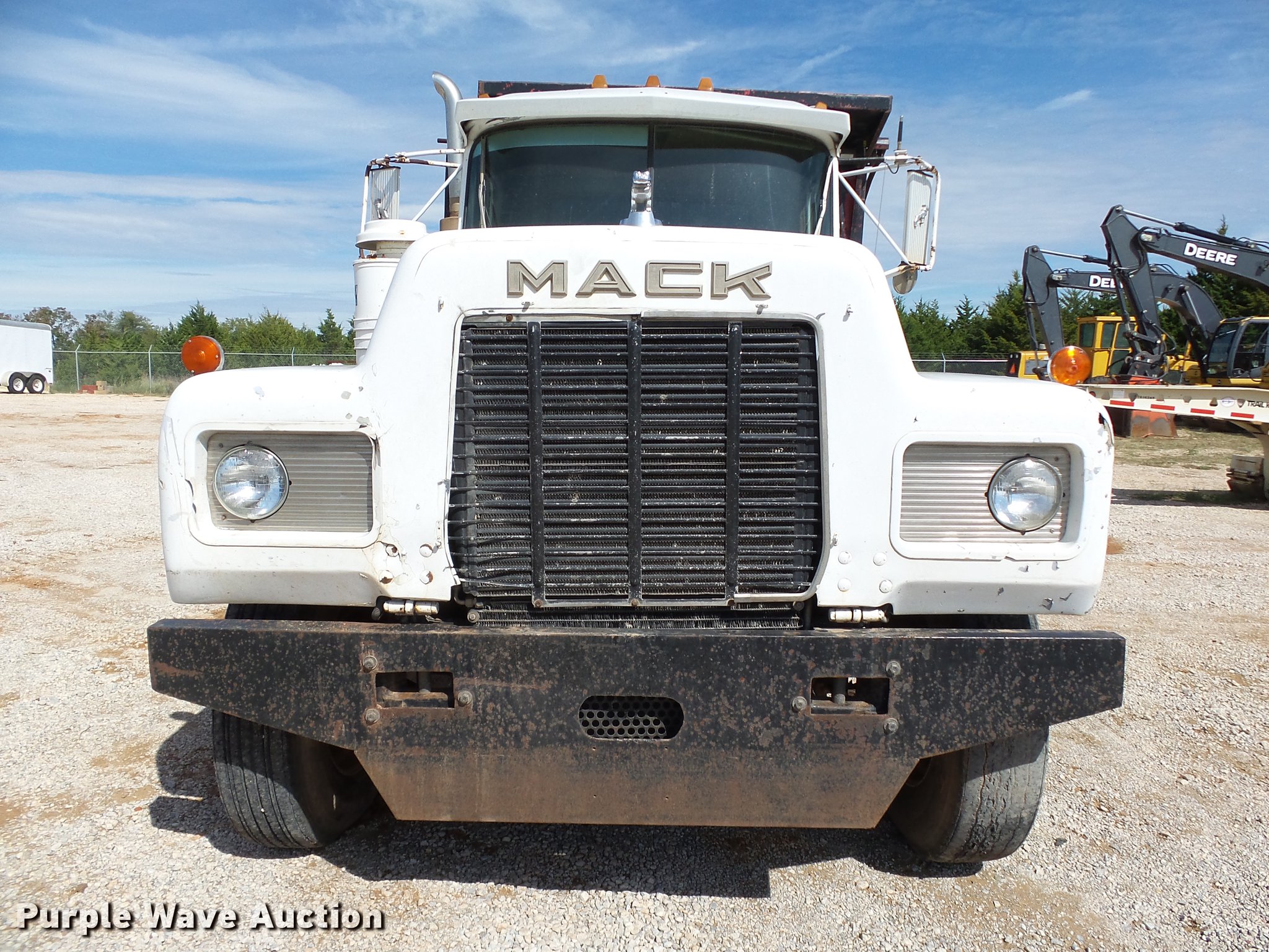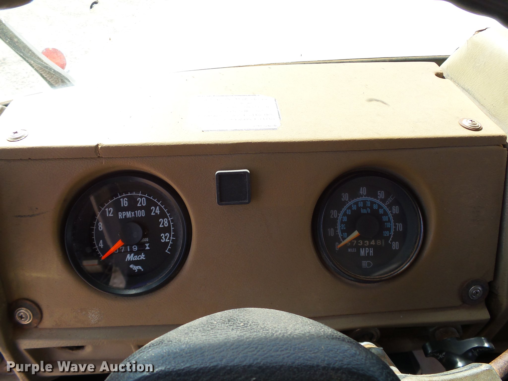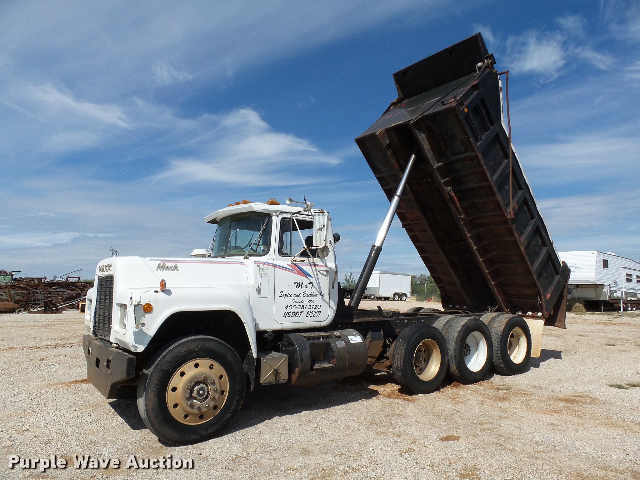 Purple Wave is selling a used Construction Dump Truck in Oklahoma. This item is a 1985 Mack R686ST dump truck with the following: 673,348 miles on odometer, 719 hours on meter, 1,156 hours on meter, Mack EM6-300 six cylinder turbo diesel engine, 300 HP, 10 speed manual transmission, Triple axle, Full differential lock, AC and heat, AM/FM/CD, Air suspension seat, Air ride cab, Front tow hooks, Exterior visor, PTO, Wet kit, 15'L x 96"W steel dump bed, 42" side height, Single ram hoist, Roll tarp, Air operated end gate, Single rear exhaust stack, Dual fuel tanks, Mud flaps, Pintle hitch, Trailer wiring, 208" wheelbase, Camelback suspension, Air brakes, 11R24.5 front tires, 275/80R22. rear tires