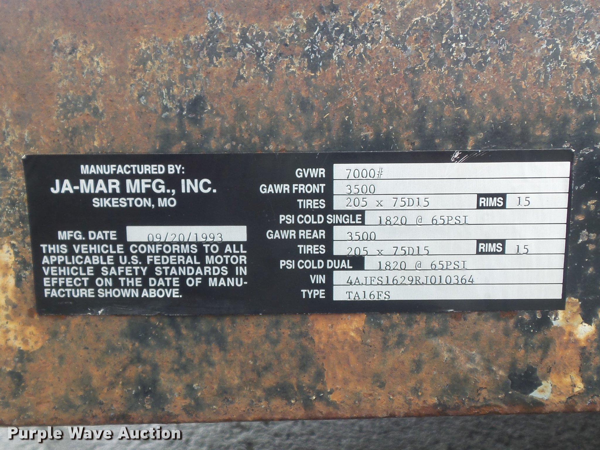 Purple Wave is selling a used Car or Utility Trailer in Illinois. This item is a 1994 Ja-Mar TA16FS utility trailer with the following: 20'7" overall length, 16'L x 77"W deck, 21" floor height, 4'L ramps, Single leg landing gear, 2" ball hitch, Spring suspension, Hydraulic brakes, Steel wheels, ST205/75R15 tires, GVWR 7,000 lbs, GAWR 3,500 lbs