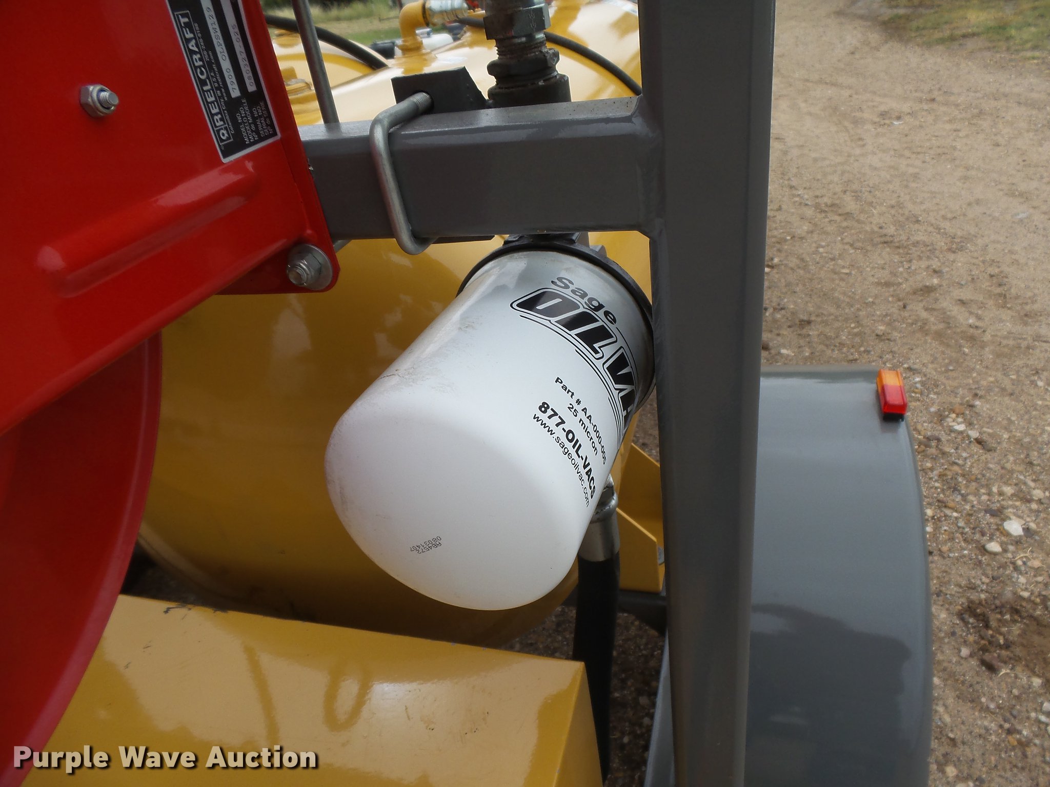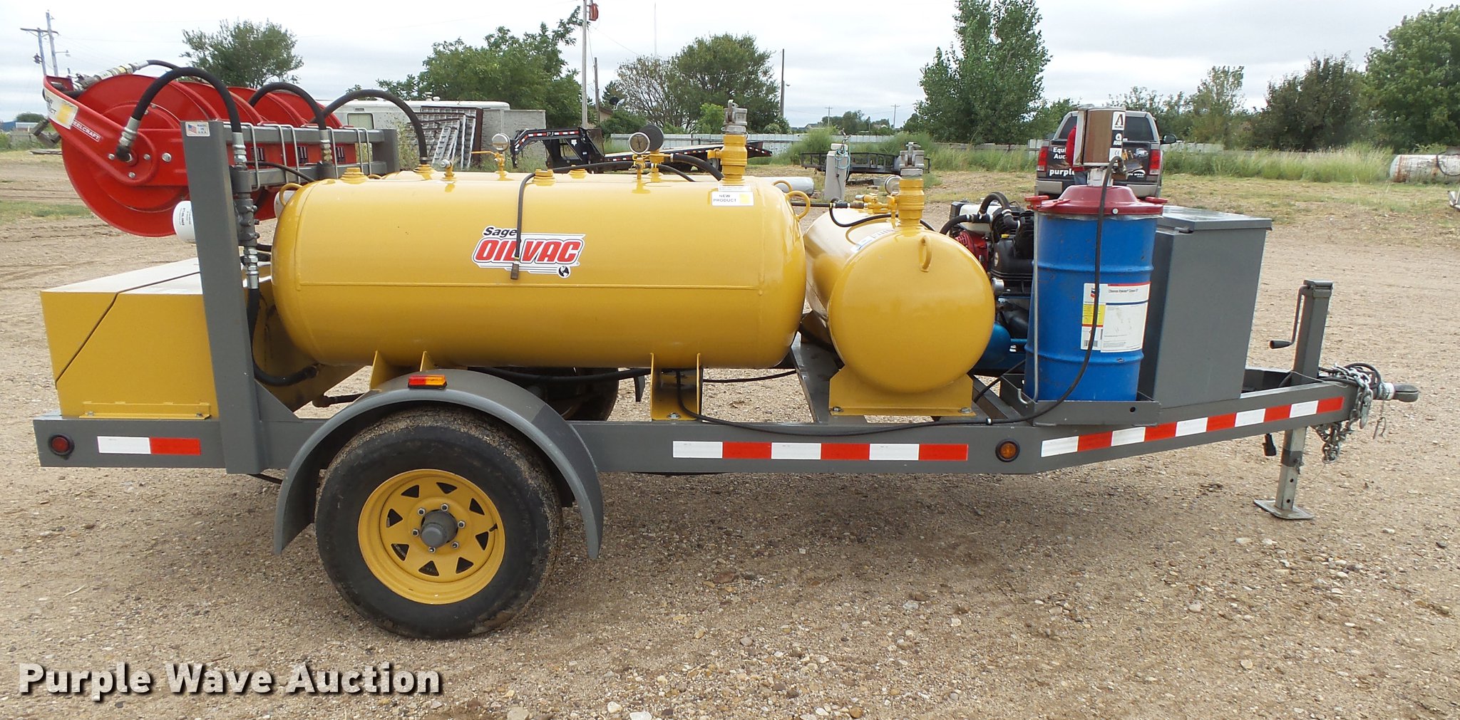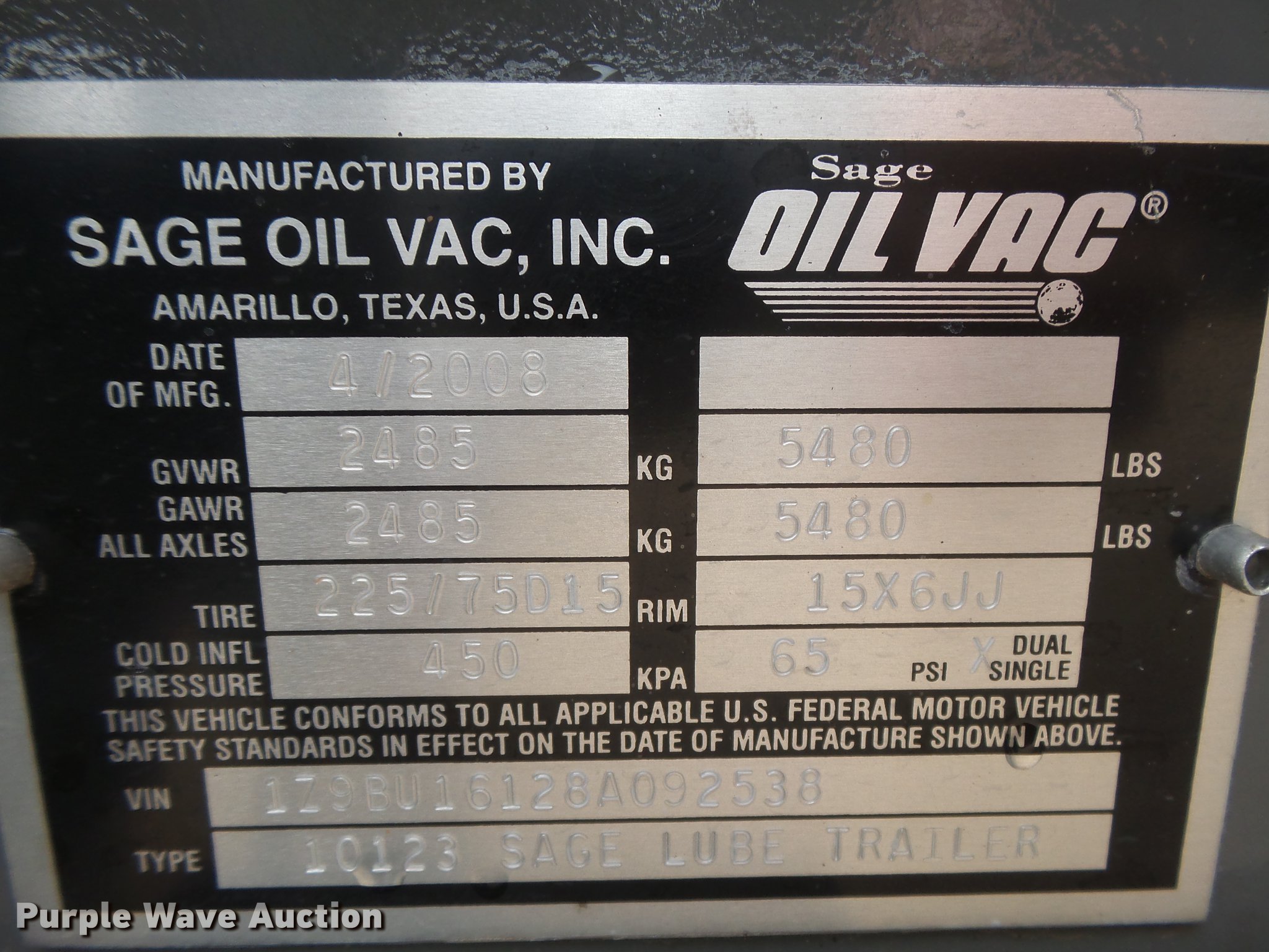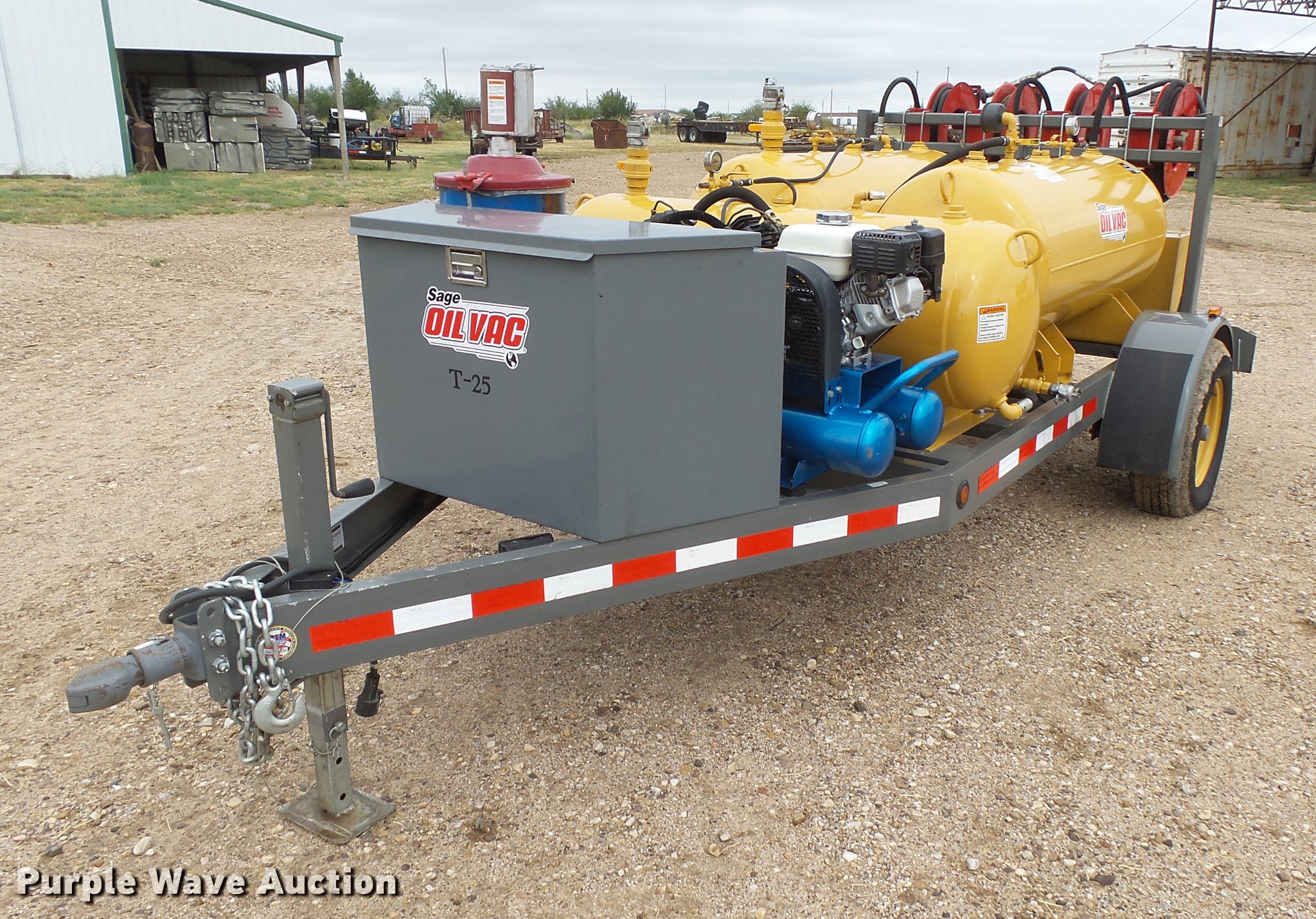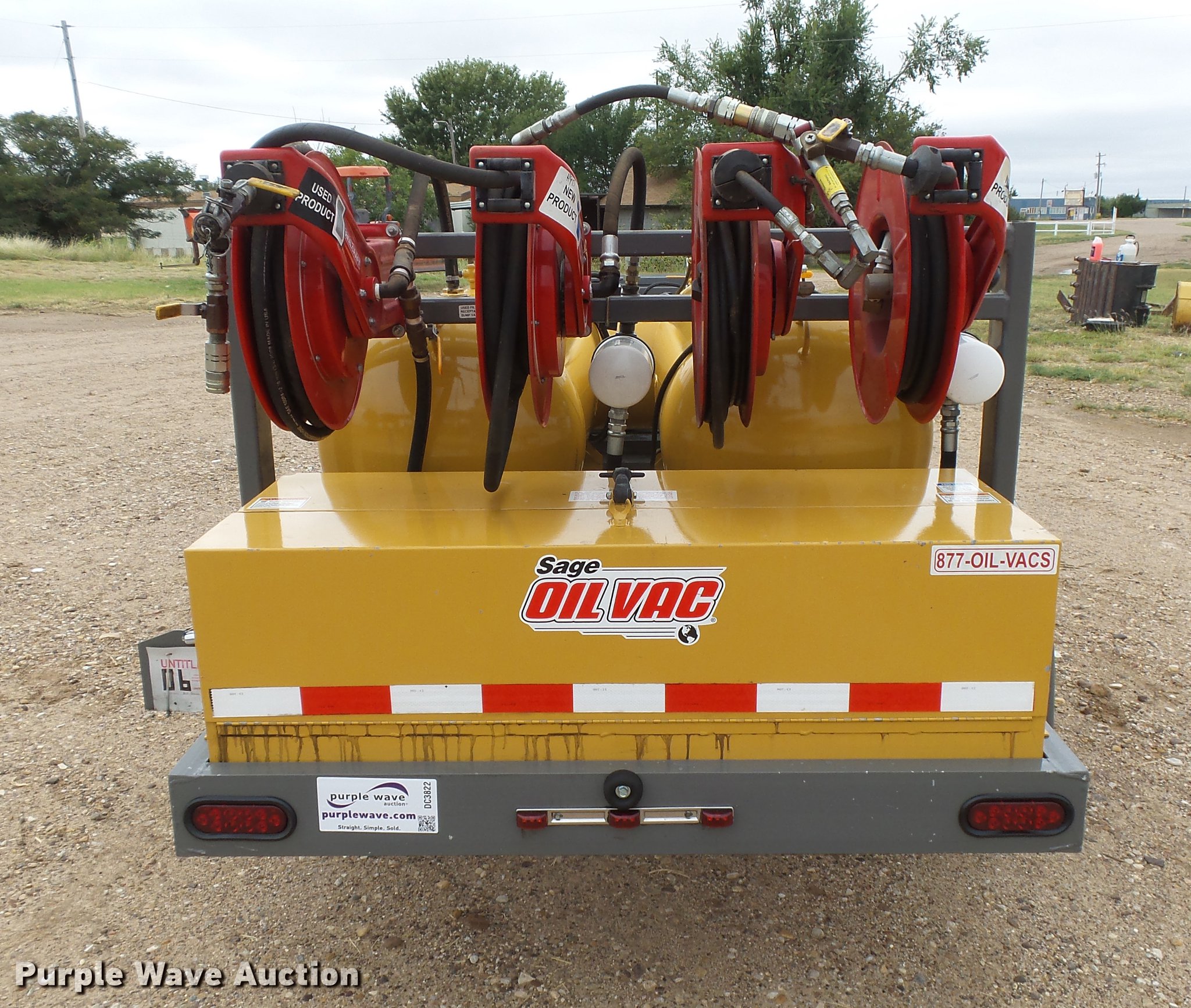 Purple Wave is selling a used Tank Trailer in Oklahoma. This item is a 2008 Sage Oil Vac 10123 tank trailer with the following: 16'L x 5'W, 7'W fender to fender, 120 gallon used oil tank, 120 gallon new oil tank, 80 gallon new oil tank, (4) Reel Craft hose reels, Rear used filter drain storage, 120 lbs barrel of Chevron grease, Alemite air pump dispenser, Puma air compressor, Honda GX160 single cylinder gas engine, Storage box, 2 5/16" ball hitch, Spring suspension, Electric brakes, ST225/75D15 tires, GVWR 2,485 lbs, Unit# T-25