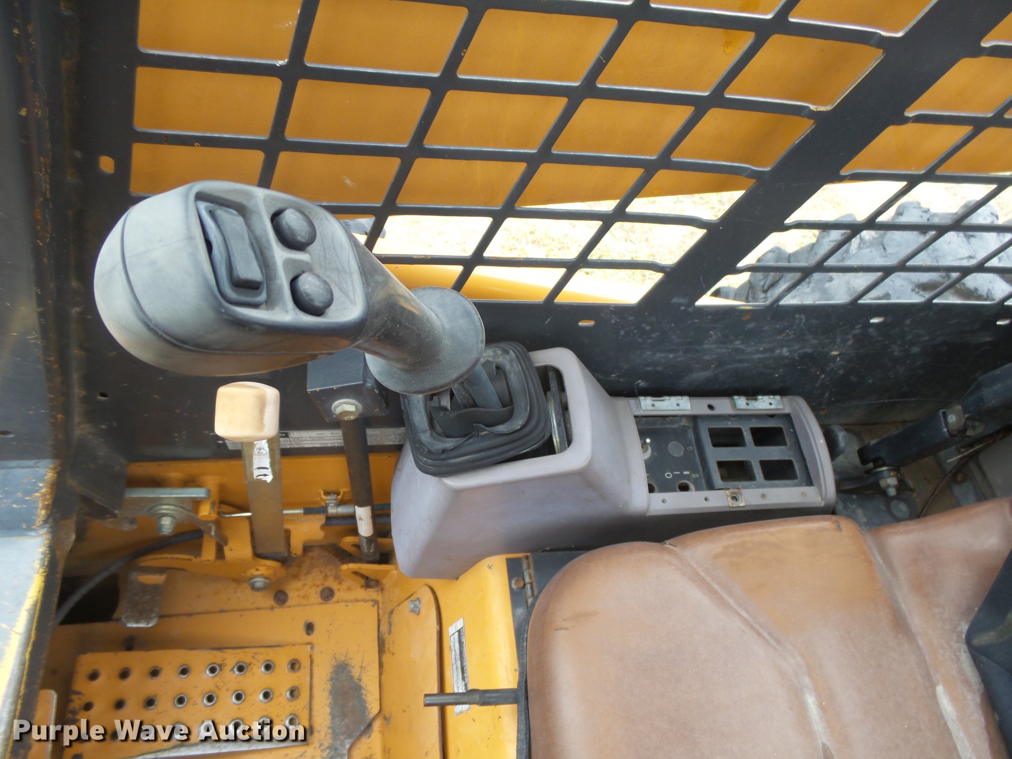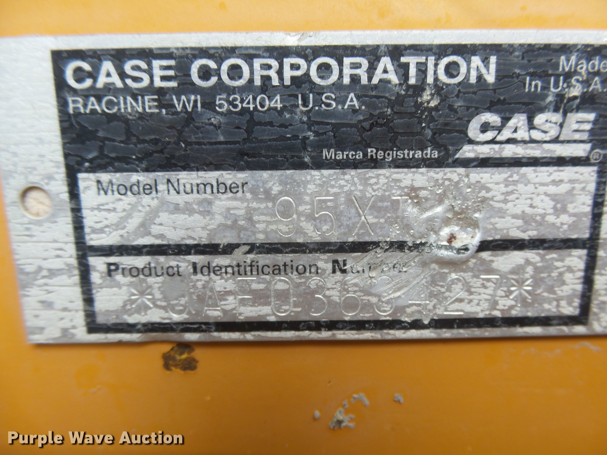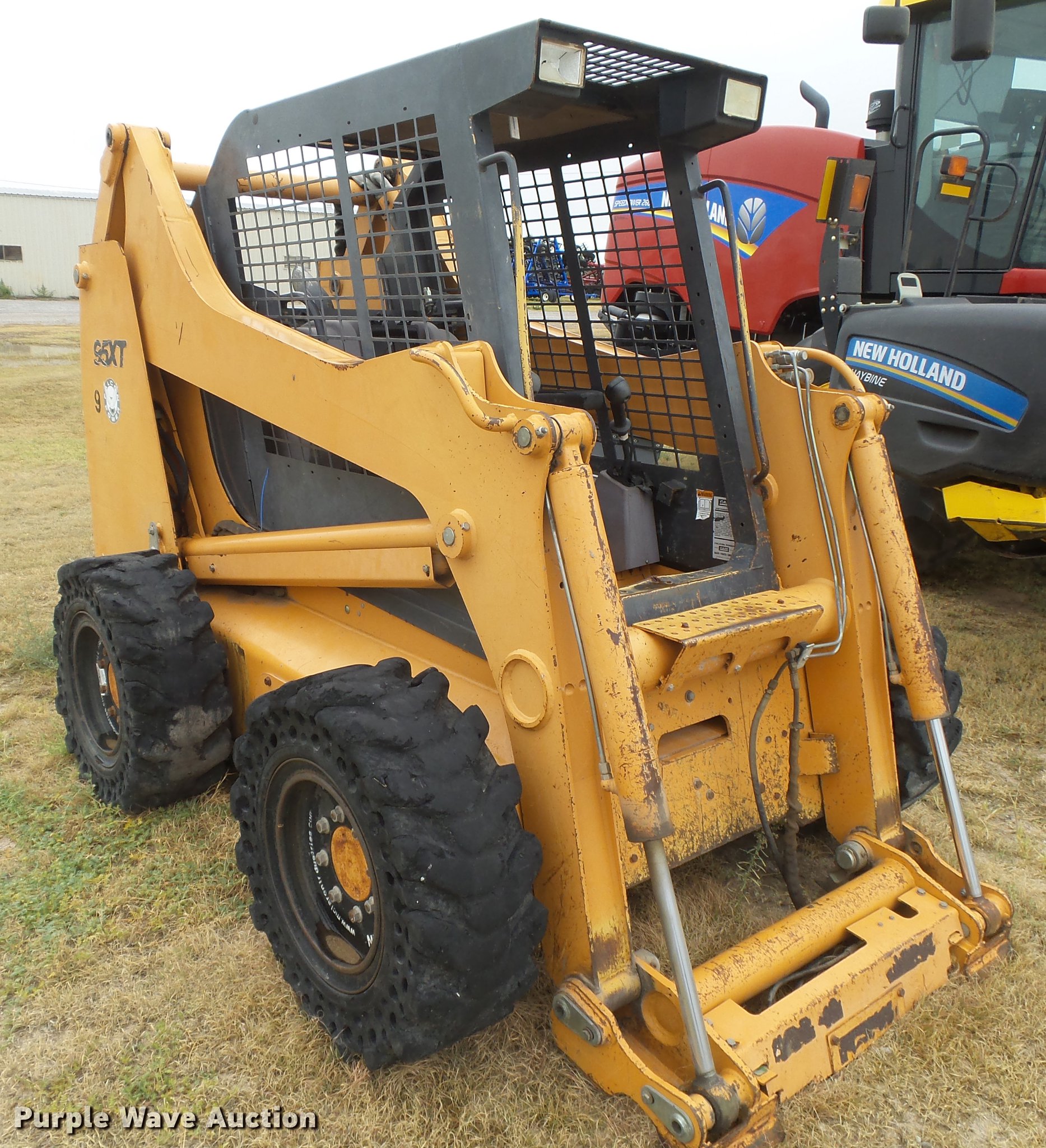 Purple Wave is selling a used Skid Steer Loader in Kansas. This item is a 2003 Case 95XT skid steer with the following: 3,557 hours on meter, four cylinder turbo diesel engine, Hydrostatic transmission, Open station/canopy, Joystick controls, Spring suspension seat, Front work lights, Backup alarm, Hydraulic quick coupler, Auxiliary hydraulics, 33 x 12-16 solid tires, Non-operational unit, Possible timing issue, Front left tire spins on wheel, Wheel welded, Serial JAF0363427