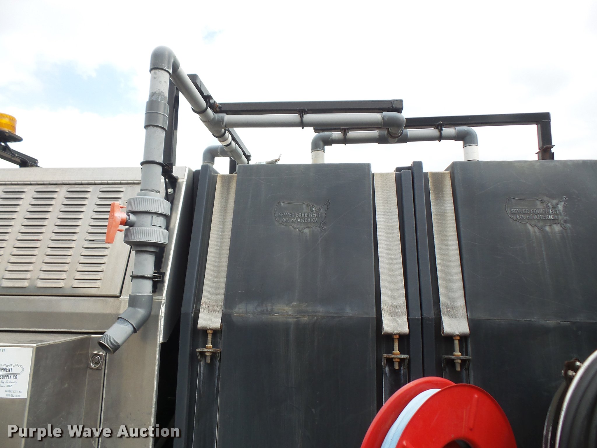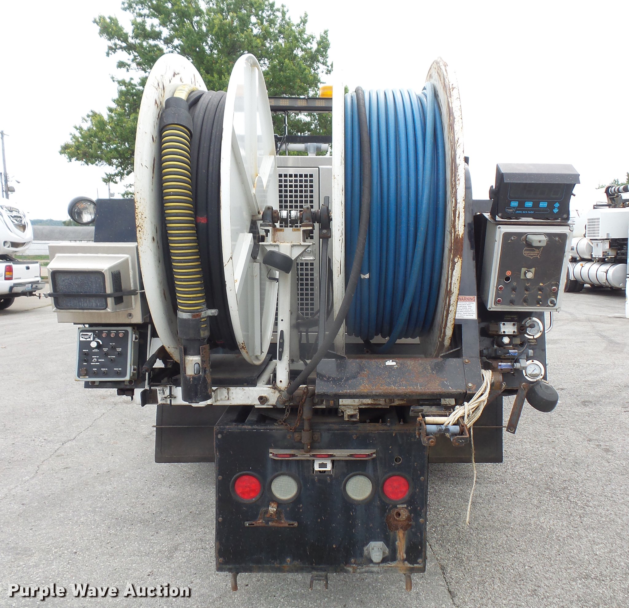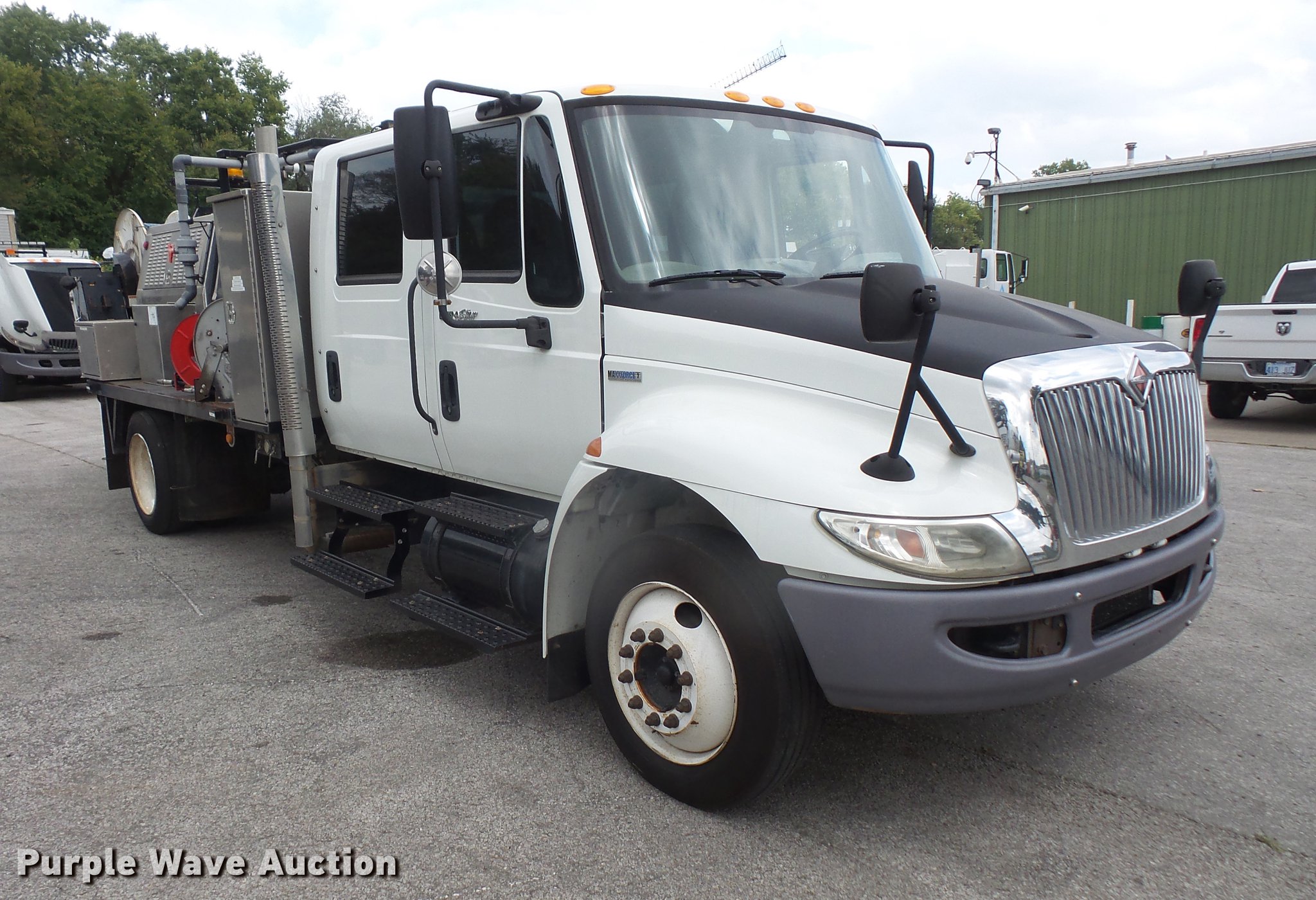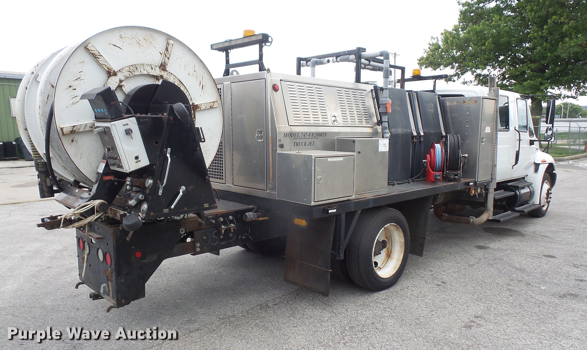 Purple Wave is selling a used Vacuum Truck in Kansas. This item is a 2009 International DuraStar 4300 jetter truck with the following: 129,432 miles on odometer, 13,749 hours on meter, International MaxxForce 7 6.4L V8 turbo diesel engine, Allison automatic transmission, Single axle, AC and heat, air suspension seat, PTO, Beacon light, 10'7"L bed, Model 747-FR2000TV truck jet, (2) hose reels, Smart counter, Hydraulic hose reel, 700 gallon water capacity, (2) poly tanks, 350 gallon capacity,, Toolbox, Single fuel tank, Single exhaust stack, Spring suspension, Air brakes, 255/70R22.5 tires, GVWR 25,500 lbs, Engine warning indicator on