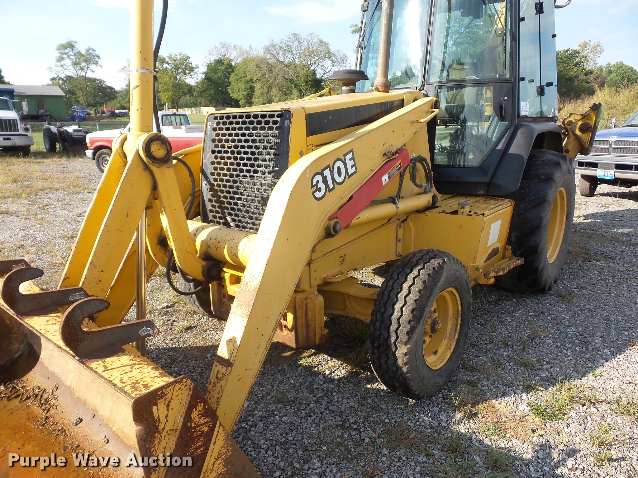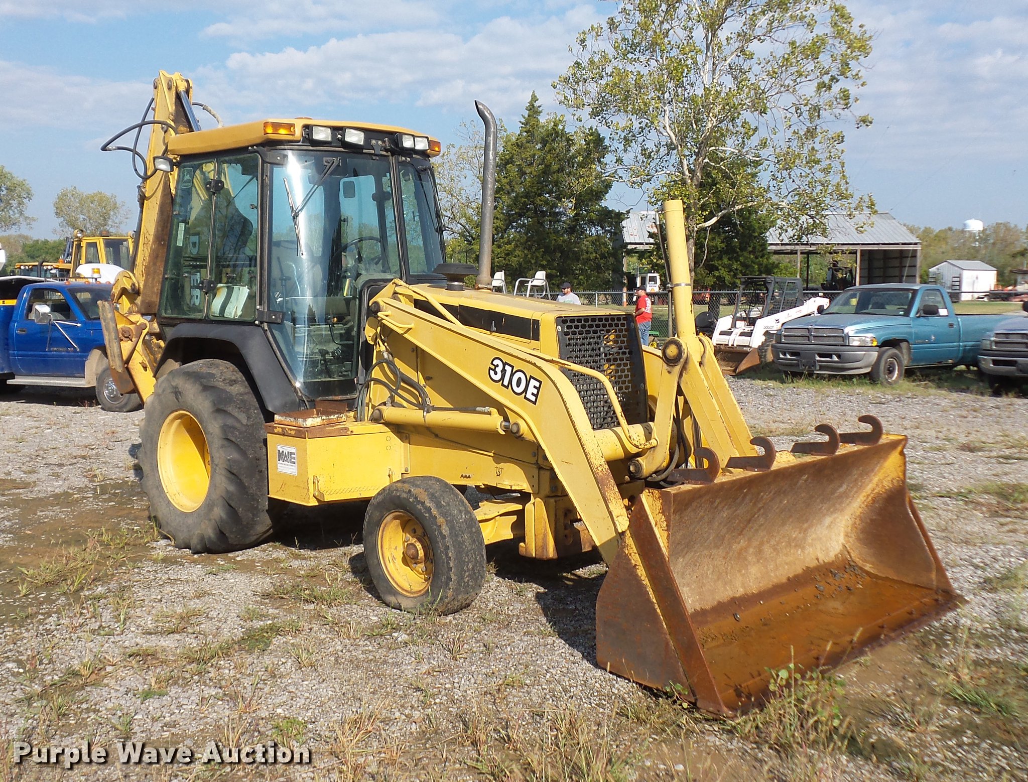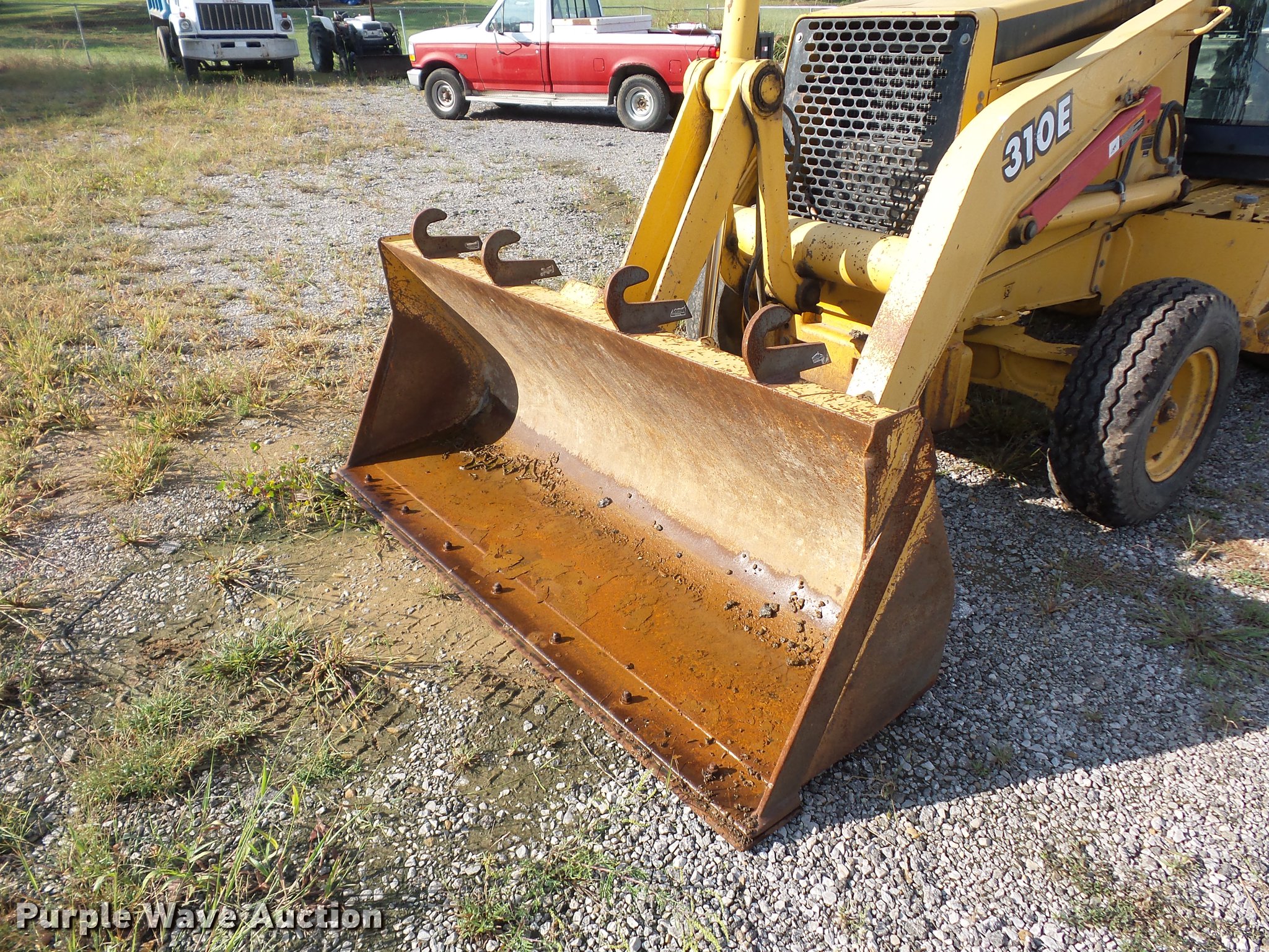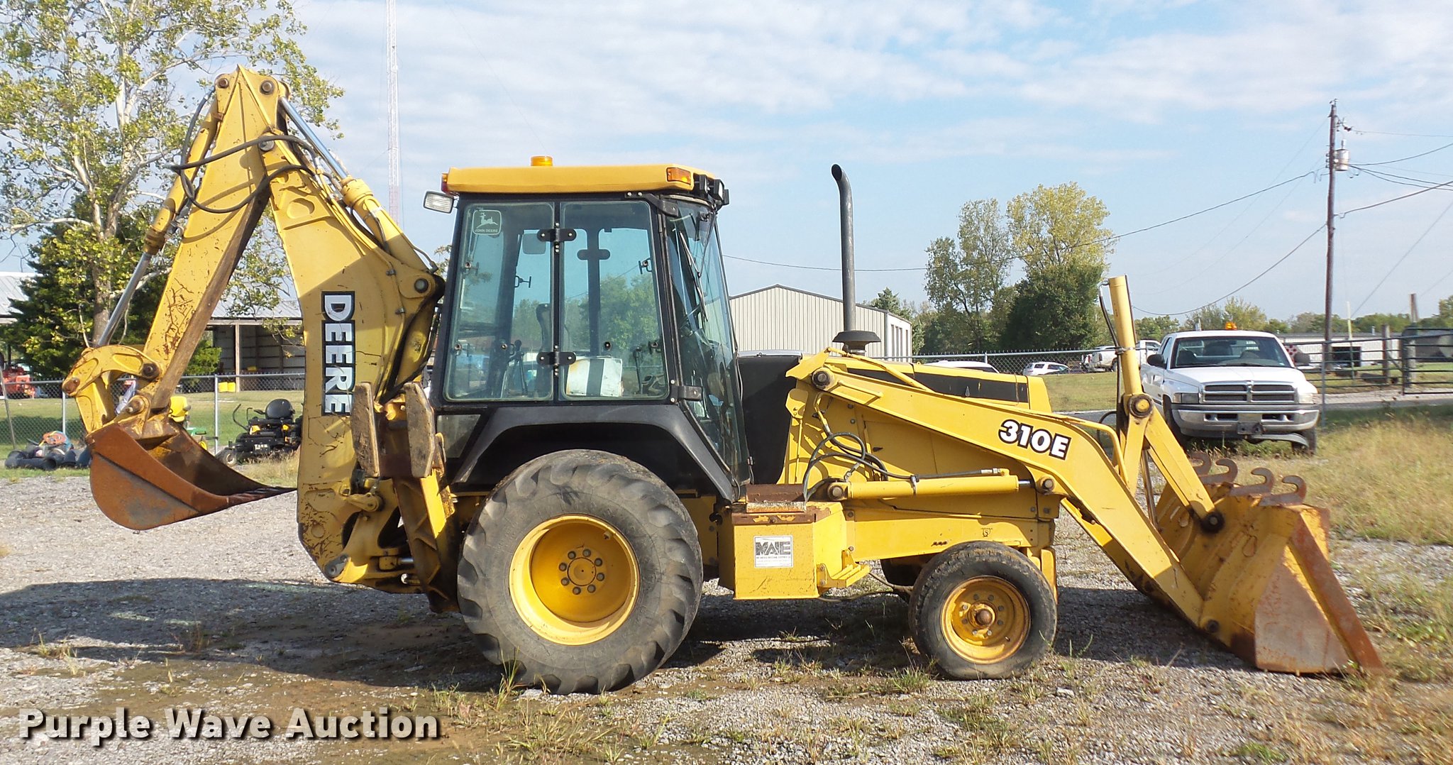 Purple Wave is selling a used Tractor Loader Backhoe in Missouri. This item is a 1997 John Deere 310E backhoe with the following: 3,714 hours on meter, John Deere four cylinder turbo diesel engine, Shuttle shift transmission, 4F-4R gears, EROPS, Heat, Wobble stick backhoe controls, Front and rear work lights, 84"W loader bucket, Joystick loader control, 24"W backhoe bucket, (5) teeth, 11-16 front tires, 19.5-24 rear tires, One tire low, Serial T0310EX832970