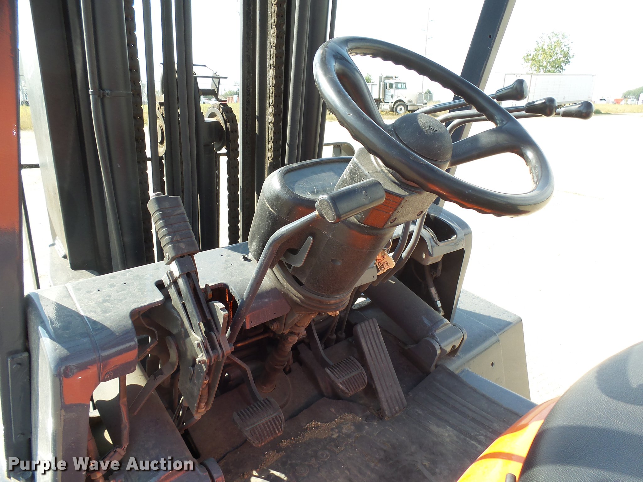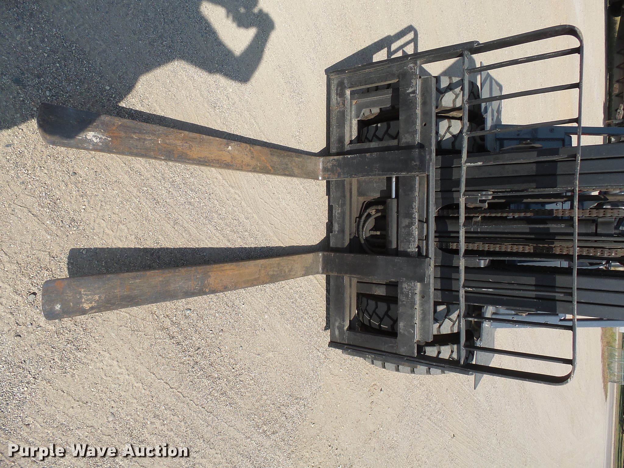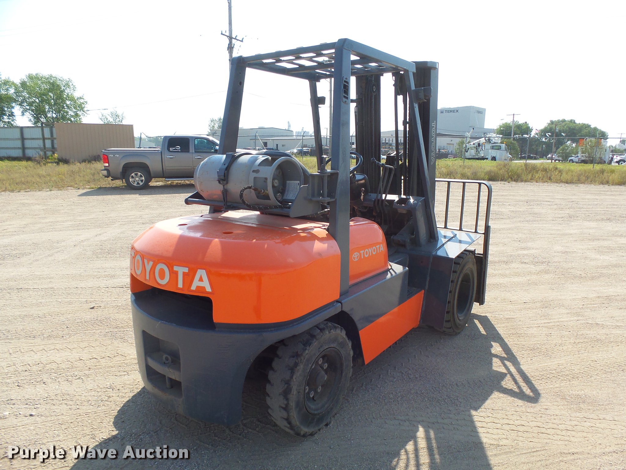 Purple Wave is selling a used Strt. Mast Rough Terr. Forklift in South Dakota. This item is a 1997 Toyota forklift with the following: 5,384 hours on meter, GM V6 propane engine, Hydrostatic transmission, 8,000 lbs maximum lift capacity, Side shift, Mast tilt, 56.5"L x 5"W forks, 5'W x 4'H carriage, 7.00-15 tires, Serial 506FGU35-60149