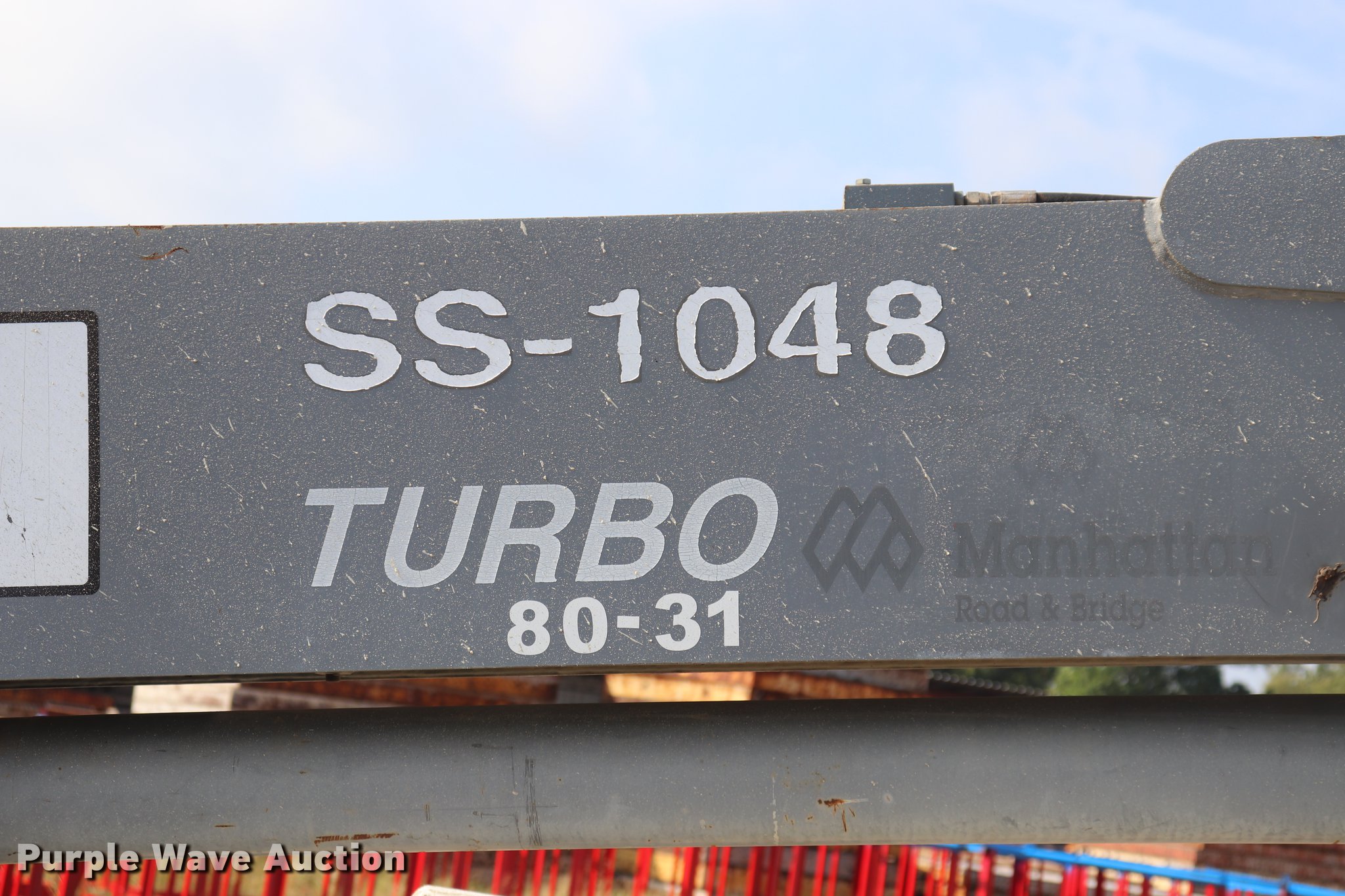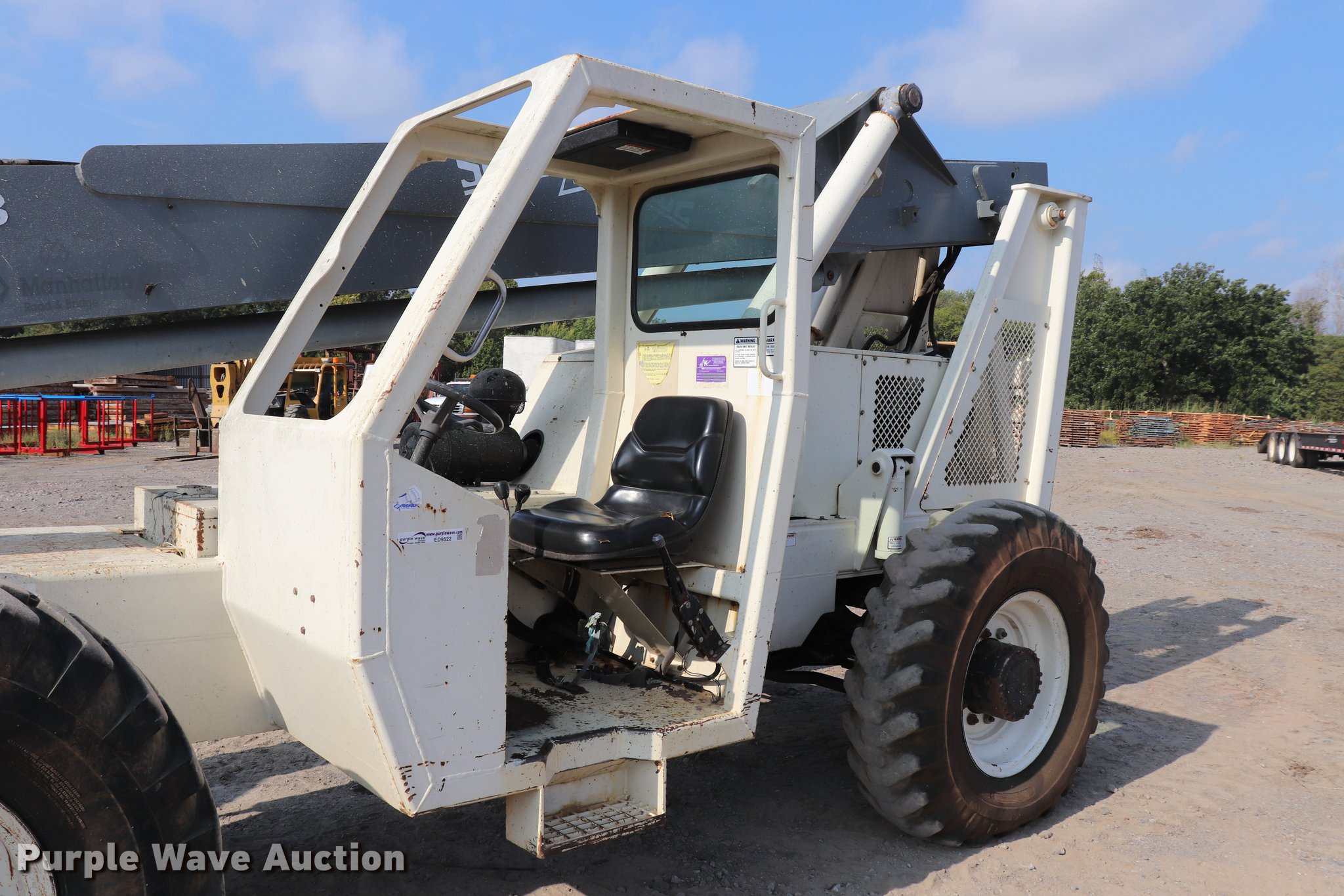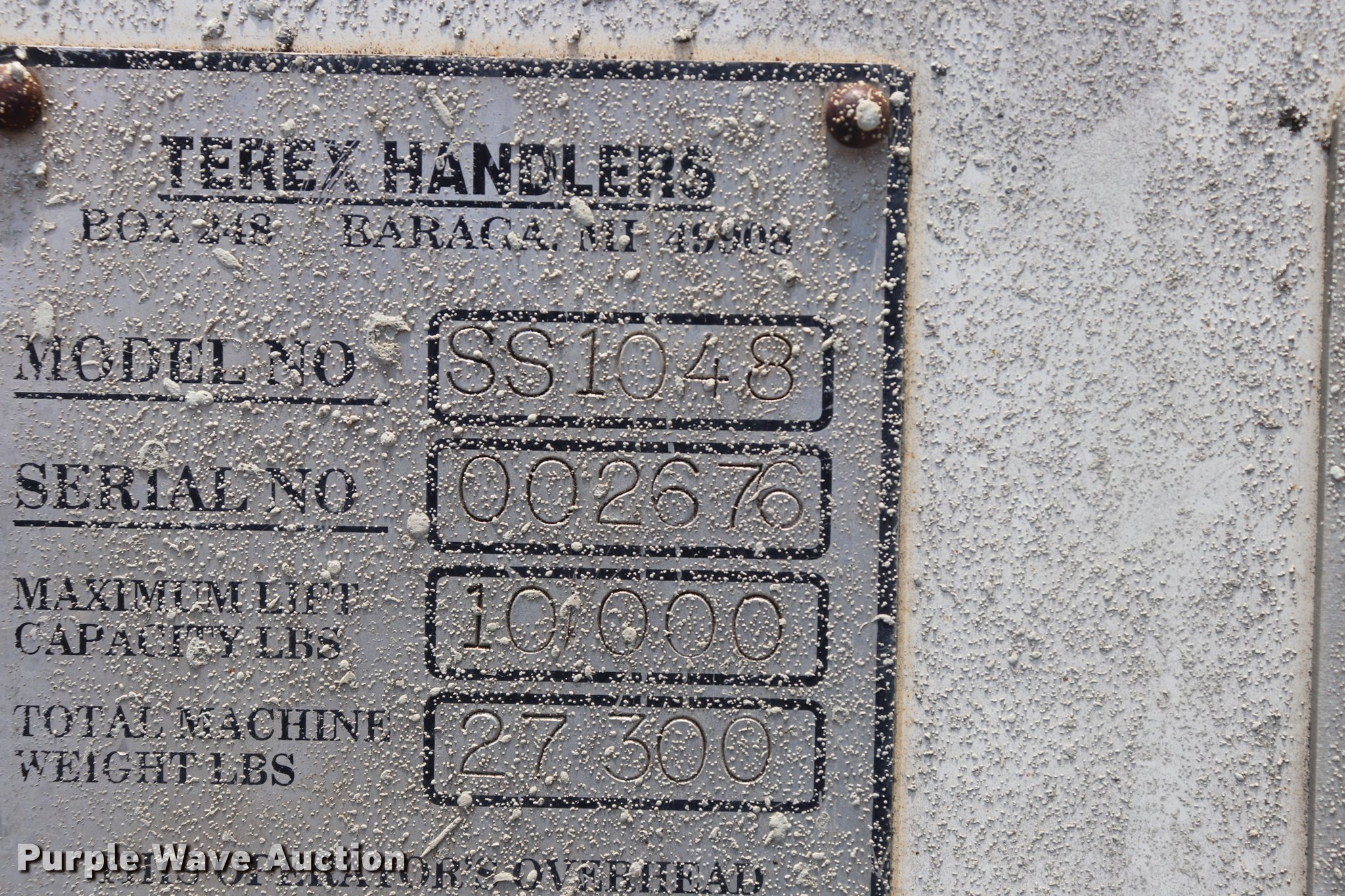 Terex SS1048 telehandler. 4,796 hours on meter, Four cylinder turbo diesel engine, Shuttle shift transmission 3F-3R gears, Canopy, Backup alarm, Crab steering, Four wheel steering, 10,000 lbs max lift capacity, 48' max lift height, 30' max reach length, Three boom sections, 48" fork length, Hydraulic leveling, Hydraulic outriggers, 14.00-24TG foam-filled tires, Serial 002676, Unit# 80-31. Manhattan Road & Bridge. 5429 E. Hancock. Muskogee, OK 74403
