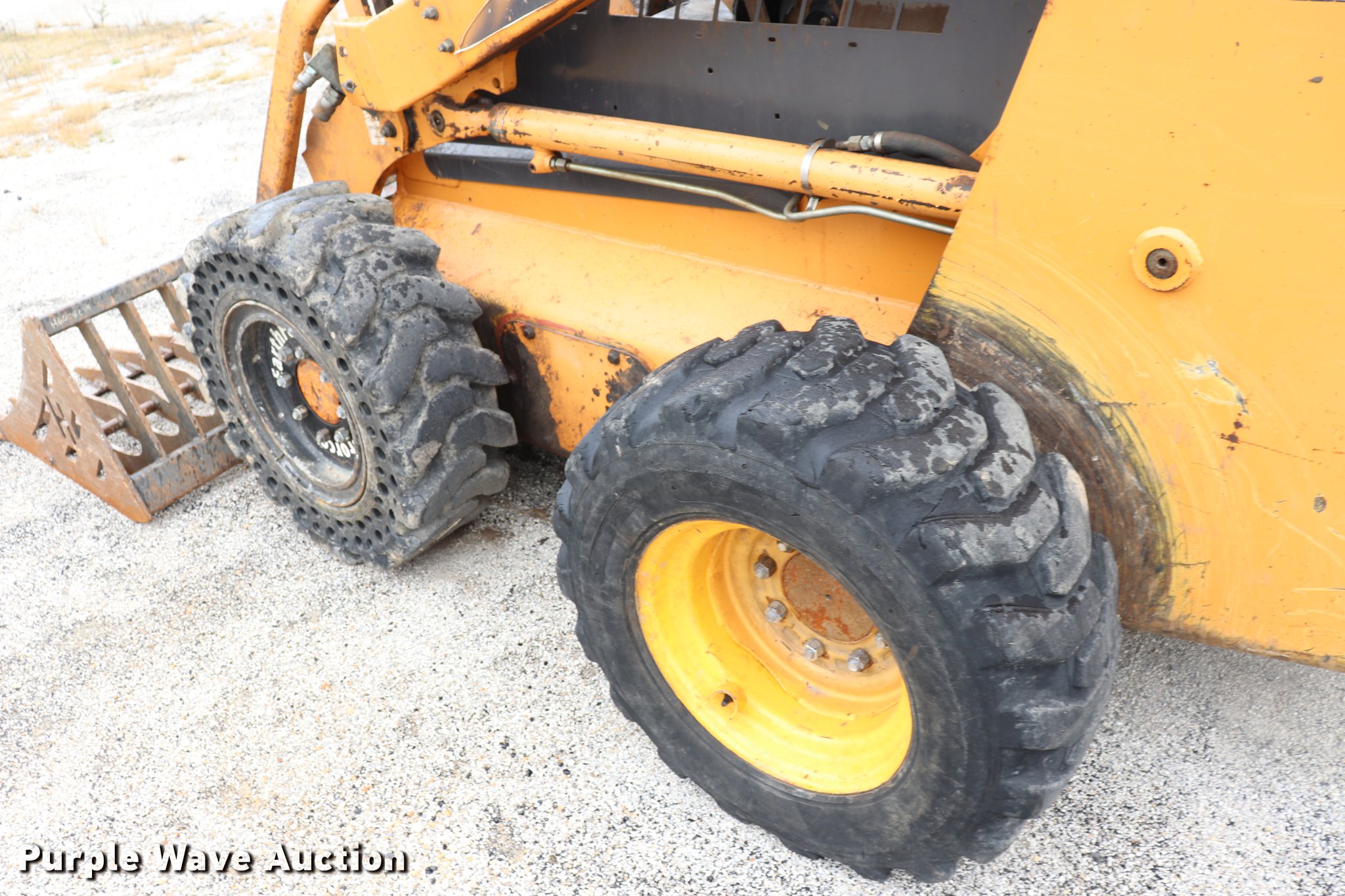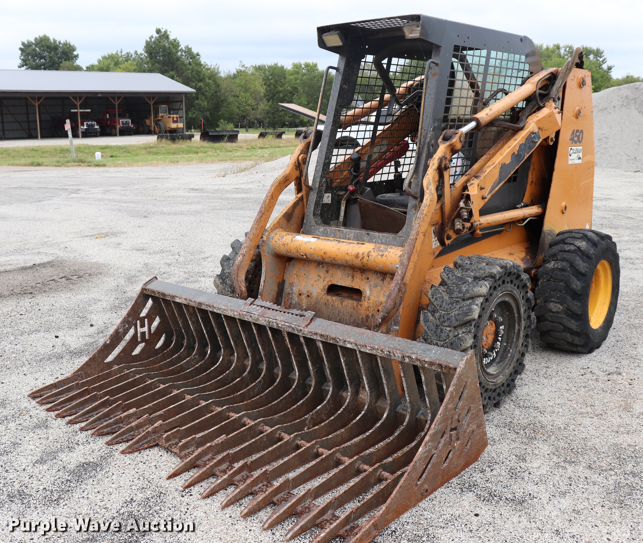 Purple Wave is selling a used Skid Steer Loader in Kansas. This item is a Case 450 skid steer with the following: Unknown hours on meter, Four cylinder diesel engine, Hydrostatic transmission, Enclosed cab, Joystick controls, Spring suspension seat, Front work lights, 84"W rock bucket, Manual quick coupler, Auxiliary hydraulics, 12-16.5 tires, Non-operational unit, Serial N5M417805