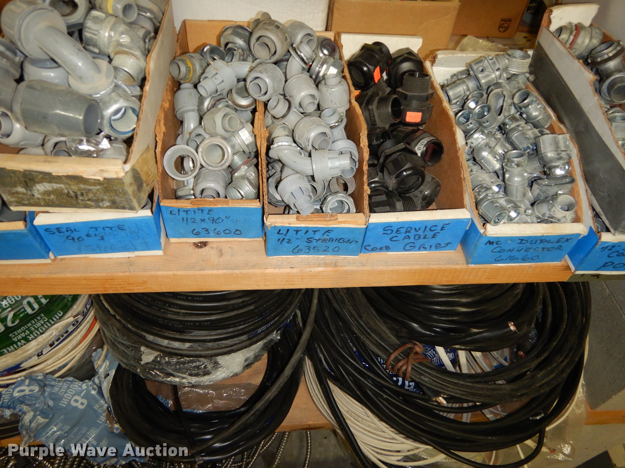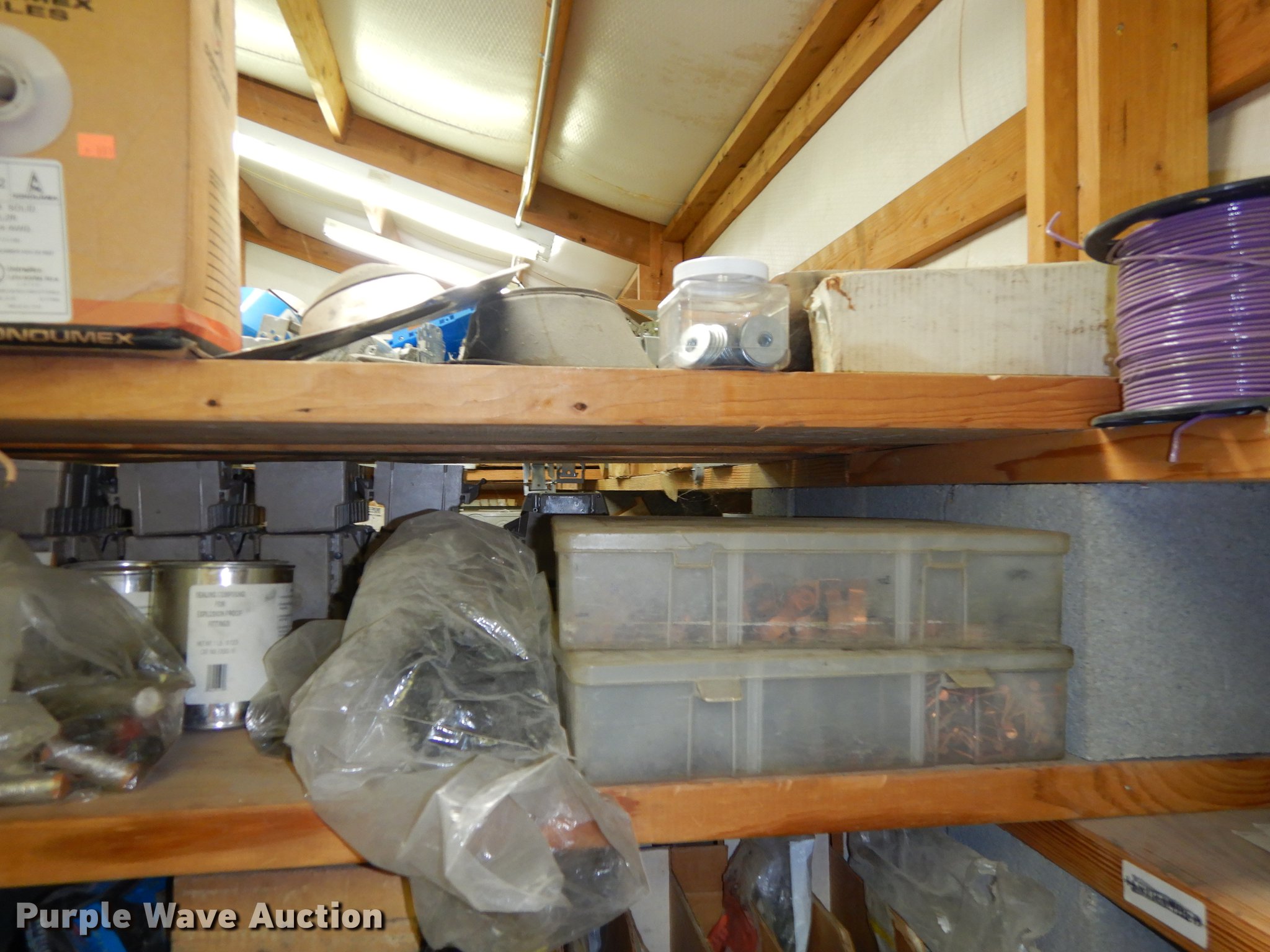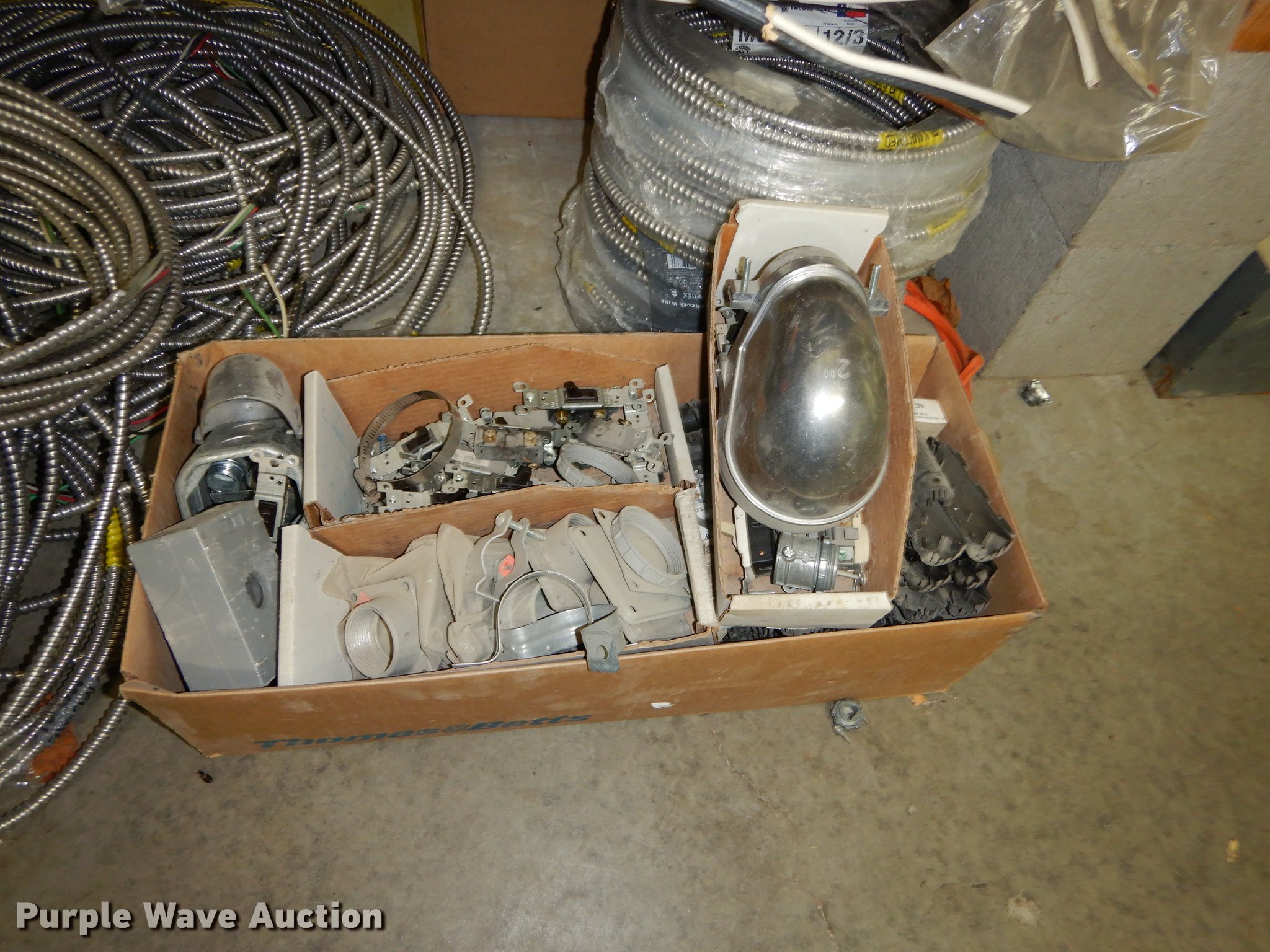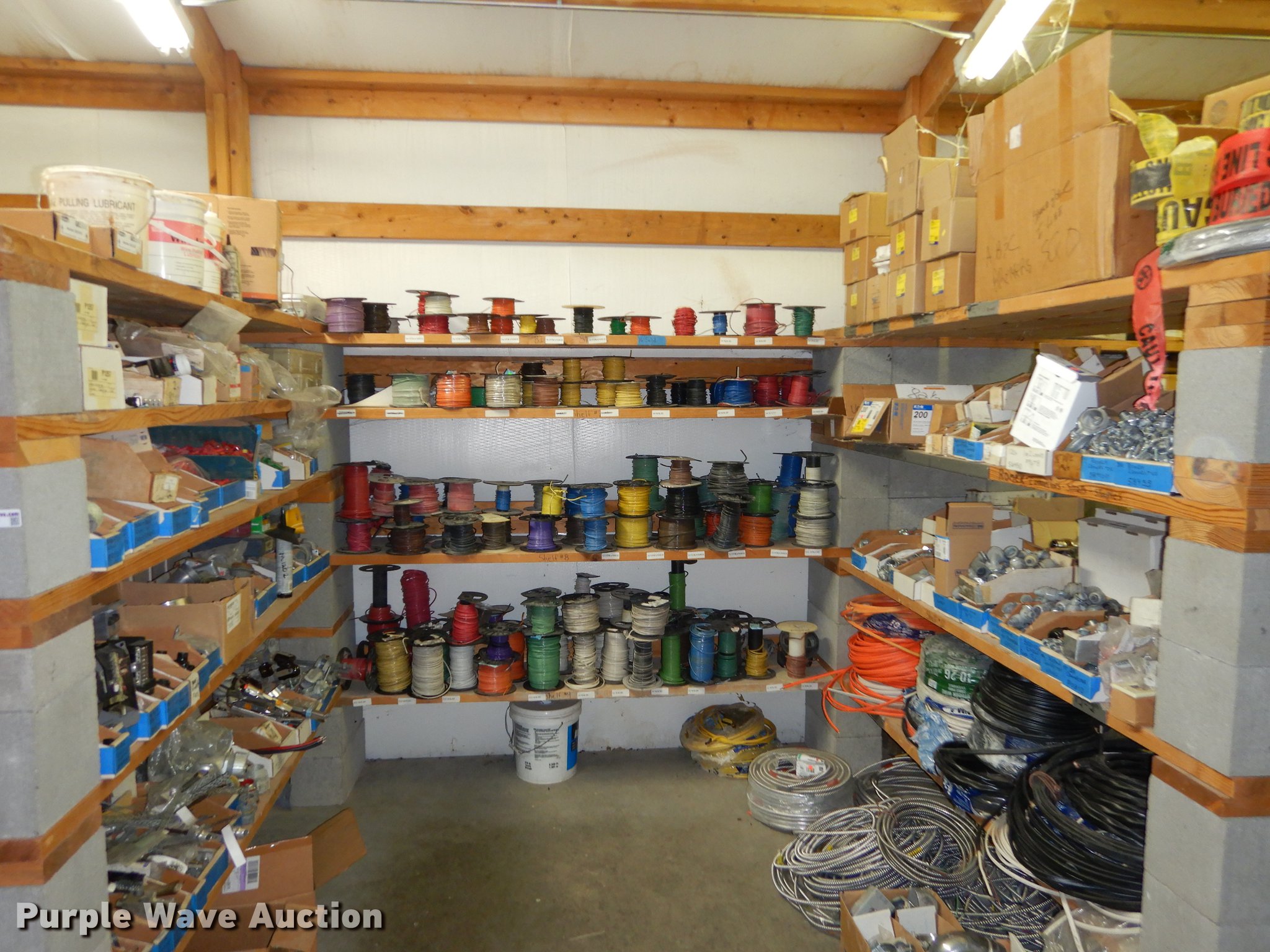 Purple Wave is selling a used Building Materials in Kansas. This item is a Electrical supplies with the following: Ground clamps, Wire pigtail connectors, Insulators, Lubricant, Wire, Romax, Water proof PVC couplers, Metal clad wire, Box connectors, Rolls of caution tape, Circuit breakers, New in box