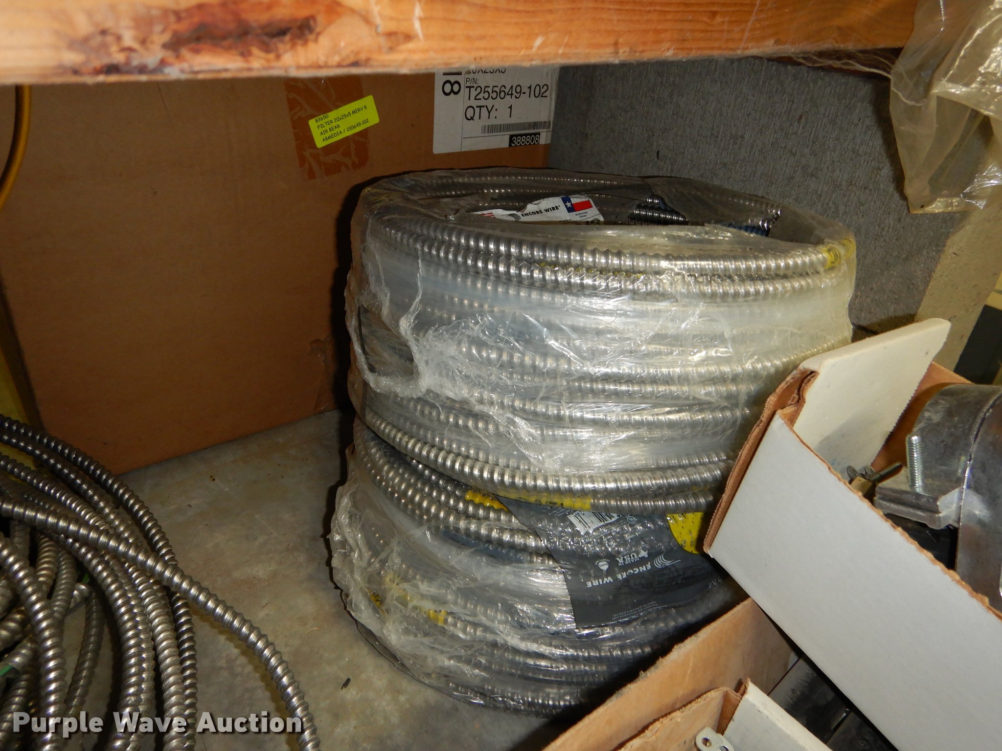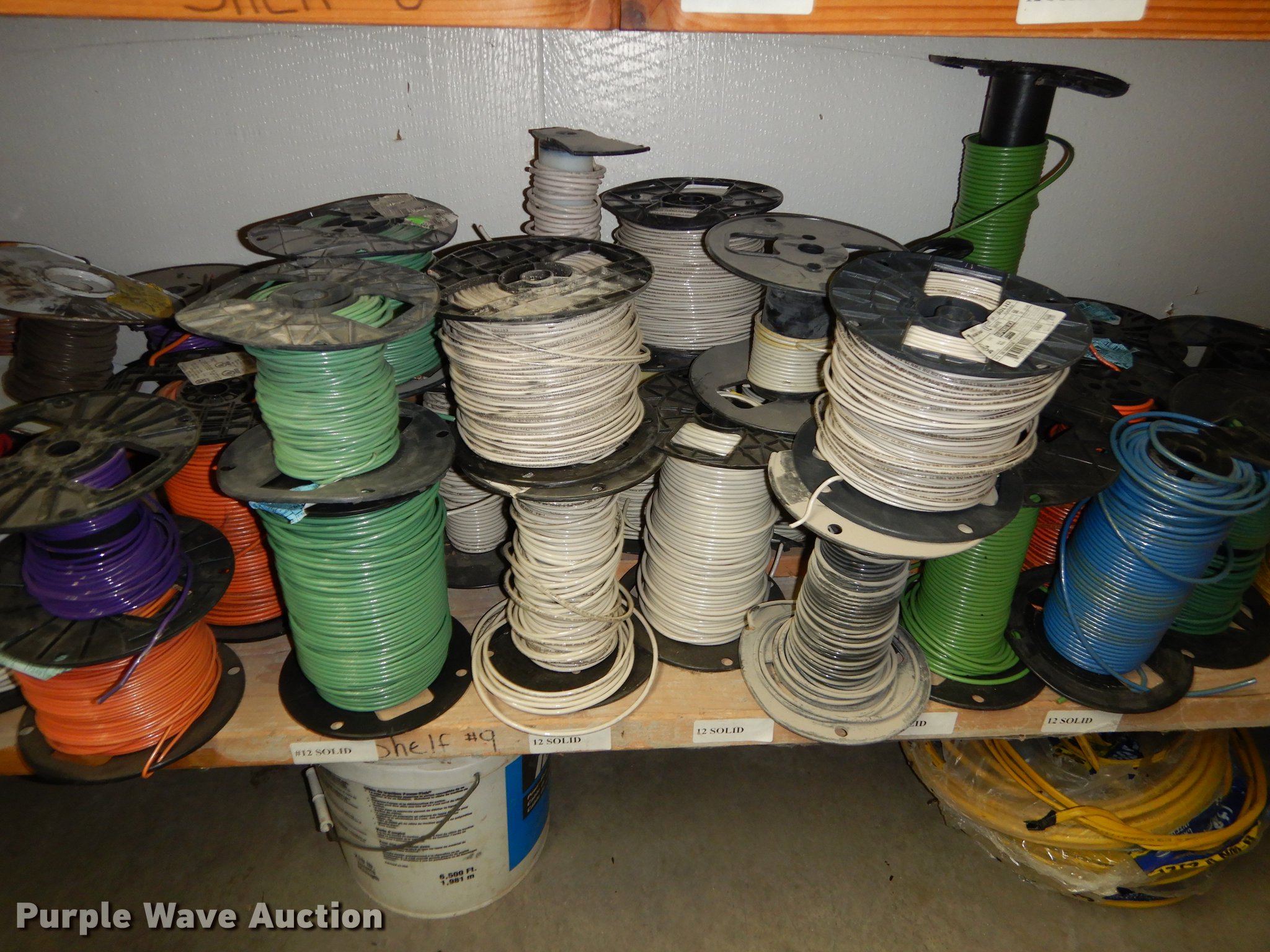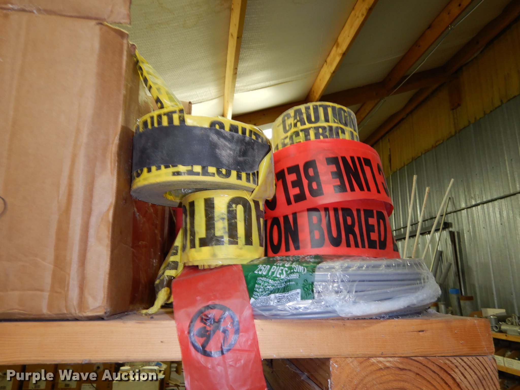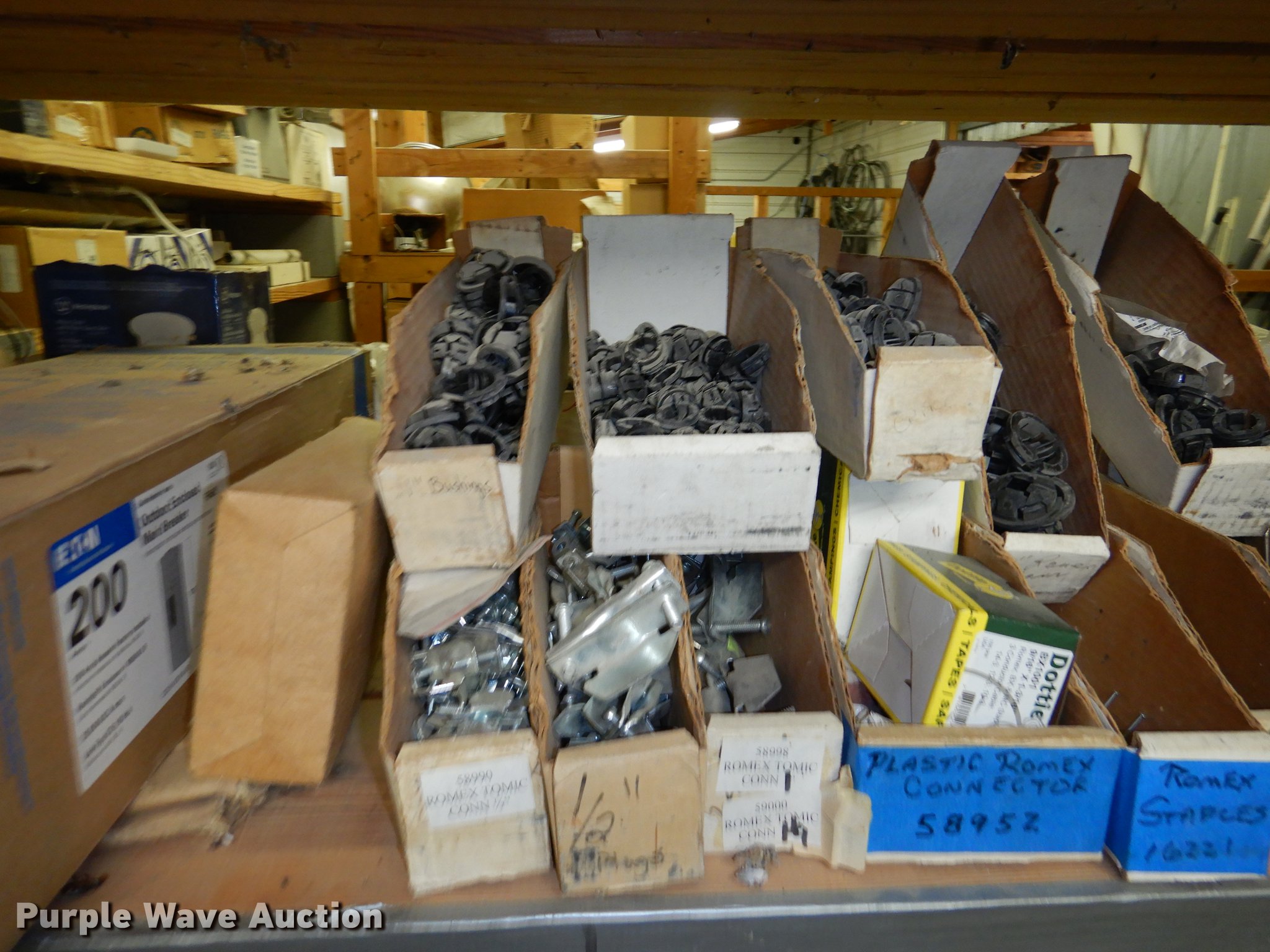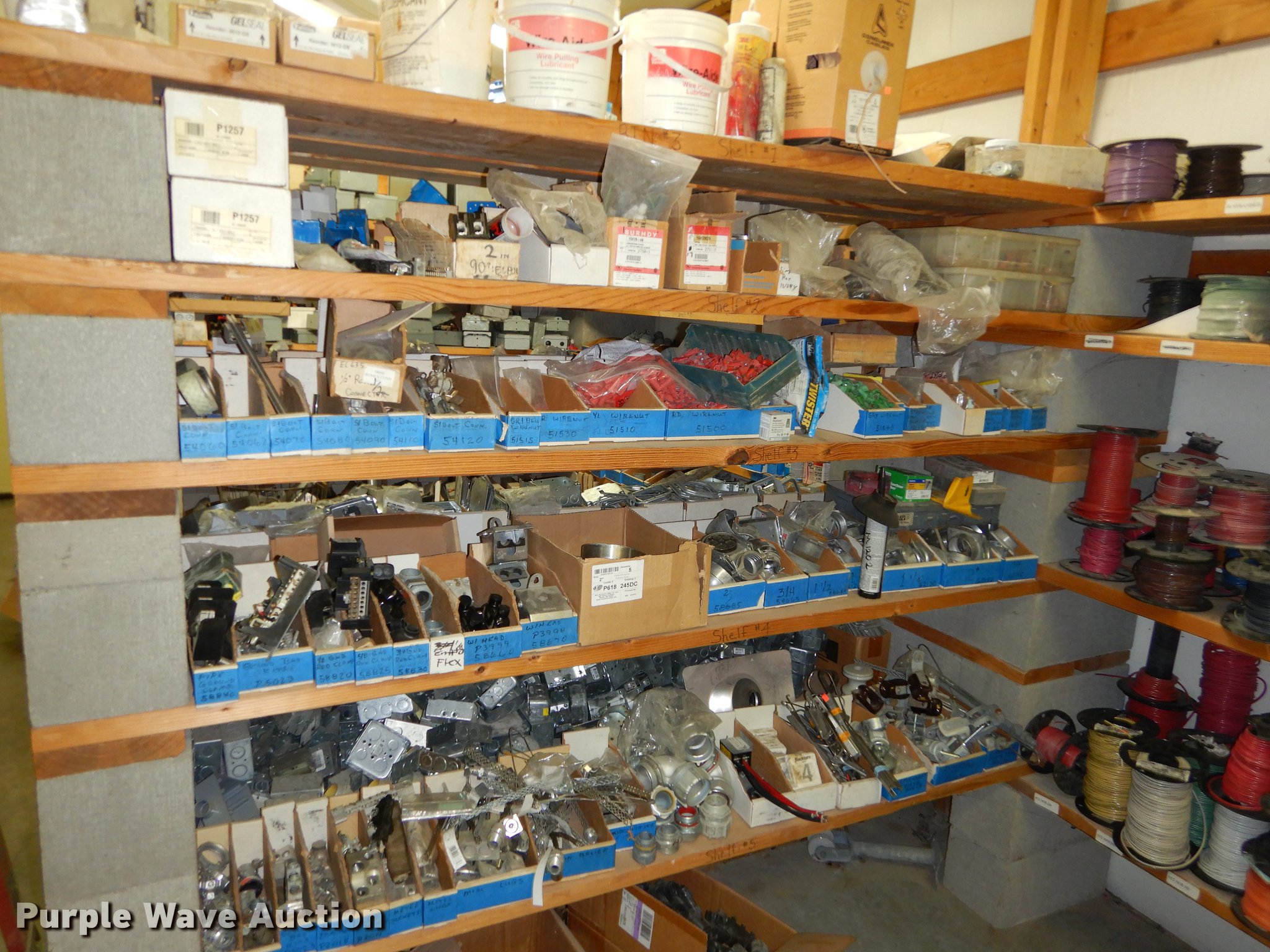Purple Wave is selling a used Building Materials in Kansas. This item is a Electrical supplies with the following: Ground clamps, Wire pigtail connectors, Insulators, Lubricant, Wire, Romax, Water proof PVC couplers, Metal clad wire, Box connectors, Rolls of caution tape, Circuit breakers, New in box