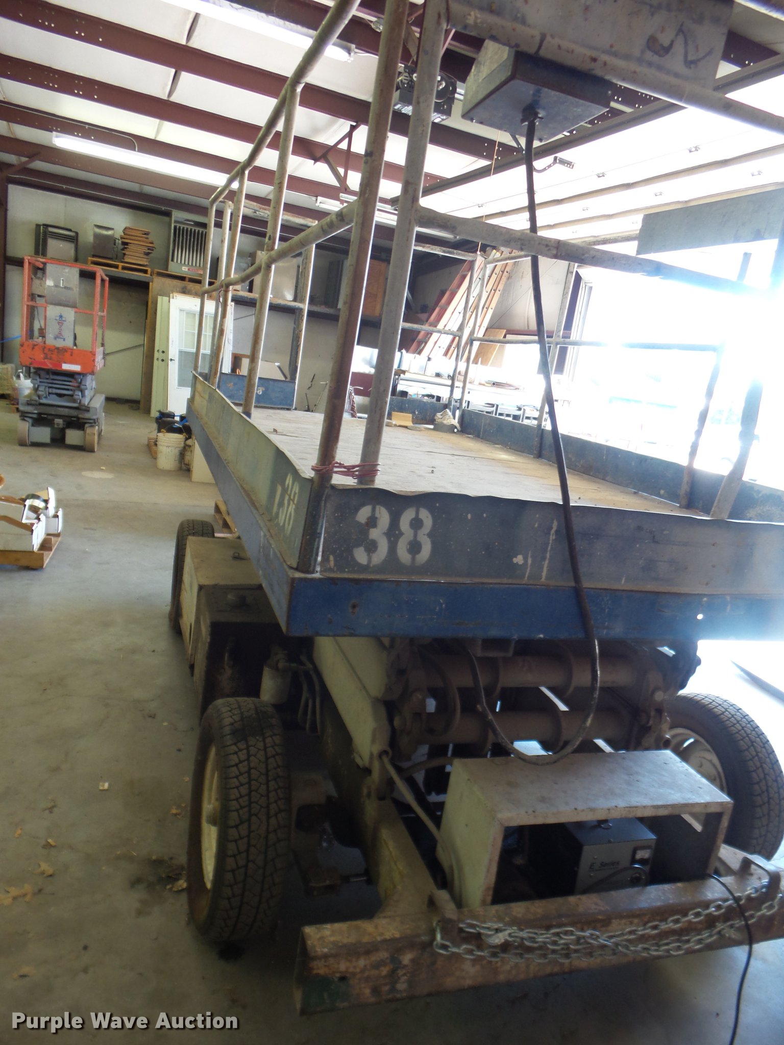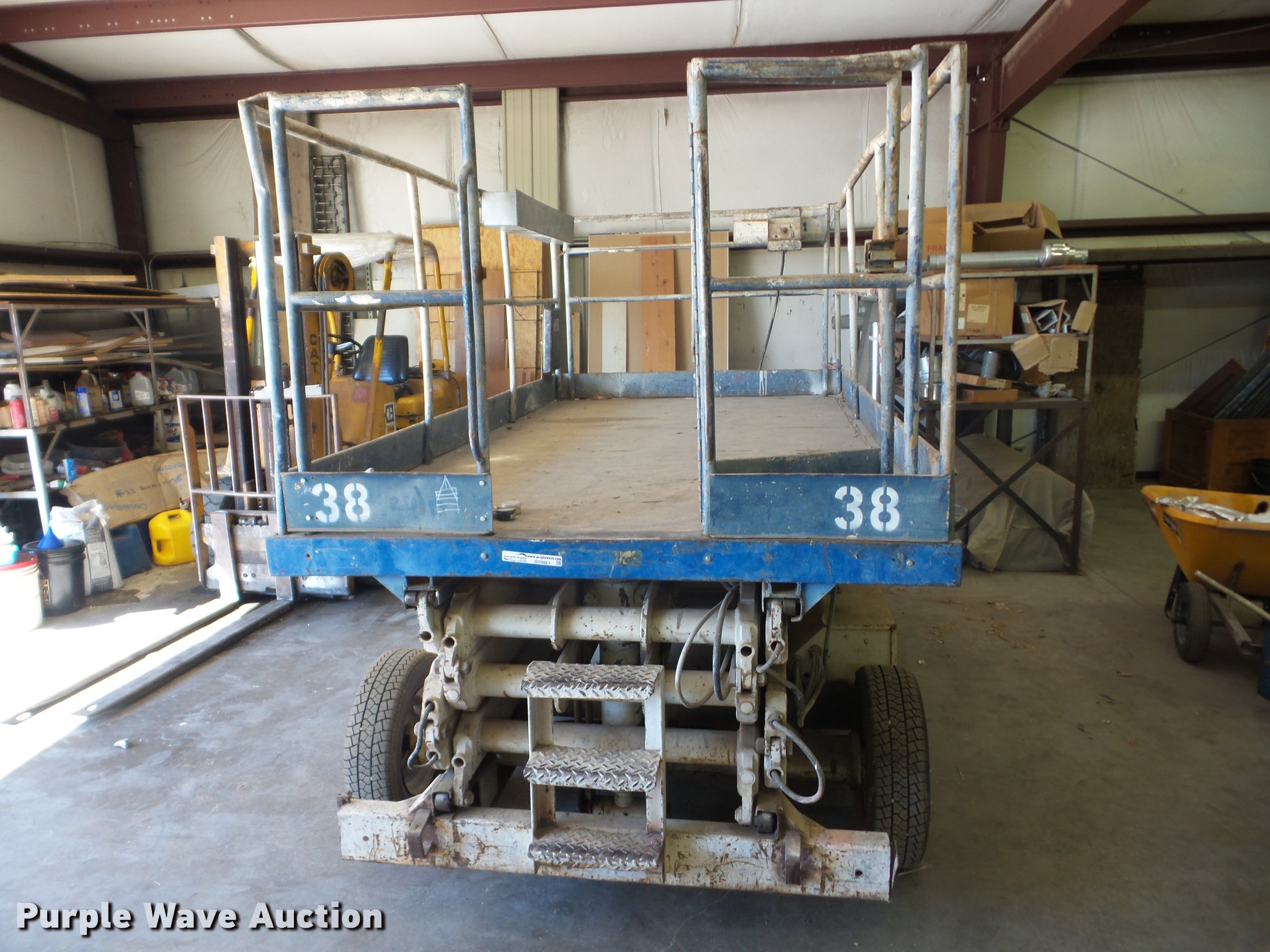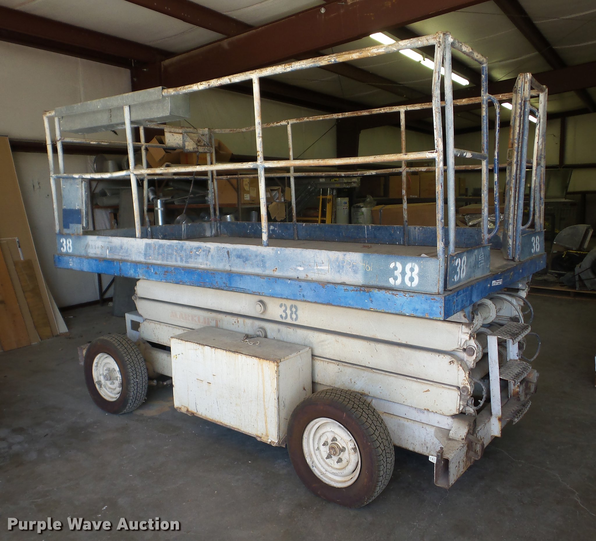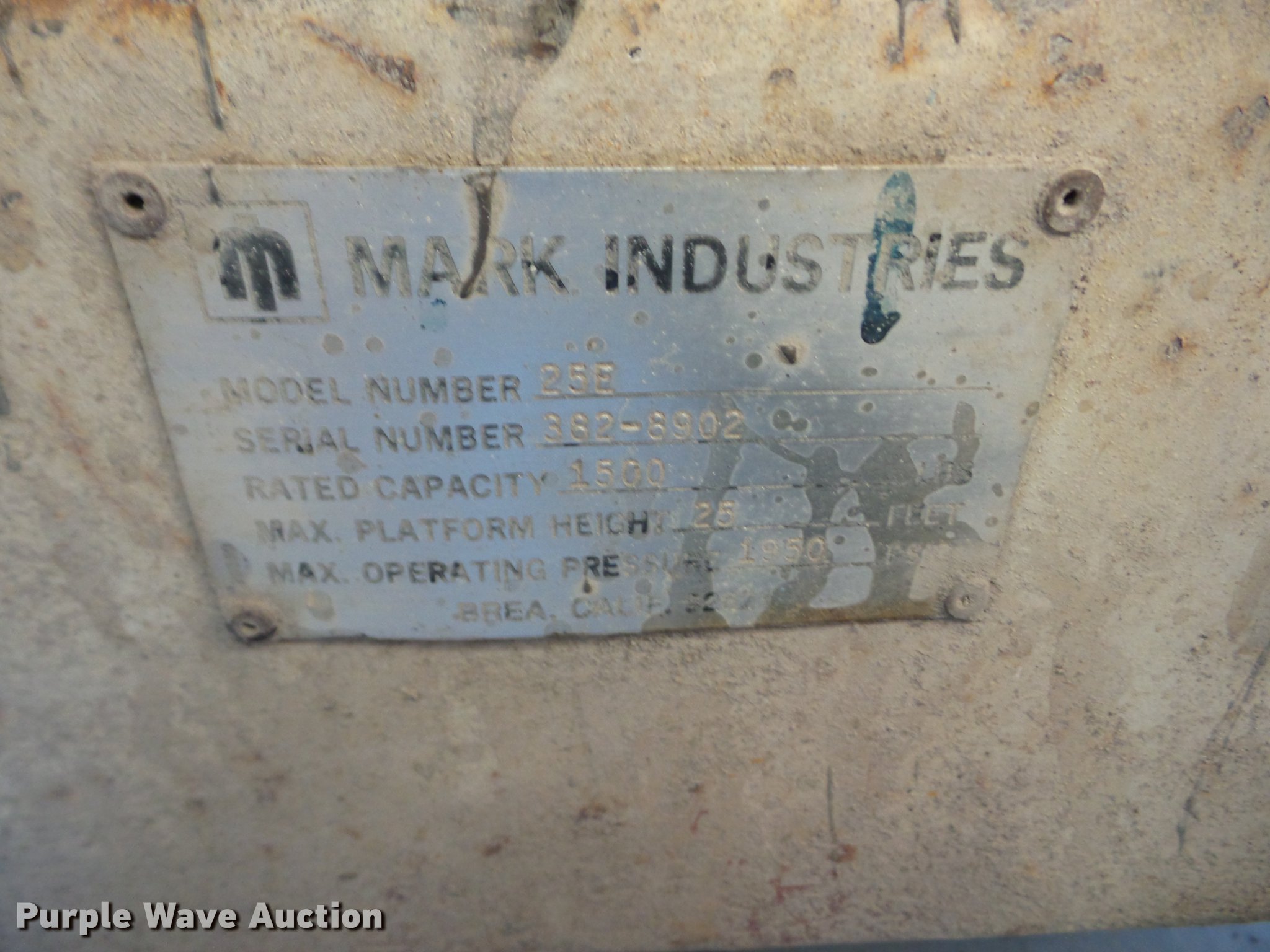 Purple Wave is selling a used Scissor or Vertical Lift in Kansas. This item is a Mark Lift 25E scissor lift with the following: Electric operation, 1,500 lbs max lift capacity, 25' max lift height, 10'L x 6'W platform, 185/70R13 foam-filled tires, Serial 382-8902