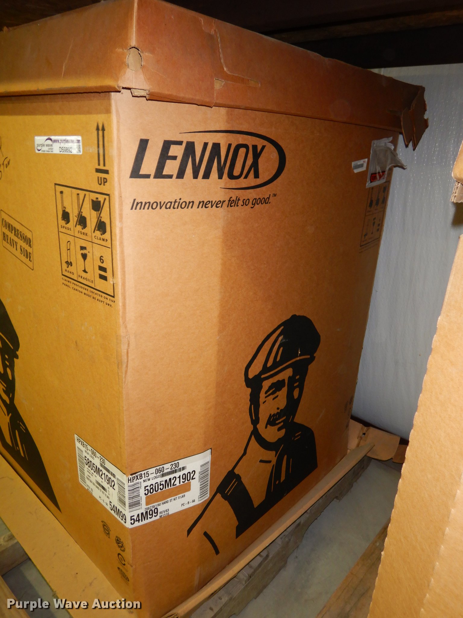 Purple Wave is selling a used Appliances in Kansas. This item is a Lennox heat pump with the following: Model HPXB15060230, Five ton, New in box, Serial 5805M21902