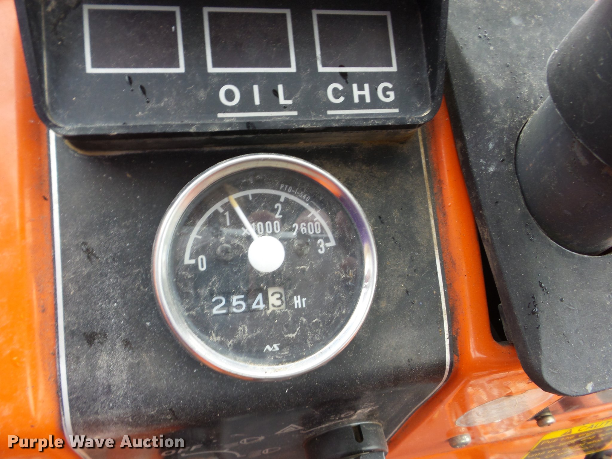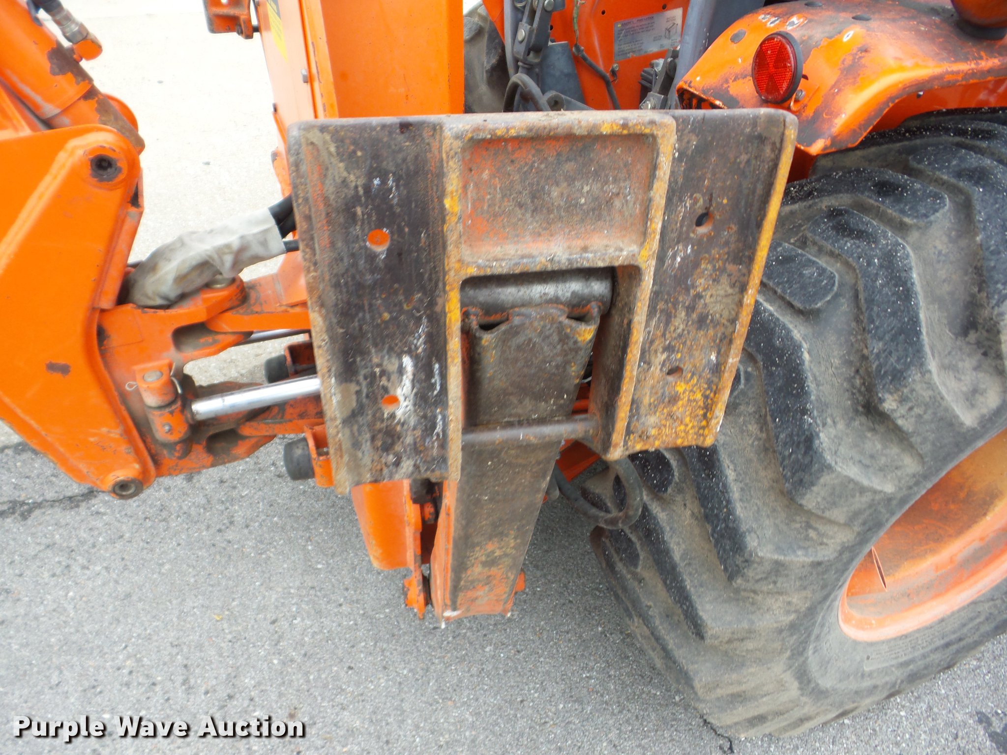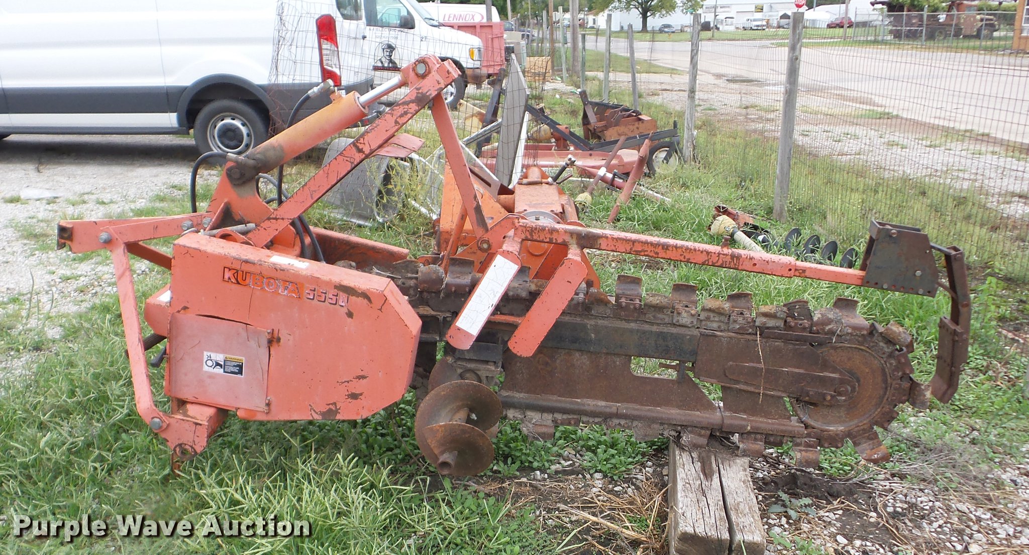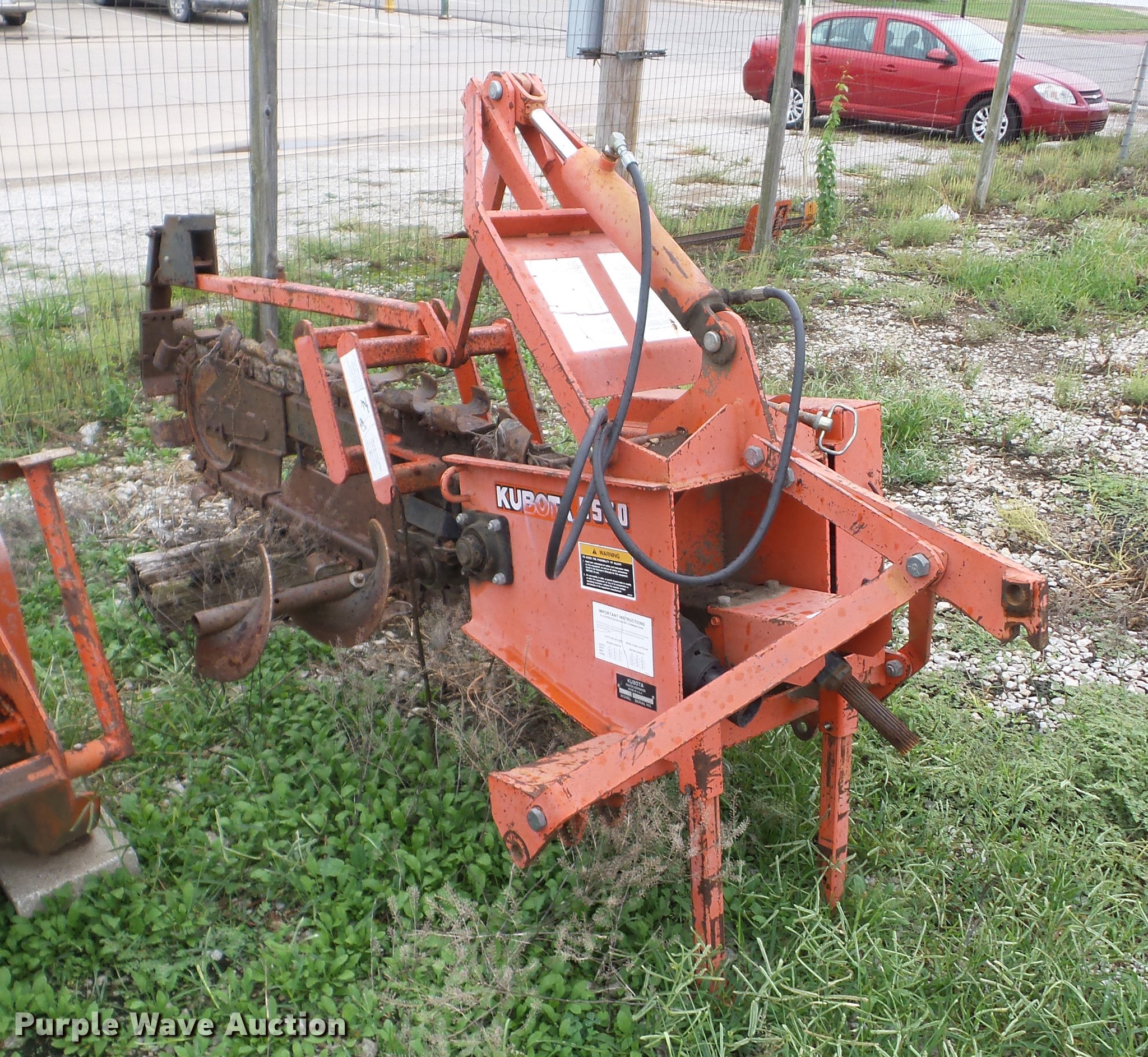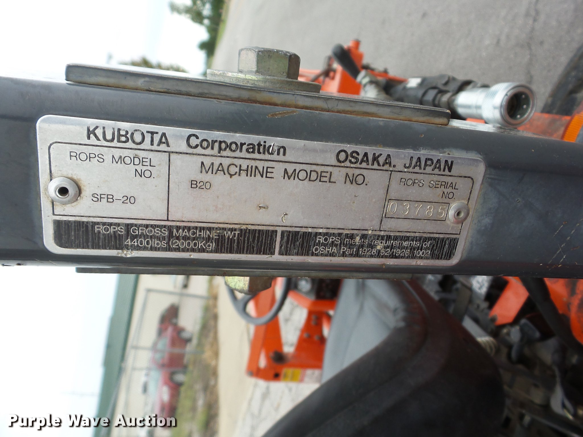 Purple Wave is selling a used Tractor in Kansas. This item is a Kubota B20 MFWD tractor with the following: 254 PTO hours on meter, Kubota D950-A-T three cylinder diesel engine, 20 HP, Hydrostatic transmission, 3F-3R gears, Four wheel drive, Differential lock, OROPS, Kubota TL420A loader, 55"W bucket, Joystick controls, Kubota 5550 trencher attachment, 4' boom length, 6" cutting width, 8" diameter end idler, Dirt teeth, Hydraulic crumber arch, 5"W crumber shoe, Serial 11630191, Kubota BT750C backhoe, 12"W bucket, (3) teeth, Outriggers, Serial 60946, Three point, No arms, 540 PTO, Rear hydraulic remote set, 23x8.50-12 front tires, 12.4-16 rear tires, Serial 71072