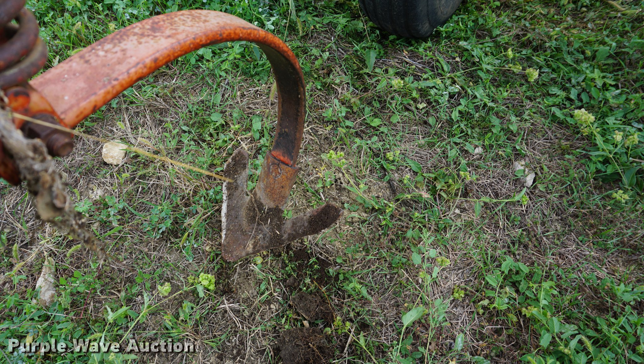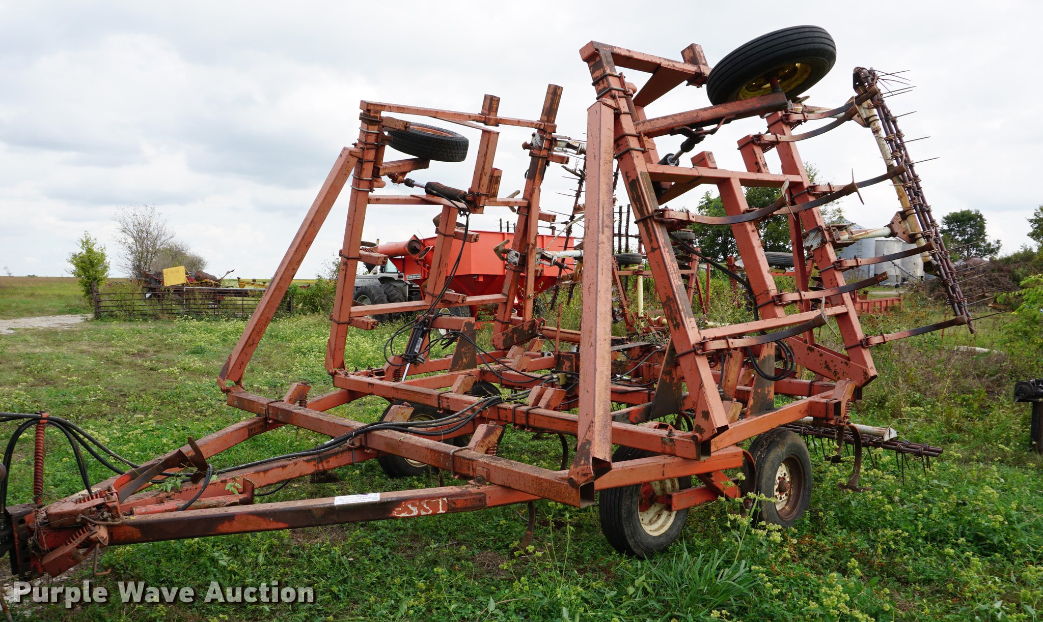 Purple Wave is selling a used Field Cultivator or Sweep Plow in Kansas. This item is a Hesston field cultivator with the following: 24'W, Hydraulic lift and fold, Pin/clevis hitch, Rear hitch, 7.60-15 tires, Some sweeps are broken/missing