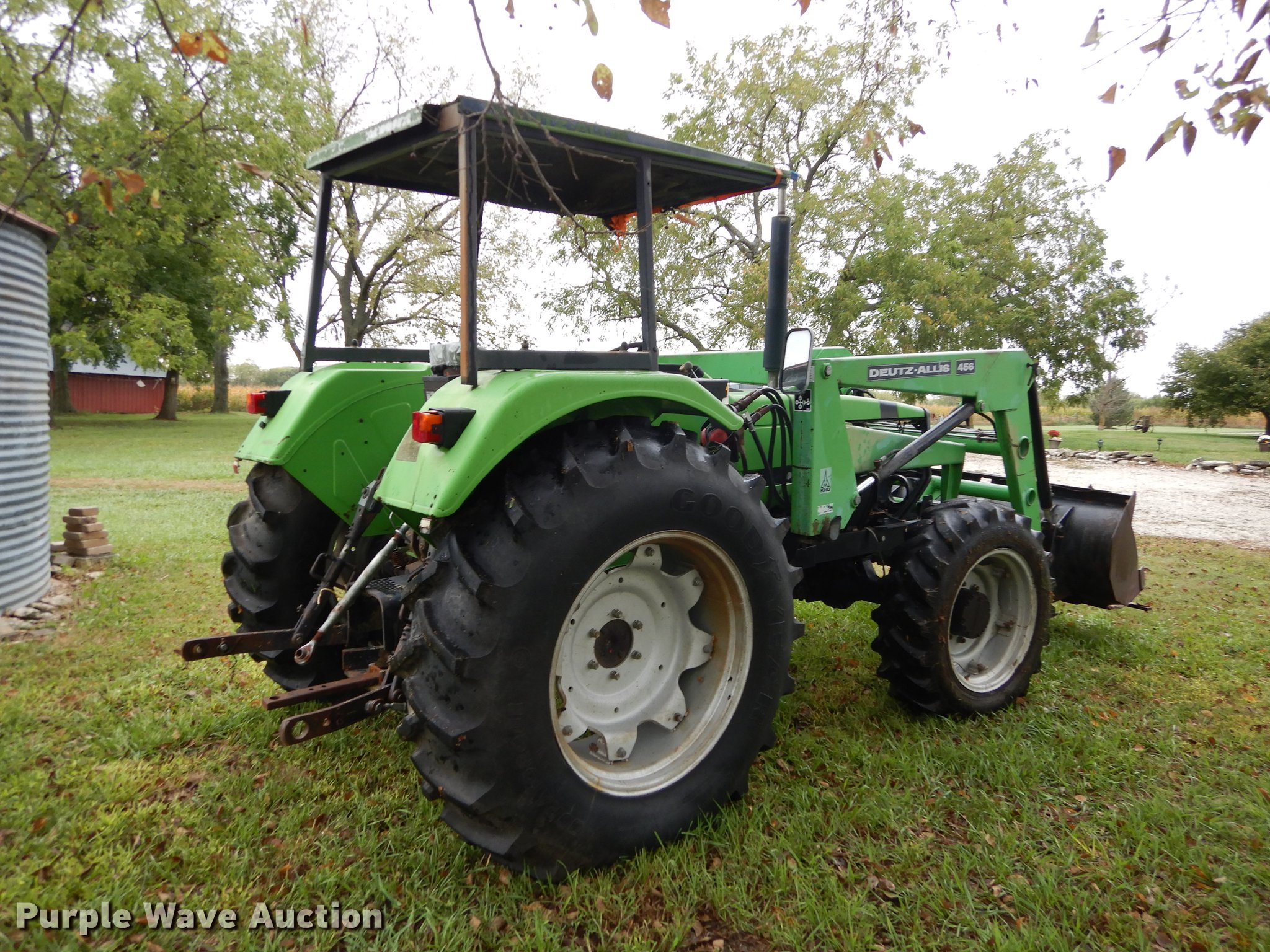 Purple Wave is selling a used Tractor in Kansas. This item is a Allis Chalmers 6250 MFWD tractor with the following: 3,553 hours on meter, Deutz 7742014 2.8L three cylinder diesel engine, 50 HP, Serial F31-912, Synchromesh transmission, 8F-4R gears, Canopy, Deutz-Allis 456 loader, 6'W bucket, Quick attach, Joystick controls, Three point, Class II and III, Top link, 540 PTO, Draw bar, Rear hydraulic remote set, 11.2-24 front tires, 16.9-30 rear tires, Injector leak, smokes, Bucket damaged, One headlight missing