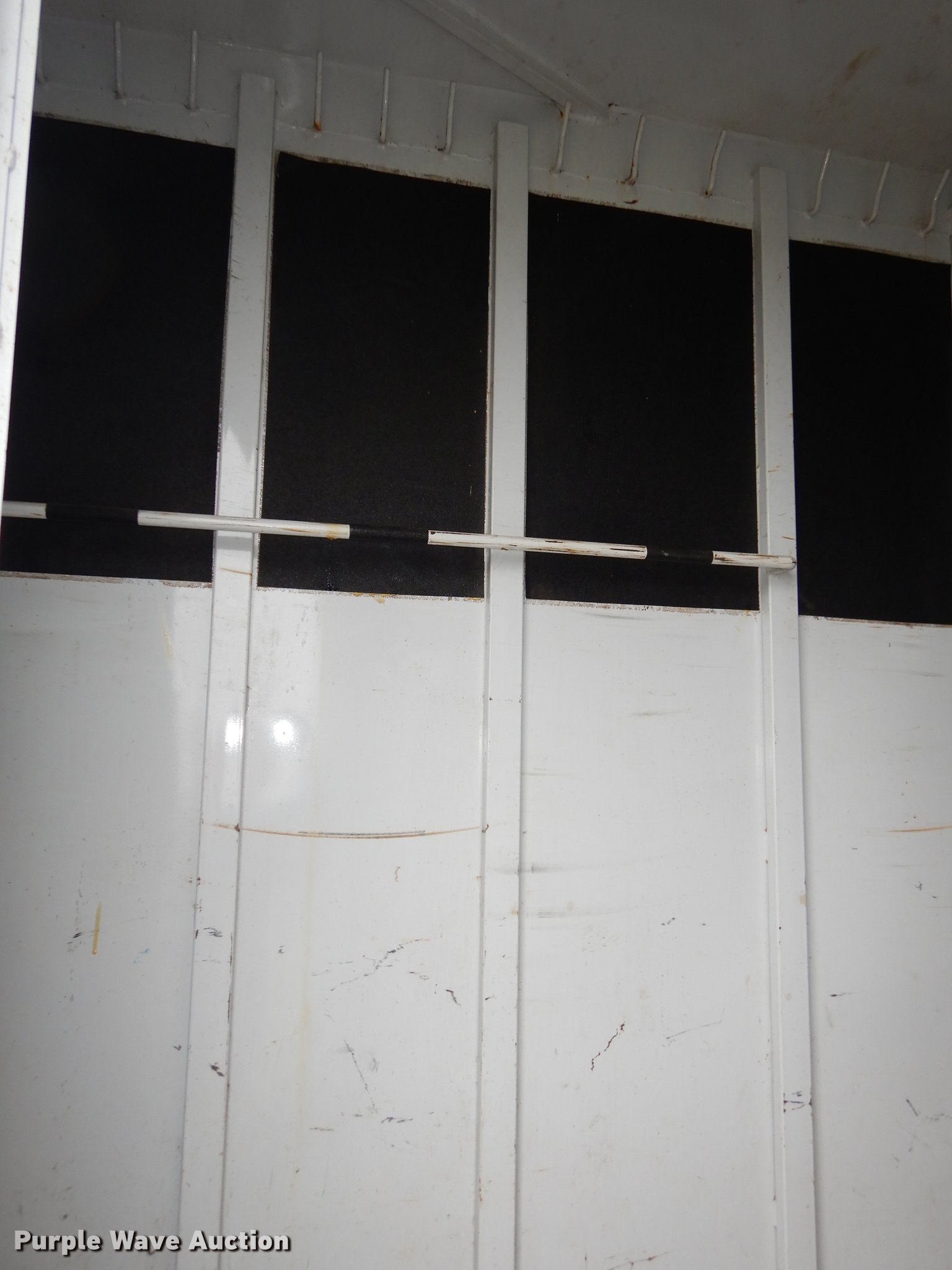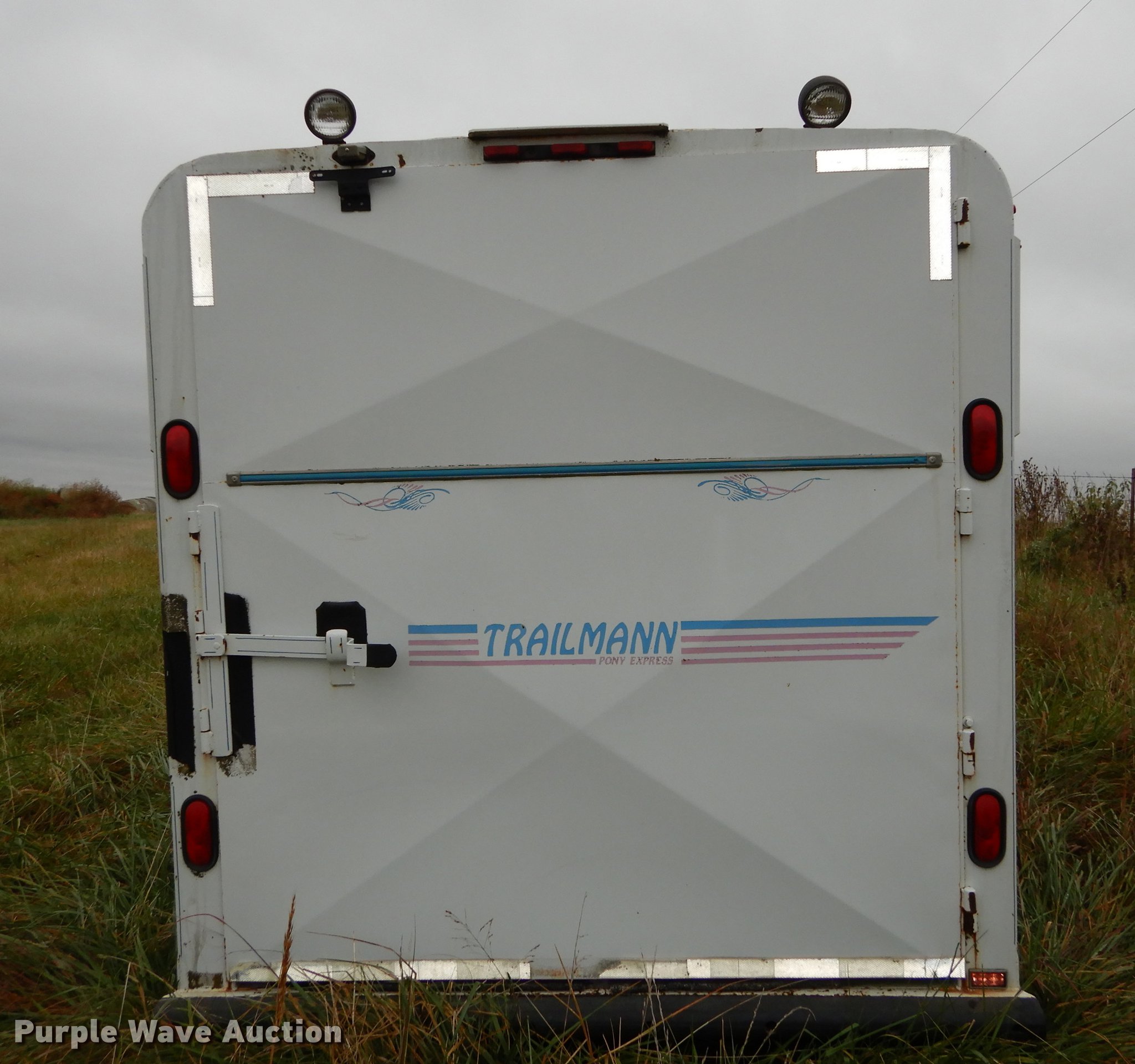Purple Wave is selling a used Livestock Trailer in Kansas. This item is a 1994 Trailmann Pony Express slant horse trailer with the following: 16'L x 80"W, 7'L tongue, Three horse capacity, Wood floor, Floor mats, Side entry door, Tack room, Rear work lights, Gooseneck hitch, Safety chains, Lights, Break-away cable, Tandem axle, 7.50R16 tires, GVWR 12,000 lbs