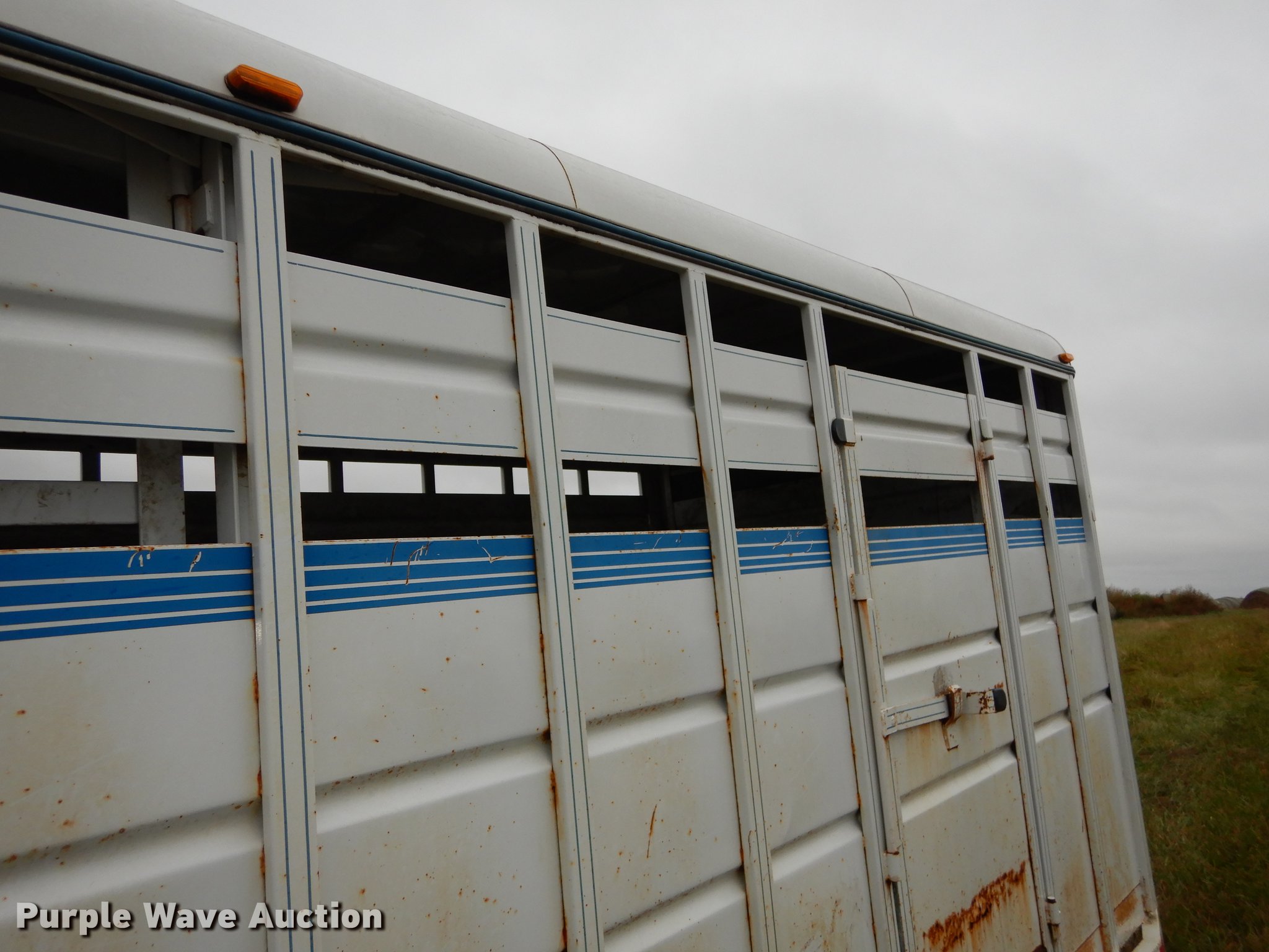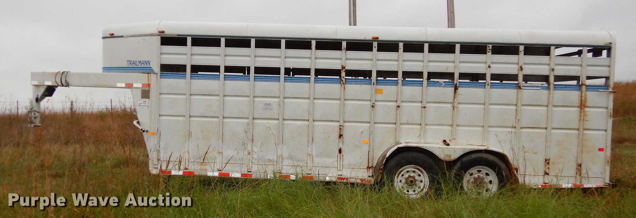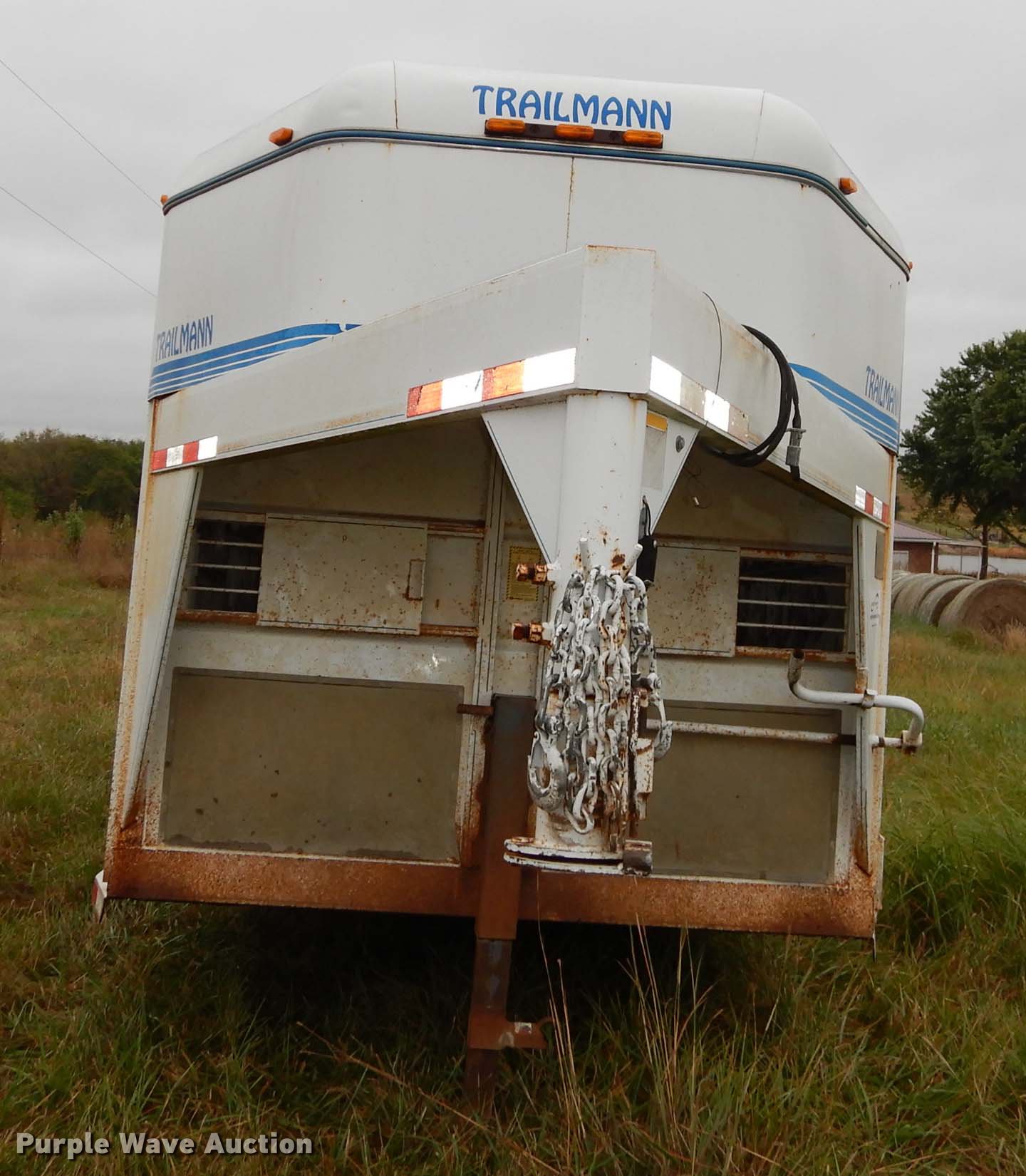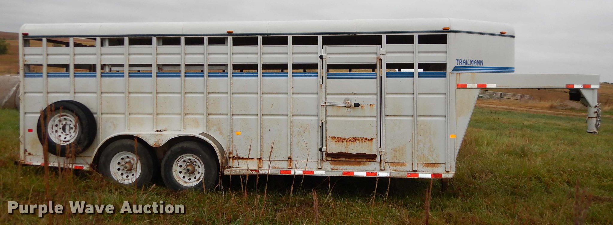 Purple Wave is selling a used Livestock Trailer in Kansas. This item is a 1999 Trailmann livestock trailer with the following: 20'L x 80"W, Wood floor, Divider gate, Side entry door, 7'L gooseneck hitch, Lights, Break-away cable, Safety chains, Tandem axle, 7.50R16 tires, GVWR 14,000 lbs