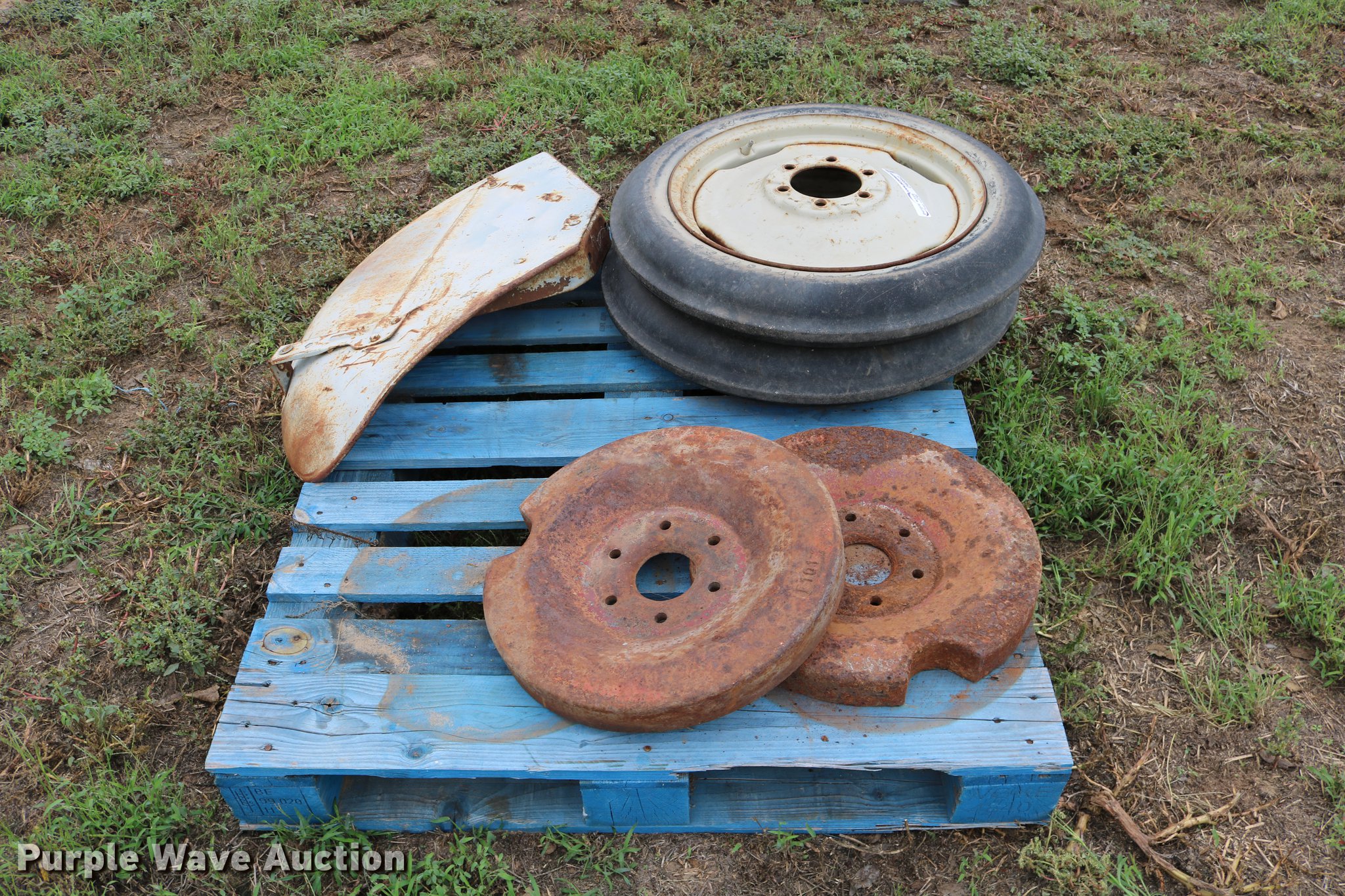 Purple Wave is selling a used Ag Tractor Loader or Attach. in Kansas. This item is a Ford 8N tractor parts with the following: (2) front wheel weights, (2) 4-19 tires and wheels, Fender