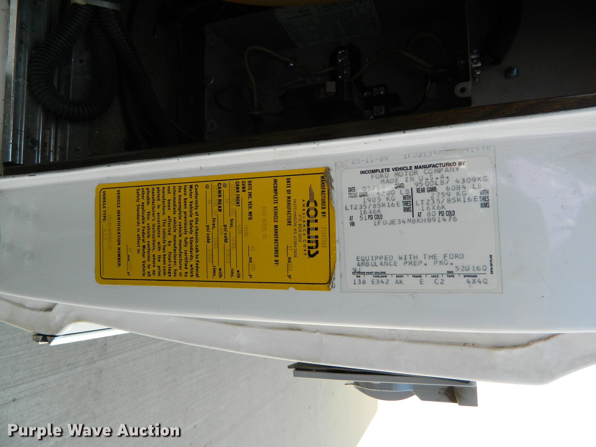 Purple Wave is selling a used Fire Truck or Emergency Vehicle in Kansas. This item is a 1989 Ford Econoline E350 ambulance with the following: 93,953 miles on odometer, 7.3L V8 OHV 16V diesel engine, Automatic transmission, Single axle, AC and heat, Cruise, AM/FM, Suspension seat, Collins body, Emergency lights and sirens, LT235/85R16 tires, GVWR 10,500 lbs