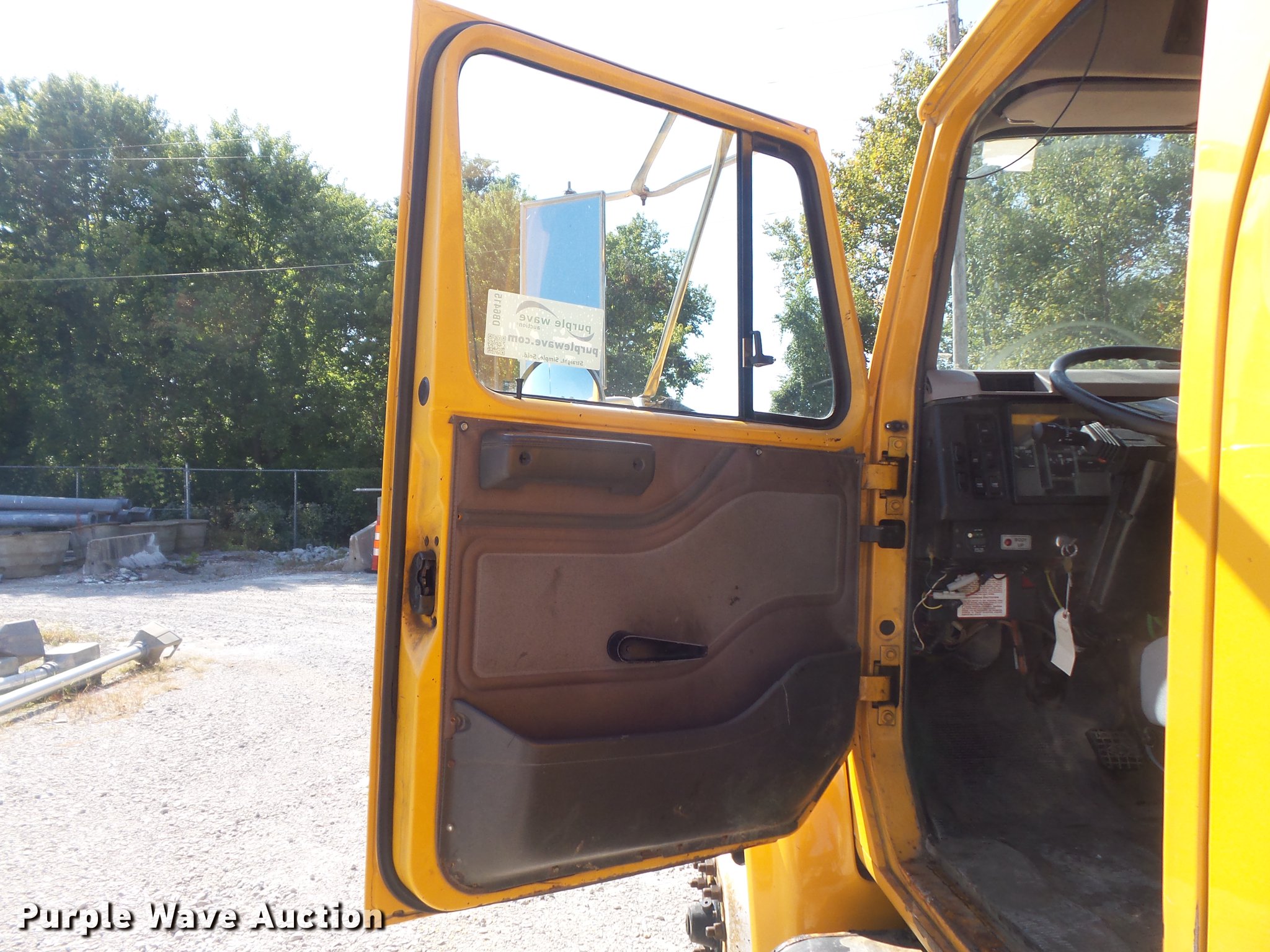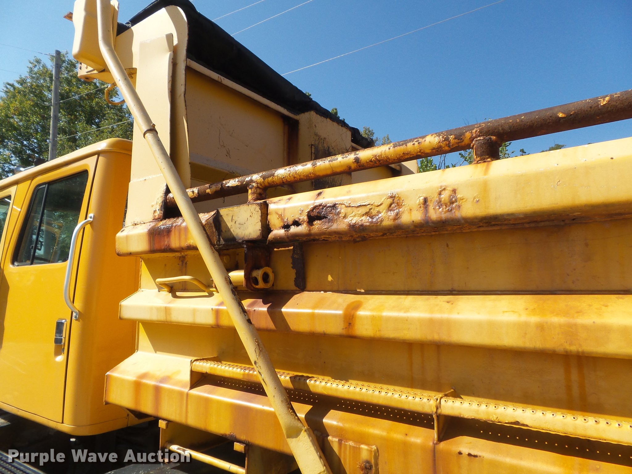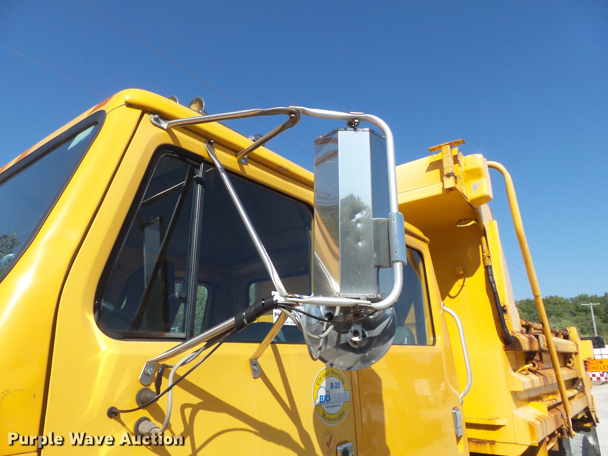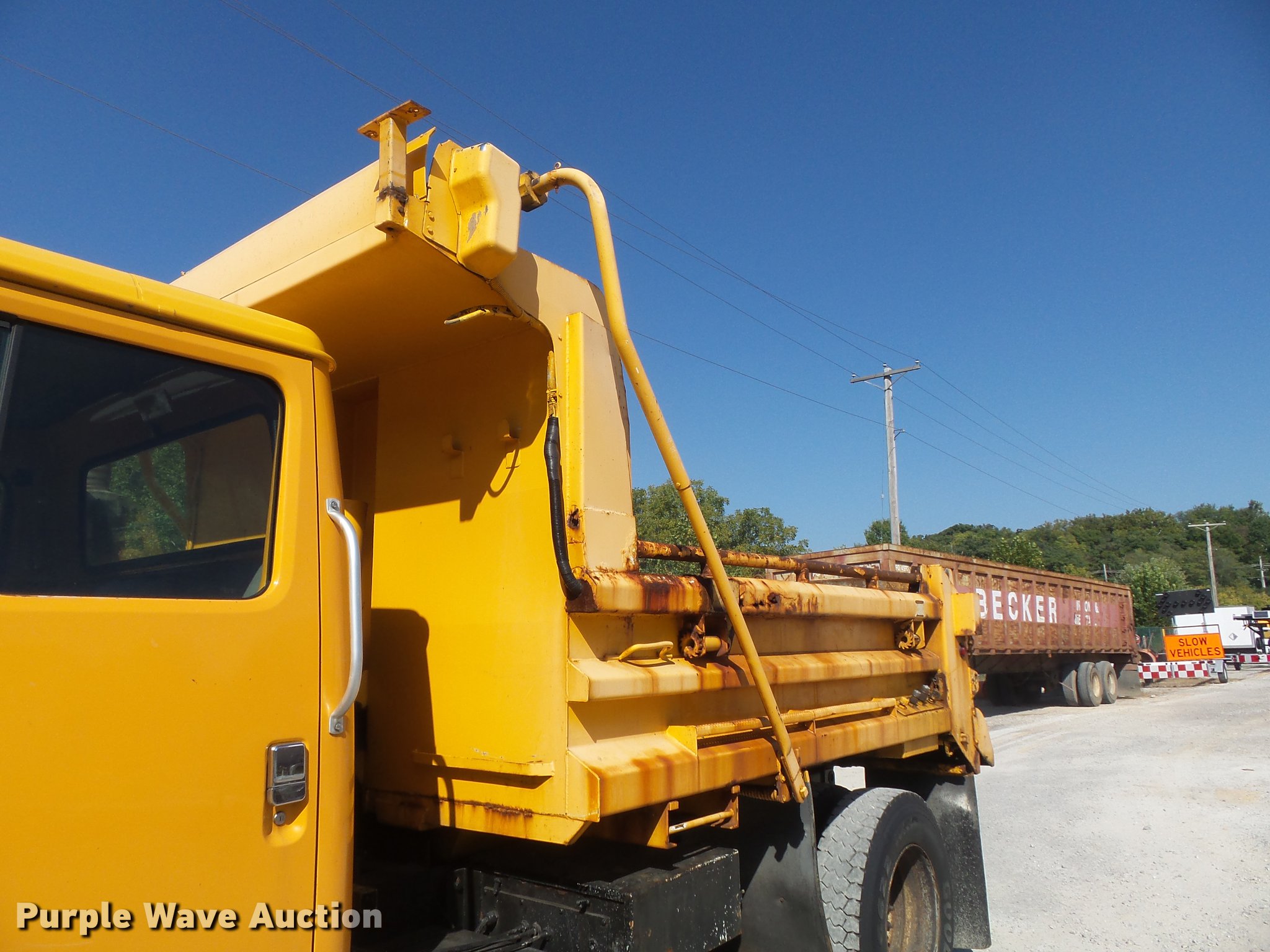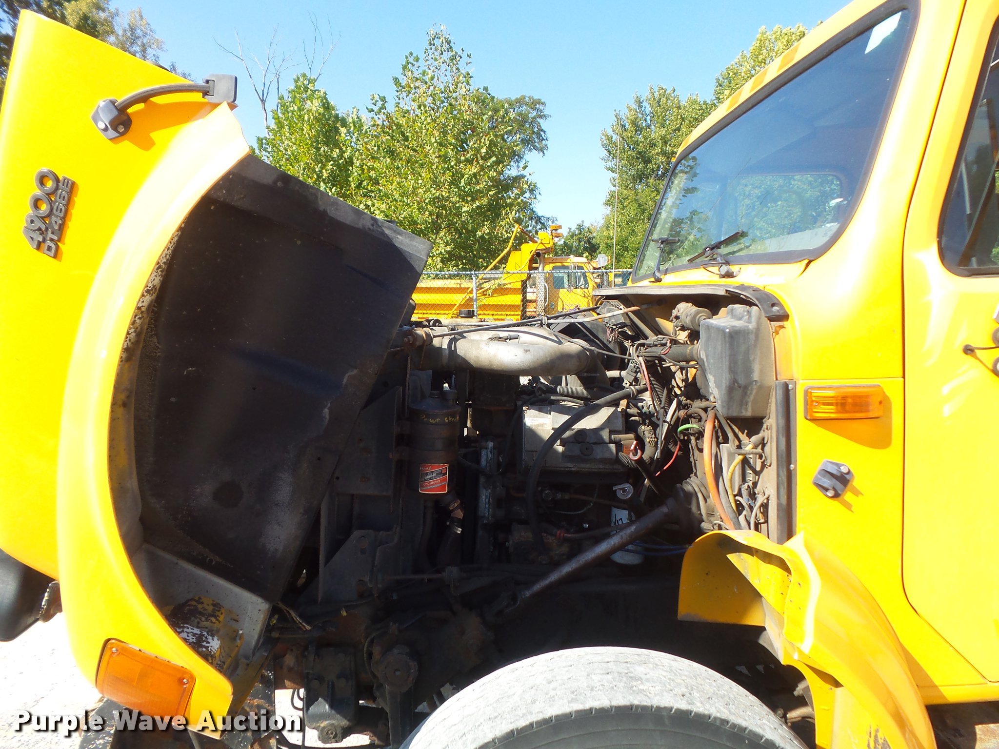 2002 International 4900 Crew Cab dump truck. 201,331 miles on odometer, 12,165 hours on meter, International DT466 7.6L L6 turbo diesel engine 215 HP, Serial 470HM2U1346943, Allison automatic transmission, Single axle, AC and heat, Cruise, AM/FM/weatherband, Power front windows, Manual rear windows, Power and heated mirrors, Air suspension seat, Block heater, Toolboxes, PTO, McClain/Galion 402FT-10 steel dump bed 10'L x 96"W, 24" side height, 5.6 to 6.8 yd. capacity, Rollover tarp, Air operated end gate, Snow plow bracket, Rear hydraulic hookups, Pintle hitch, Spring suspension, Air brakes, 206" wheelbase, 11R22.5 tires, GVWR 37,000 lbs, FAWR 16,000 lbs, RAWR 21,000 lbs, MODOT ID 6939. Missouri title. 1HTSDAAR42H523822. Missouri Department of Transportation (MODOT). 2309 Barrett Station Rd. Ballwin, MO 63021