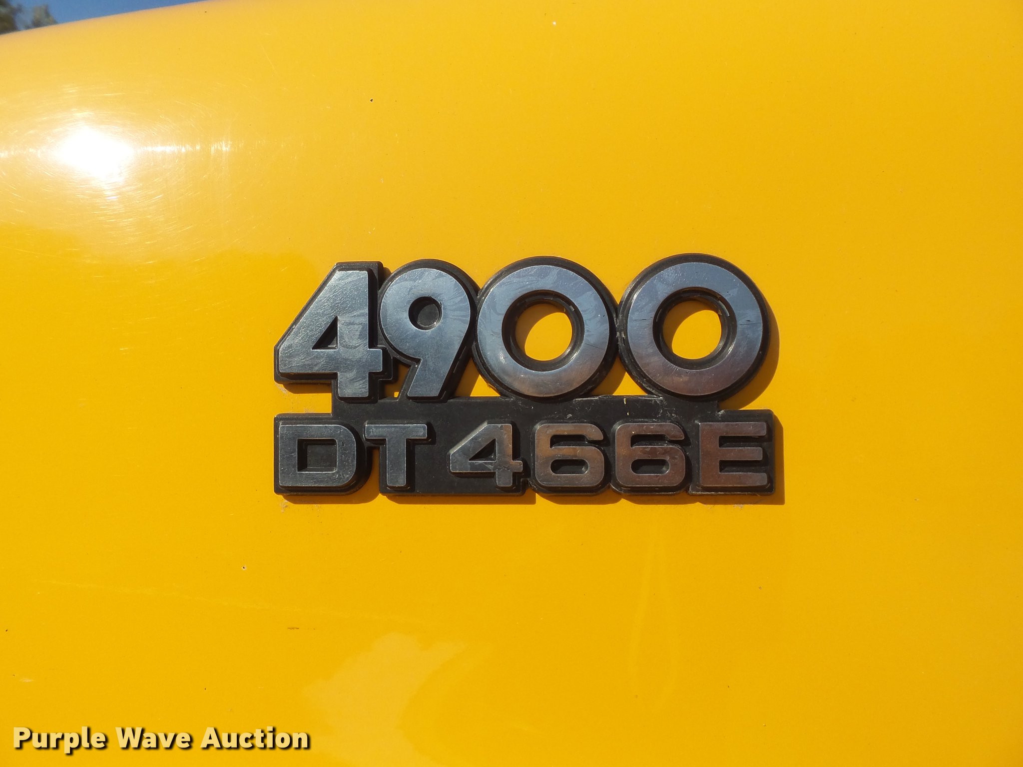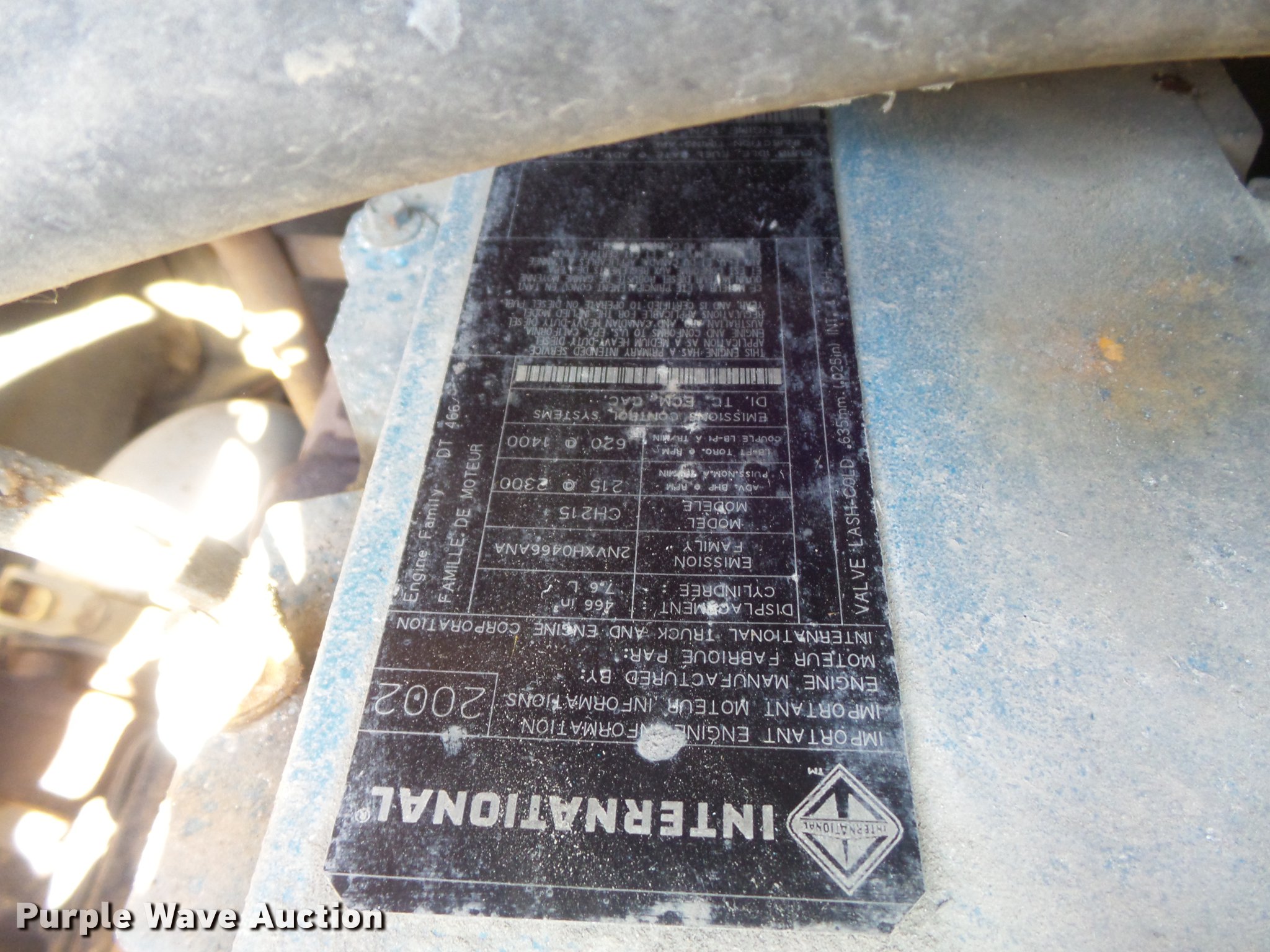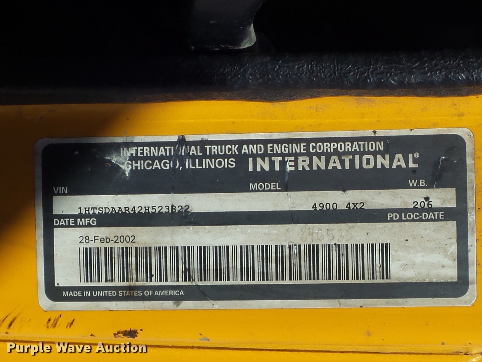 Purple Wave is selling a used Construction Dump Truck in Missouri. This item is a 2002 International 4900 Crew Cab dump truck with the following: 201,331 miles on odometer, 12,165 hours on meter, International DT466 7.6L L6 turbo diesel engine, 215 HP, Serial 470HM2U1346943, Allison automatic transmission, Single axle, AC and heat, Cruise, AM/FM/weatherband, Power front windows, Manual rear windows, Power and heated mirrors, Air suspension seat, Block heater, Toolboxes, PTO, McClain/Galion 402FT-10 steel dump bed, 10'L x 96"W, 24" side height, 5.6 to 6.8 yd. capacity, Rollover tarp, Air operated end gate, Snow plow bracket, Rear hydraulic hookups, Pintle hitch, Spring suspension, Air brakes, 206" wheelbase, 11R22.5 tires, GVWR 37,000 lbs, FAWR 16,000 lbs, RAWR 21,000 lbs, MODOT ID 6939