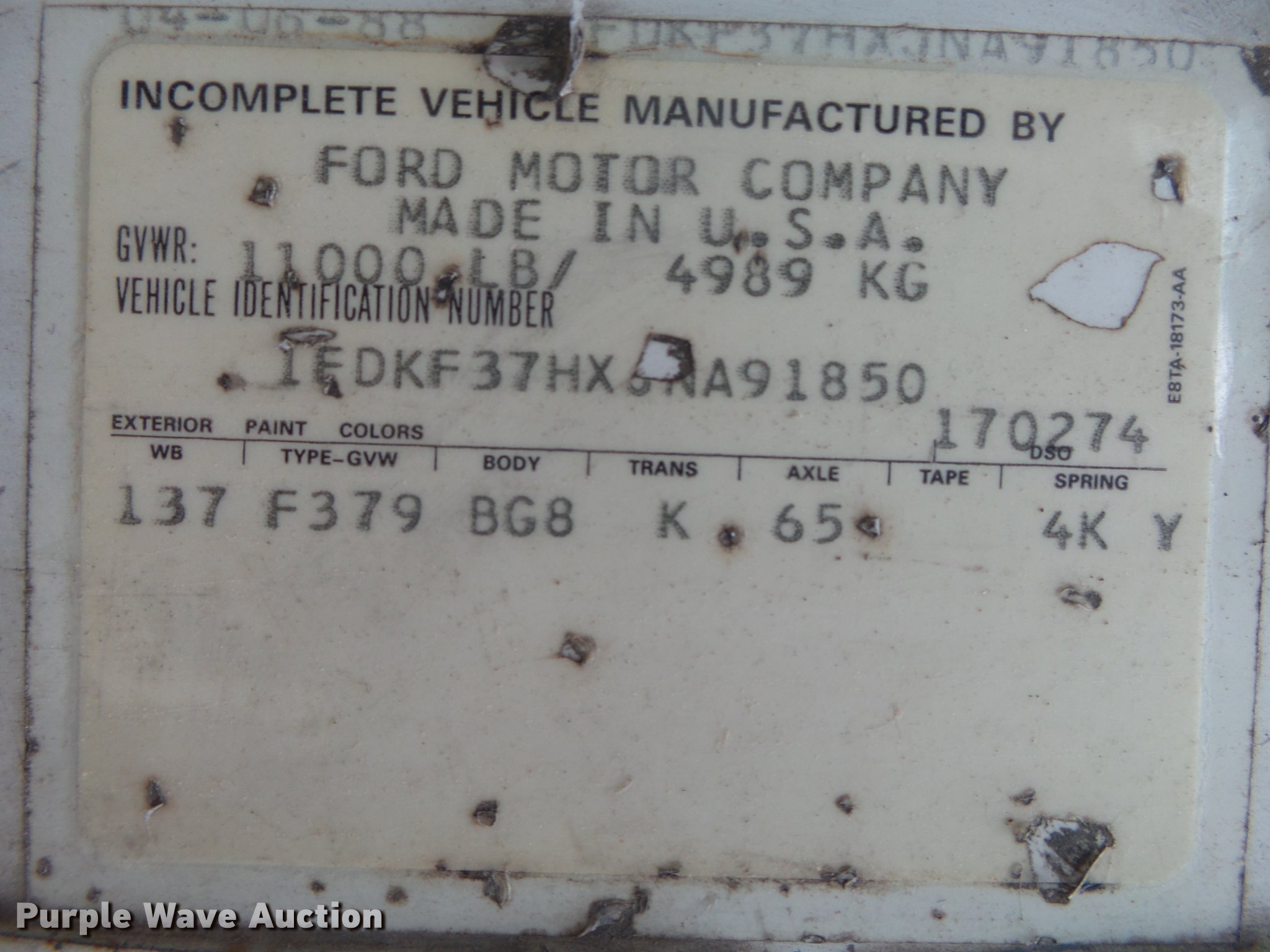 1988 Ford F350 utility bed pickup truck. 64,606 miles on odometer, 5.8L V8 OHV 16V gas engine, Automatic transmission, Single axle, Heat, AM/FM, Manual windows and locks, Vinyl interior, Baker 110880 utility bed 10'L, Shelving, Mounted vise, Dual fuel tanks, Receiver hitch, Spring suspension, Hydraulic brakes, LT235/85R16 tires, GVWR 11,000 lbs, Possible engine issues, runs rough, Unit must be towed or hauled. Missouri title. 1FDKF37HXJNA91850. City of Merriam Woods. 4401 State Hwy 176. Merriam Woods, MO 65740