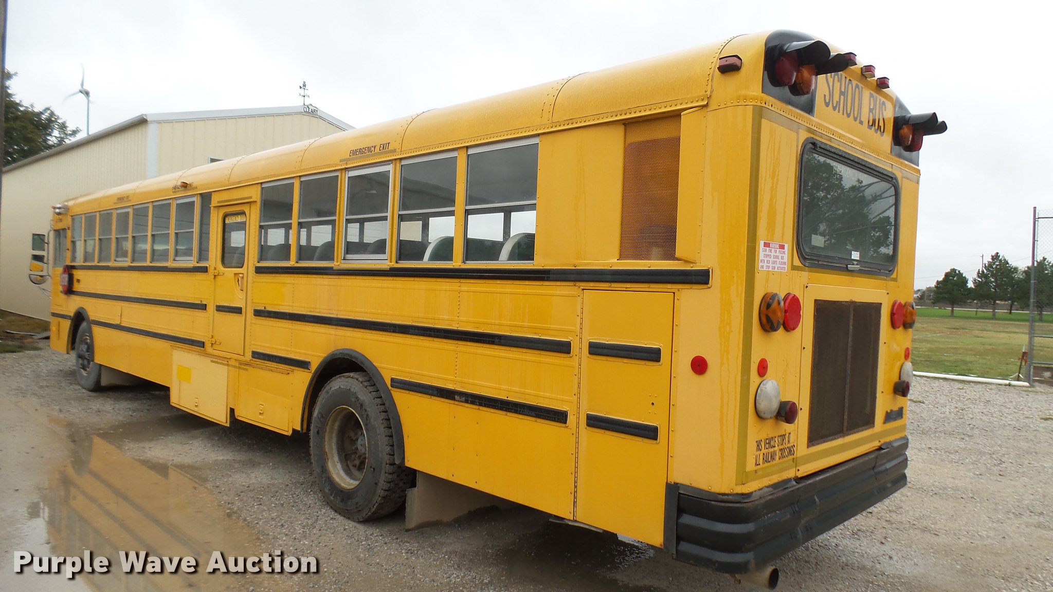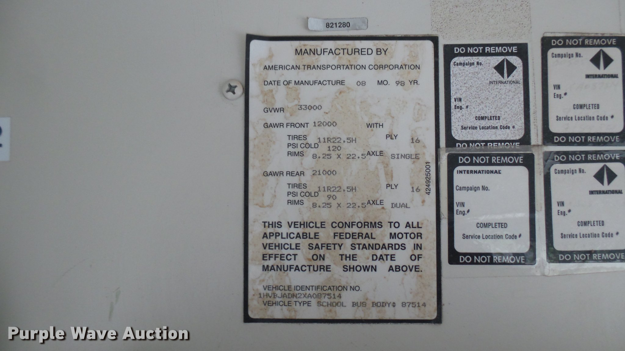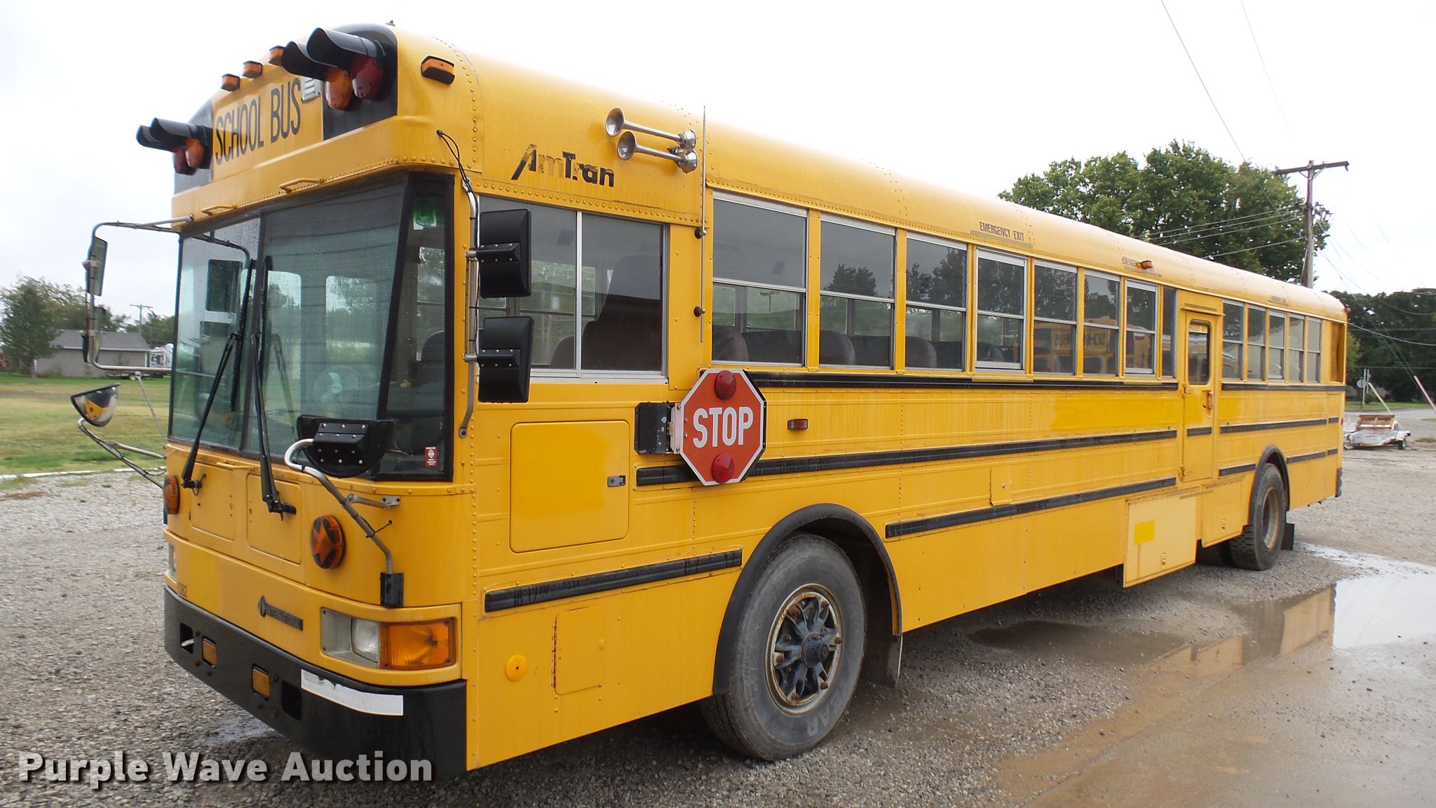 Purple Wave is selling a used Bus in Kansas. This item is a 1999 International AmTran school bus with the following: 118,454 miles on odometer, 3,969 hours on meter, International DT530 8.7L L6 diesel engine, Automatic transmission, Single axle, Heat, AM/FM/cassette, Heated mirrors, Vinyl interior, 78 passenger capacity, Roof and side emergency exits, Stroage, Front tow hooks, Air brakes, 11R22.5 tires, Idles rough, Inspected in August 2017, Maintenance records available upon request