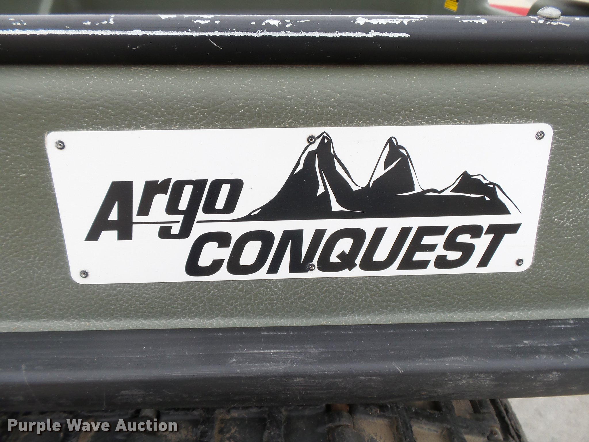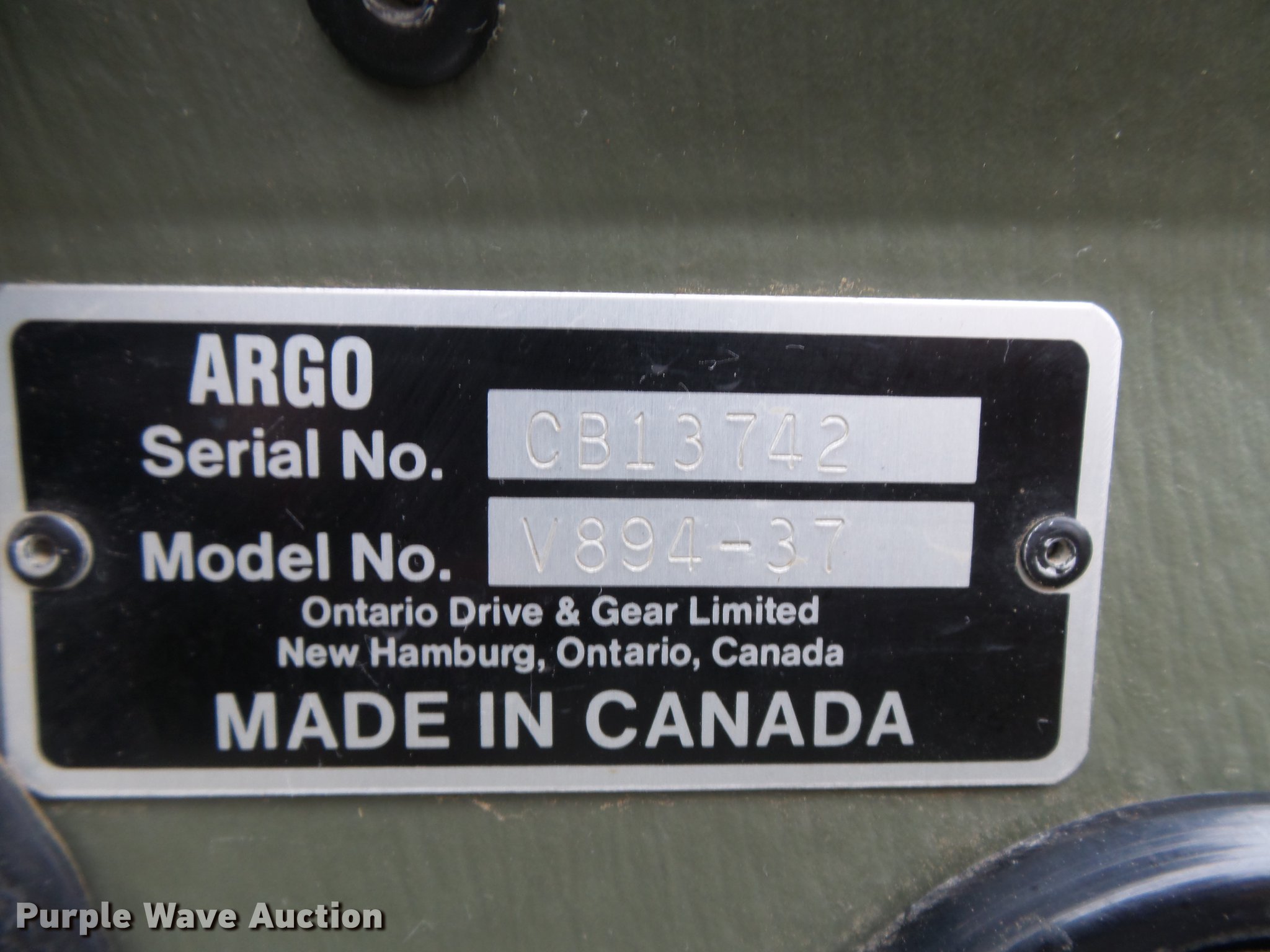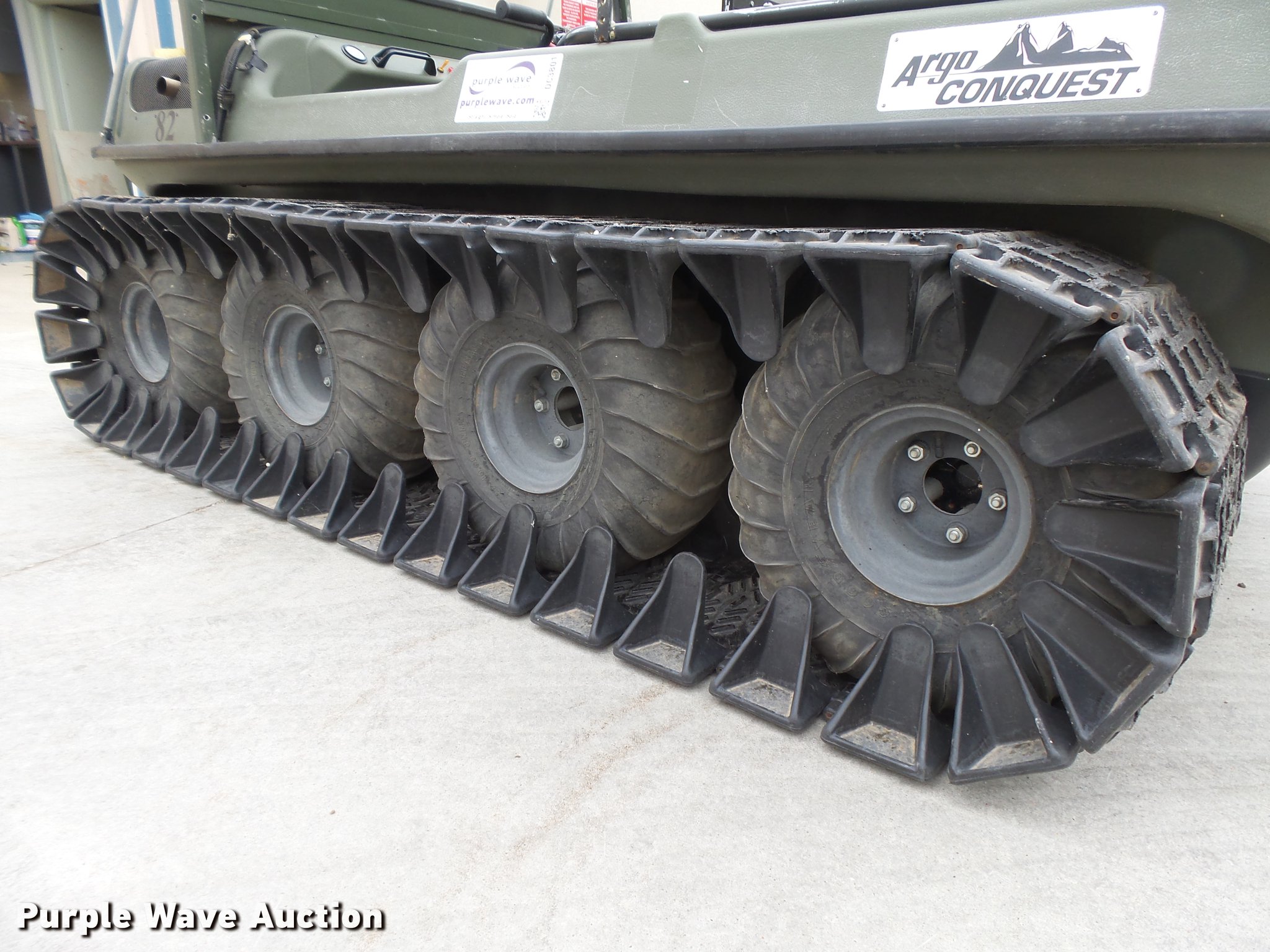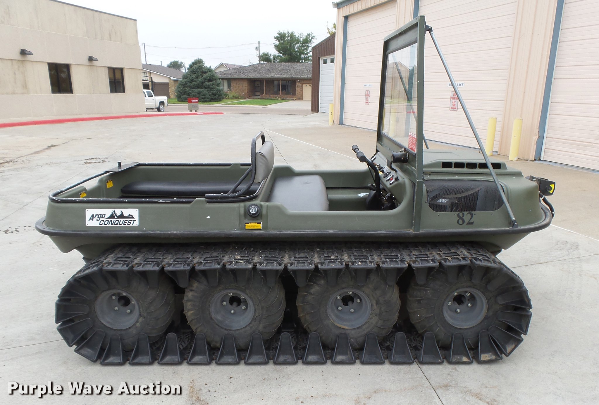 Purple Wave is selling a used Utility Vehicle in Kansas. This item is a 1997 Argo V894-37 Conquest amphibious vehicle with the following: 102 hours on meter, Kawasaki FD620D 0.617L two cylinder gas engine, Serial FDC20D119892, 2F-1R gears, Serial 22772MU, Eight wheel drive, Aluminum cab, Heat, Interior lights, Headlights, Wiper, Removable top, Rear handrail, Winch kit, Receiver hitch, (8) 22x10.00-8 tires, 18"W super tracks, 40 amp charging system, Additional track sections, Stored inside, Serial CB13742