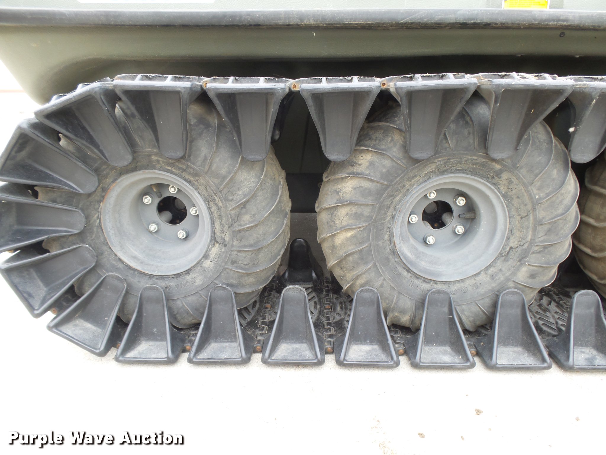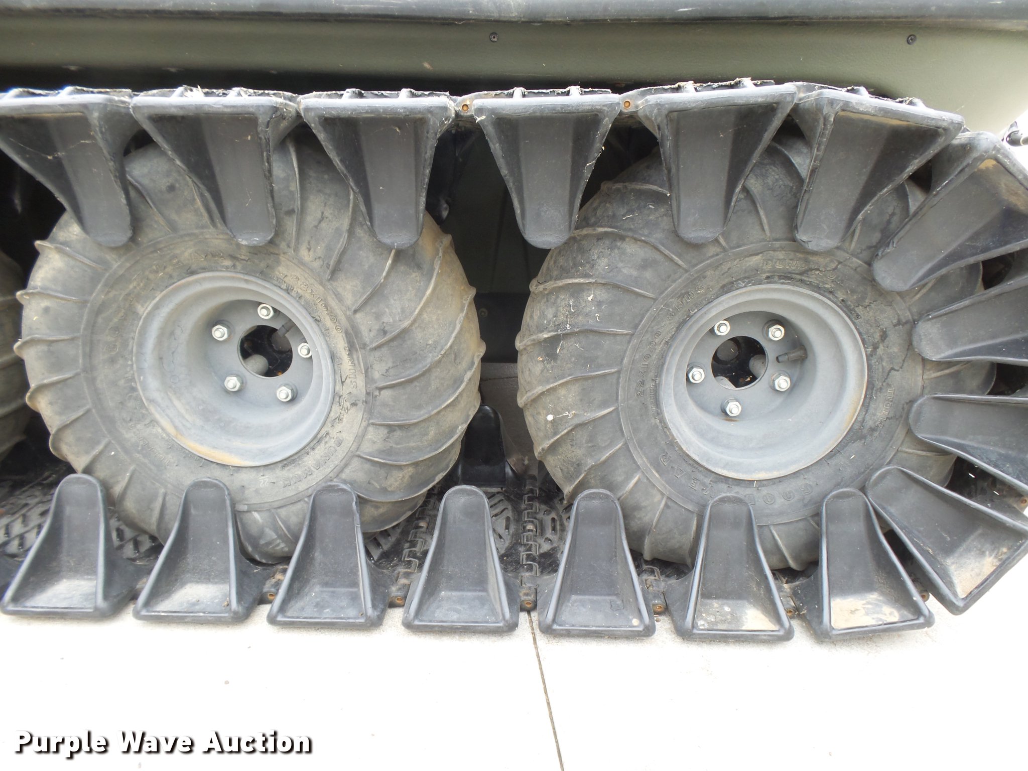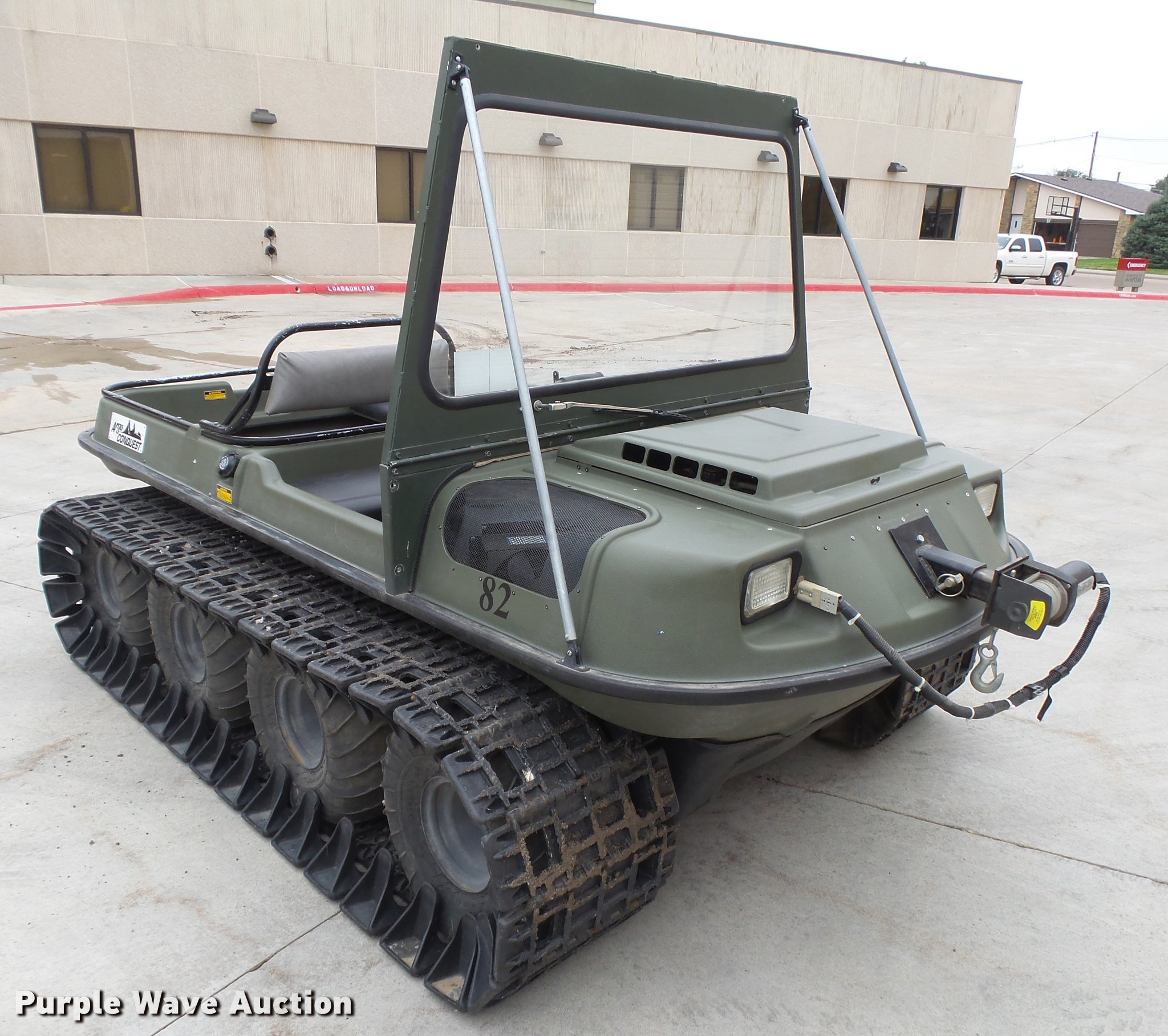 Purple Wave is selling a used Utility Vehicle in Kansas. This item is a 1997 Argo V894-37 Conquest amphibious vehicle with the following: 102 hours on meter, Kawasaki FD620D 0.617L two cylinder gas engine, Serial FDC20D119892, 2F-1R gears, Serial 22772MU, Eight wheel drive, Aluminum cab, Heat, Interior lights, Headlights, Wiper, Removable top, Rear handrail, Winch kit, Receiver hitch, (8) 22x10.00-8 tires, 18"W super tracks, 40 amp charging system, Additional track sections, Stored inside, Serial CB13742