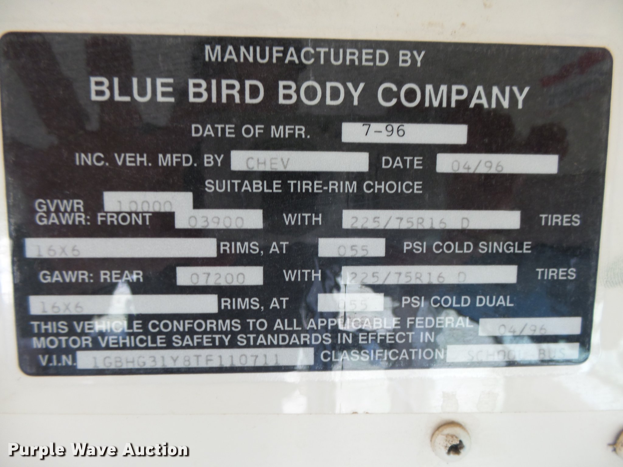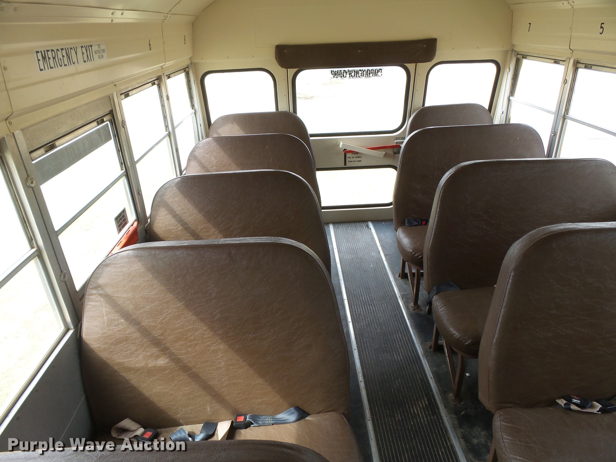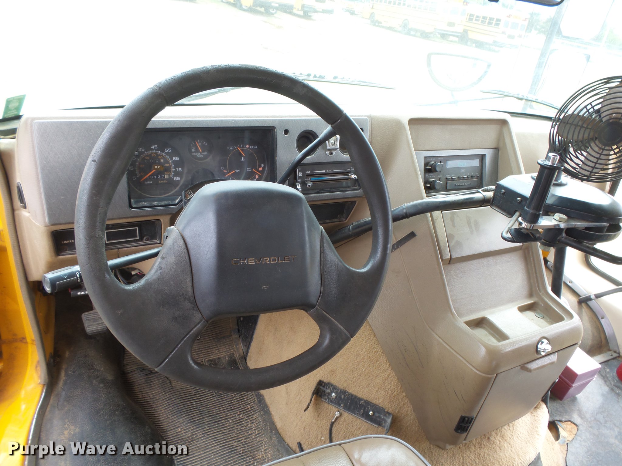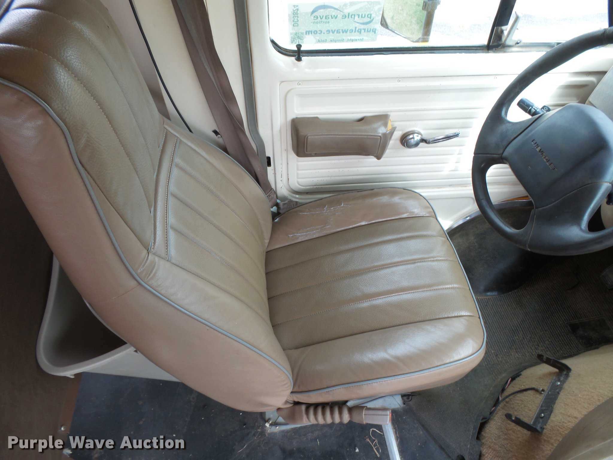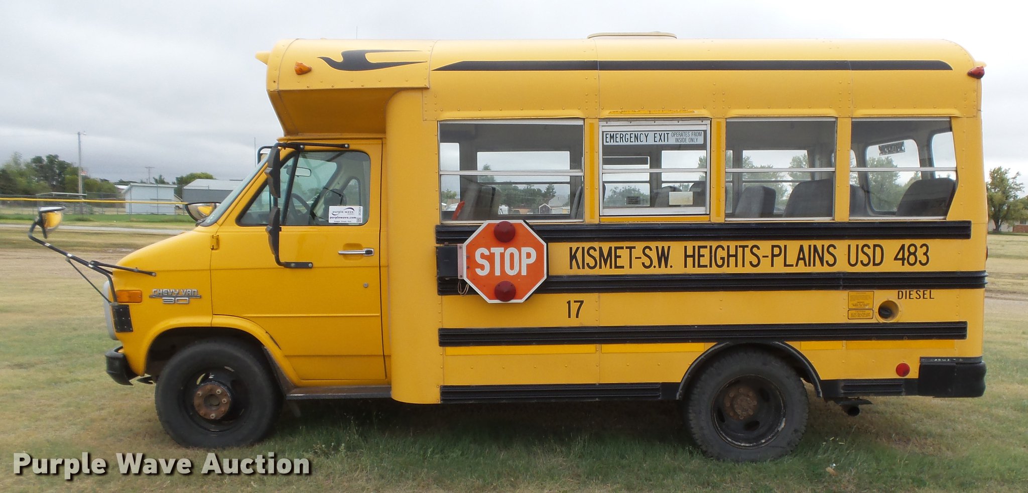 Purple Wave is selling a used Bus in Kansas. This item is a 1996 Chevrolet G30 school bus with the following: 113,138 miles on odometer, 6.5L V8 OHV 16V disel engine, Automatic transmission, Model M77513, Single axle, Heat, AM/FM, Suspension seat, 19 passenger capacity, Seat belts, Ceiling, rear, and side emergency exits, Emergency door alarms, Lighted stop sign, Block heater, Front tow hooks, Spring suspension, Hydraulic brakes, LT225/75R16 tires, GVWR 10,000 lbs, Serial 373164