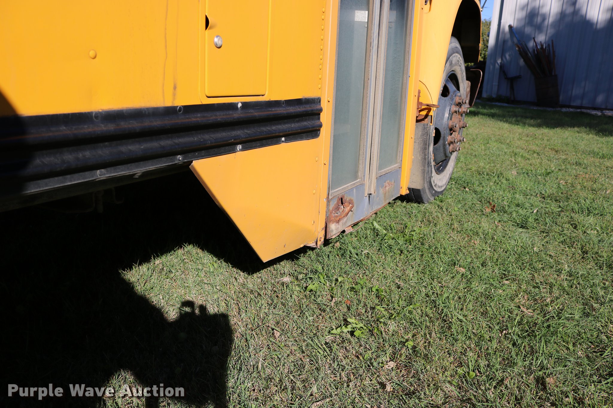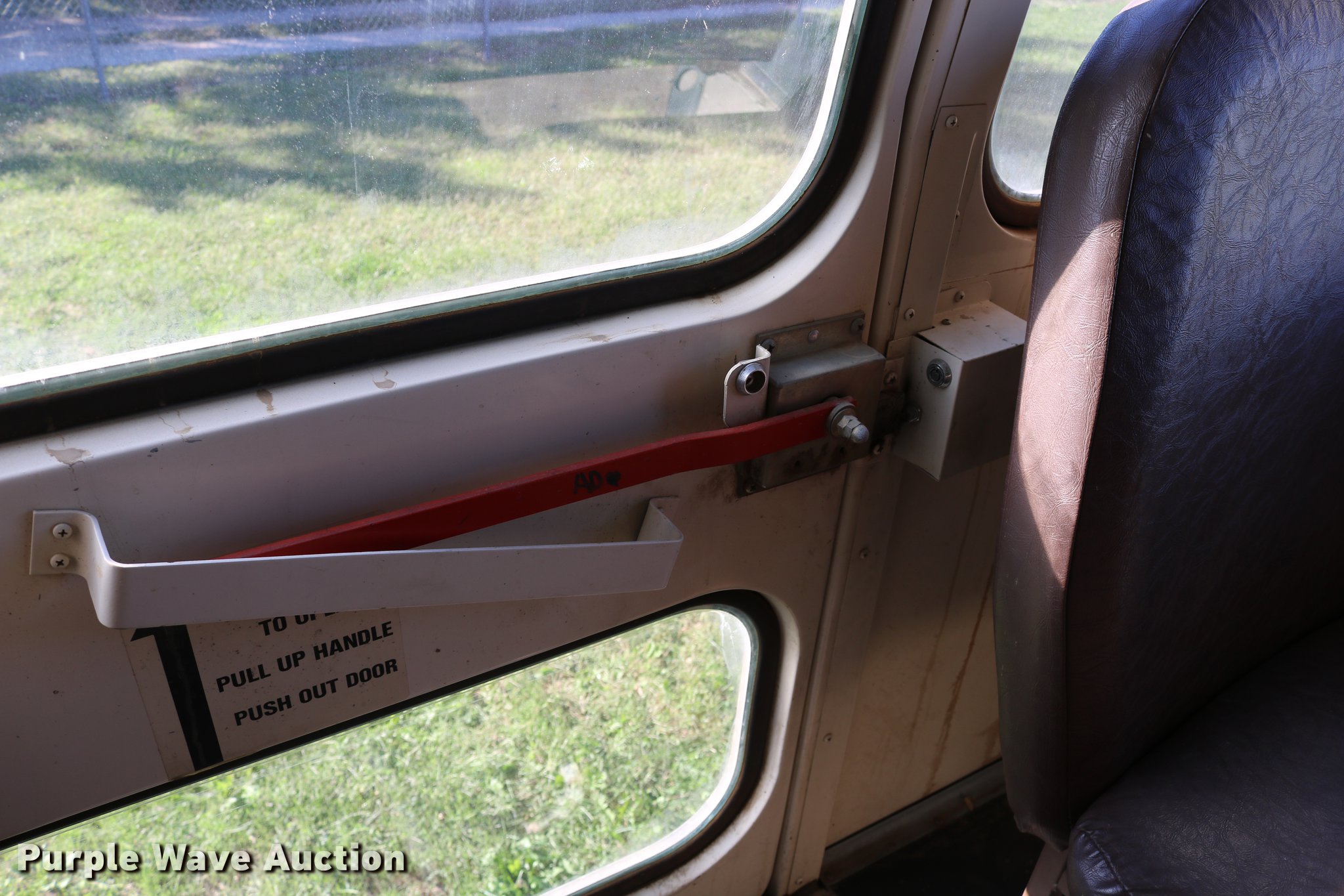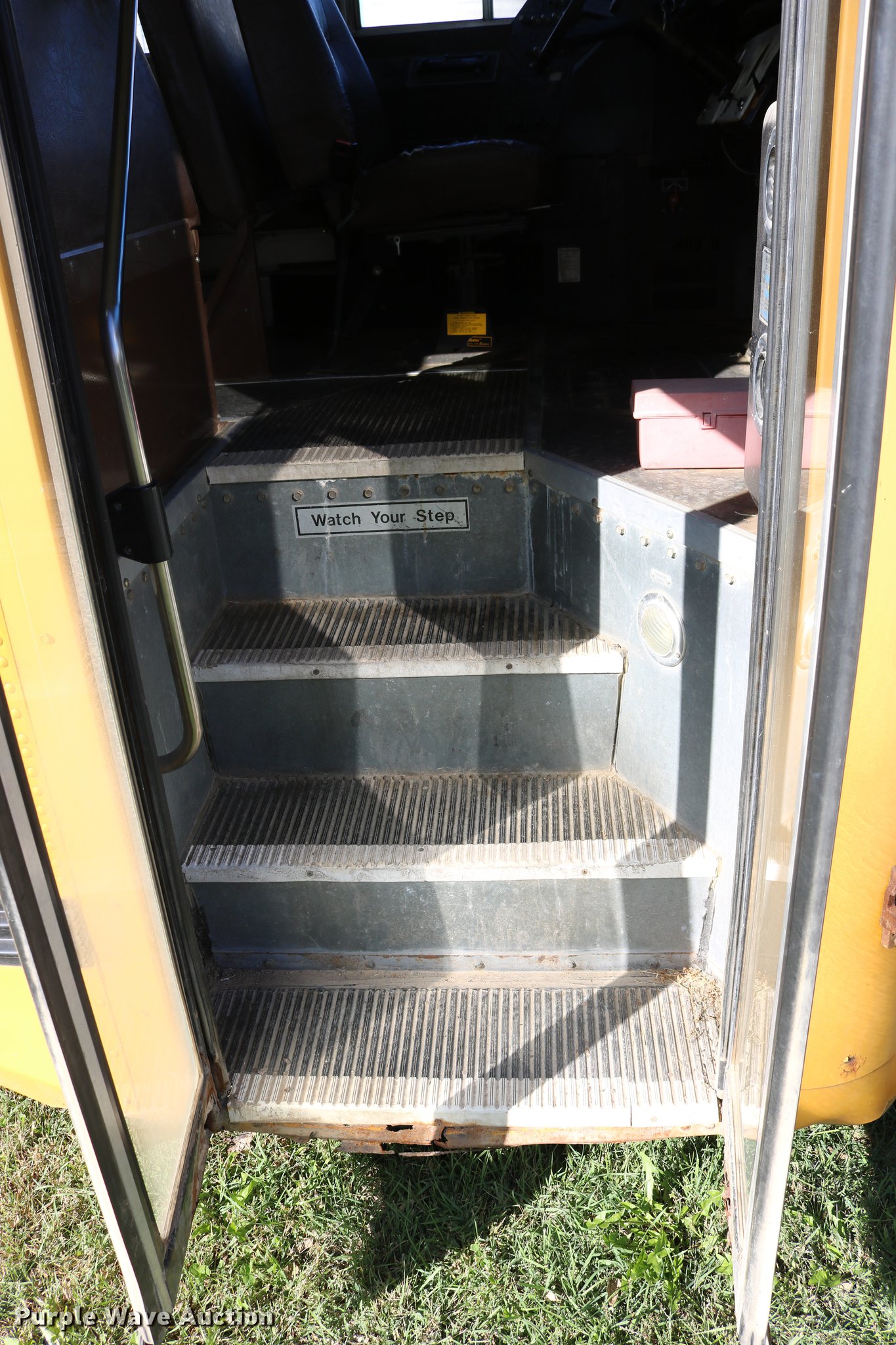 Purple Wave is selling a used Bus in Kansas. This item is a 1998 Ford B800 bus with the following: 199,382 miles on odometer, 5.9L L6 turbo diesel engine, Automatic transmission, Single axle, Heat, AM/FM/cassette, Heated mirrors, 47 passenger capacity, Ceiling, rear, and side emergency exits, Emergency door alarms, Lighted stop sign, Front and rear tow hooks, Block heater, Approximately 194" wheelbase, Spring suspension, Hydraulic brakes, Goodyear 10R22.5 tires, GVWR 26,000 lbs, Tachometer inoperable, Batteries weak