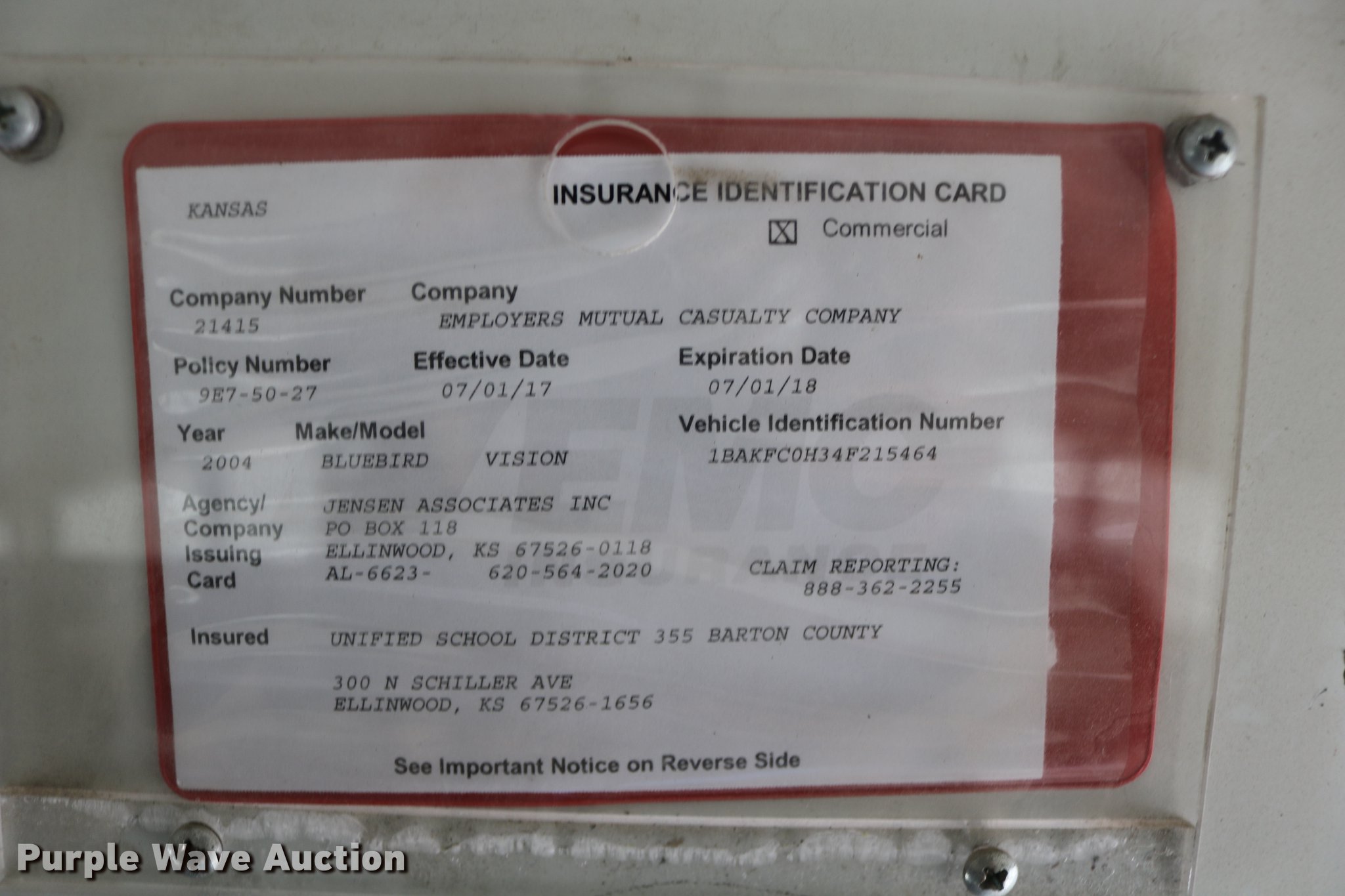 2004 Blue Bird Vision school bus. 161,418 miles on odometer, 8,210 hours on meter, Caterpillar 3126 7.2L L6 turbo diesel engine Serial HEP35858, Automatic transmission, Single axle, Heat, Cruise, AM/FM/CD, Heated mirrors, 65 passenger capacity, (65) adult seats, Seat belts, Ceiling, rear, and side emergency exits, Emergency doors alarms, Beacon light, Lighted stop sign, Backup alarm, Block heater, Underside luggage storage, Spring suspension, Hydraulic brakes, Approx. 252" wheelbase, 10R22.5 tires, Unit# 5. Kansas title. 1BAKFC0H34F215464. Ellinwood Public Schools USD 355. 901 E Santa Fe Ave. Ellinwood, KS 67526