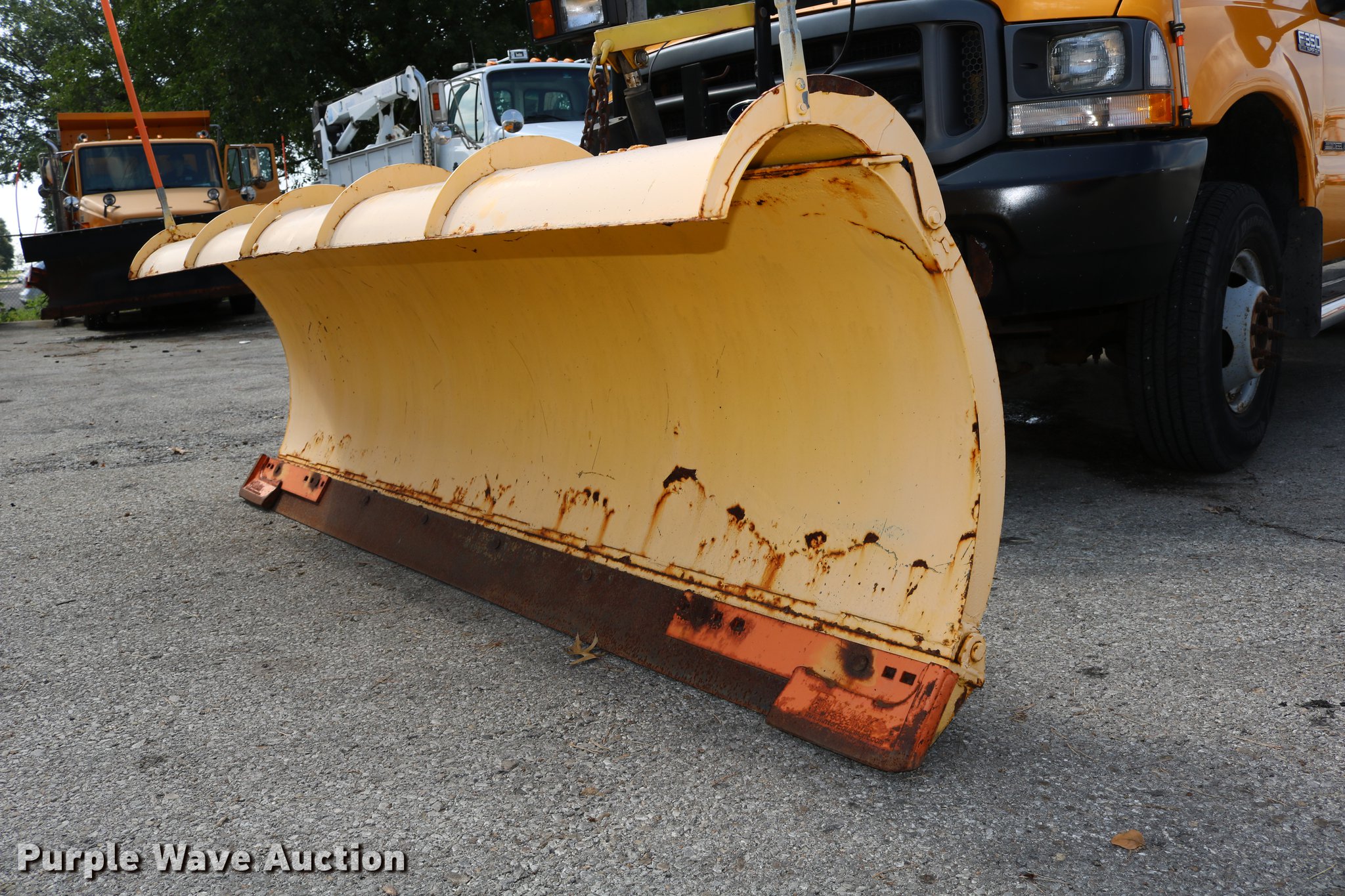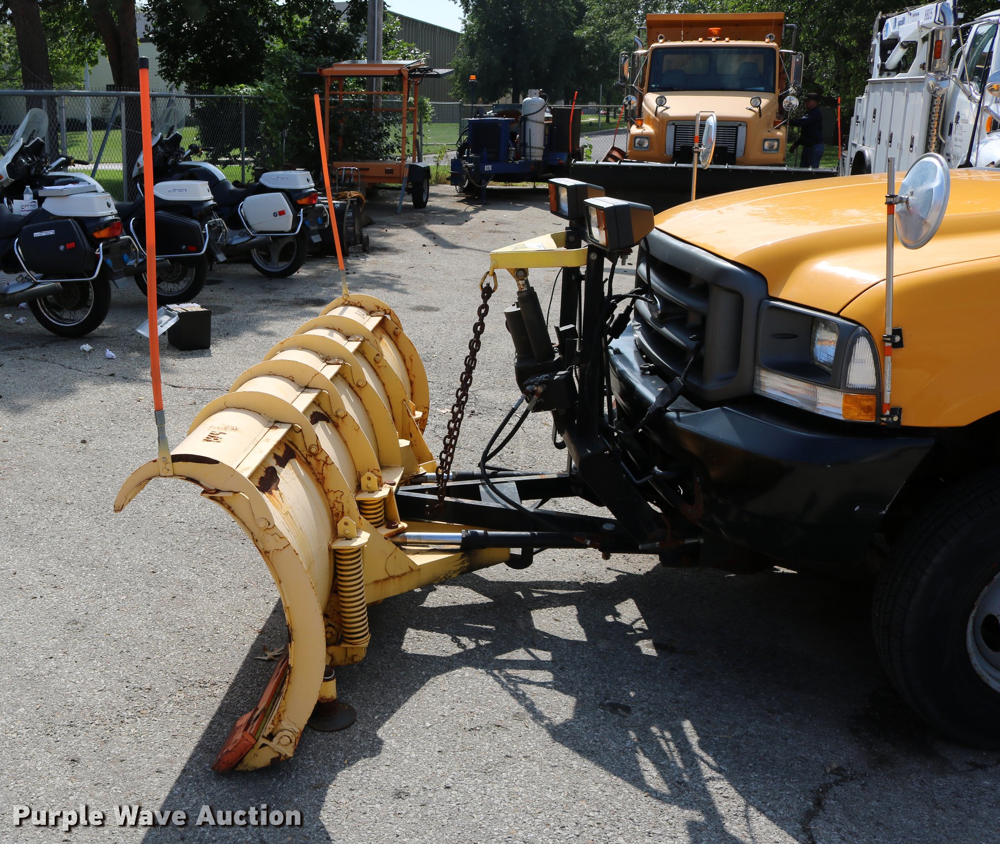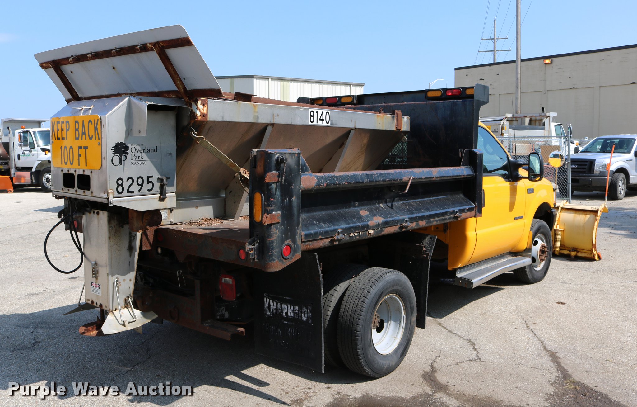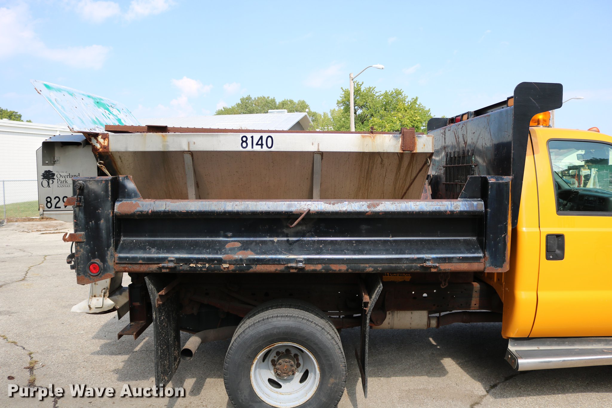 2002 Ford F350 Super Duty dump bed pickup truck. 64,735 miles on odometer, 7.3L V8 OHV 16V turbo diesel engine, Automatic transmission, Four wheel drive, AC and heat, AM/FM/cassette, Brake controller, Heil steel dump bed 9'L x 95 1/4"W, 14" side height, D-ring tie downs, Electric over hydraulic dump, Single ram hoist, Manual end gate, Minute Mount plow 8'W, 2" bolt-on extension, Air-Flo PSV-8E-SS spreader Serial 16462, Unit# 025348, Single fuel tank, Pintle hitch, Trailer wiring, Spring suspension, Hydraulic brakes, 141" wheelbase, 235/85R16 tires, GVWR 12,500 lbs, FAWR 5,200 lbs, RAWR 9,750 lbs, Unit# 8140. Kansas title. Seller is a government entity who will be assigning and distributing the title. Please contact the seller for distribution questions. 1FDWF37FX2EC15231. City of Overland Park. 11300 W 91st St. Overland Park, KS 66214