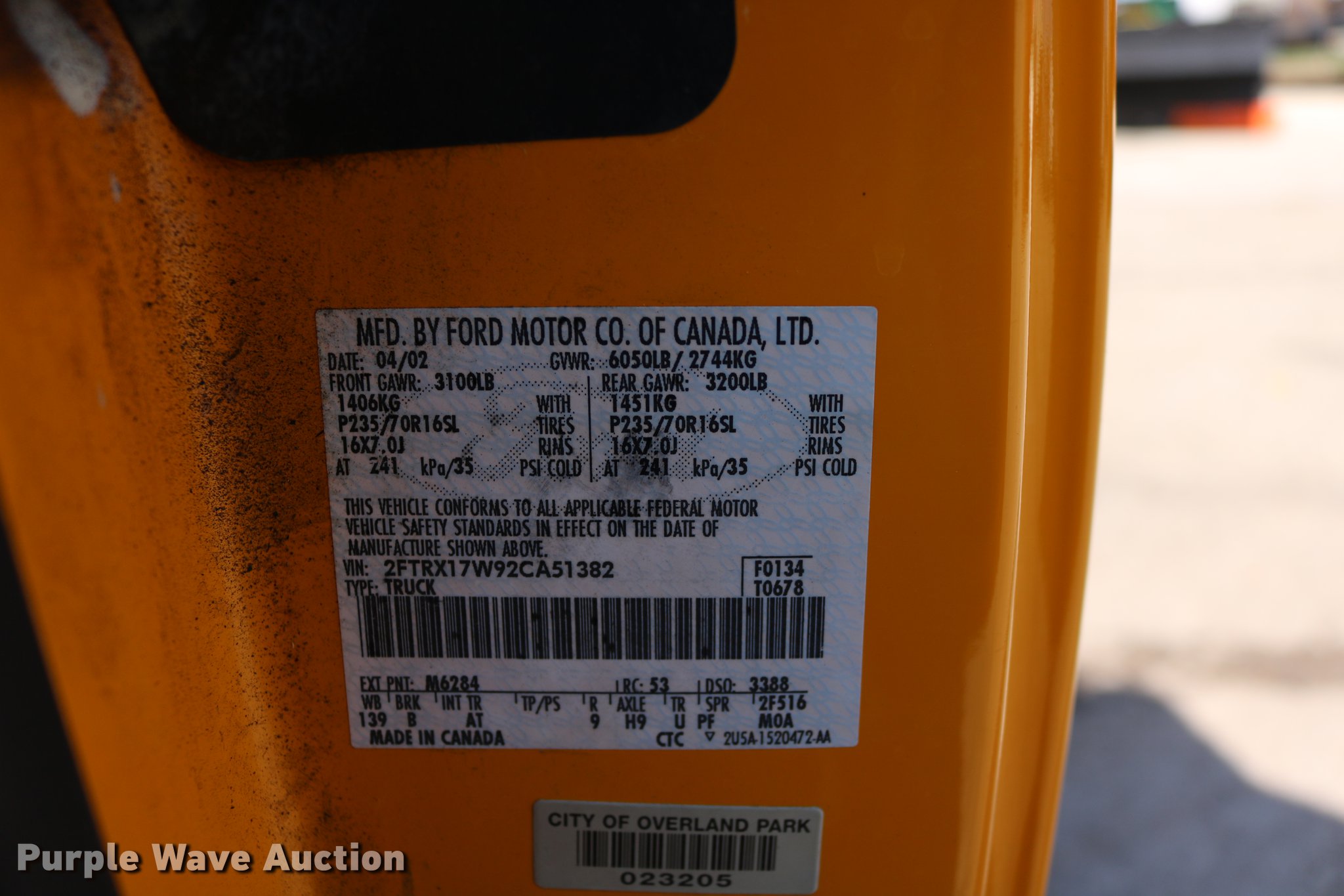 2002 Ford F150 SuperCab pickup truck. 129,832 miles on odometer, 4.6L V8 SOHC 16V gas engine, Automatic transmission, AC and heat, Tilt, AM/FM/cassette, Power windows, Vinyl interior, Star Bar light bar, Toolbox, Receiver hitch, 235/70R16 tires. Kansas title. Seller is a government entity who will be assigning and distributing the title. Please contact the seller for distribution questions. 2FTRX17W92CA51382. City of Overland Park. 11300 W 91st St. Overland Park, KS 66214